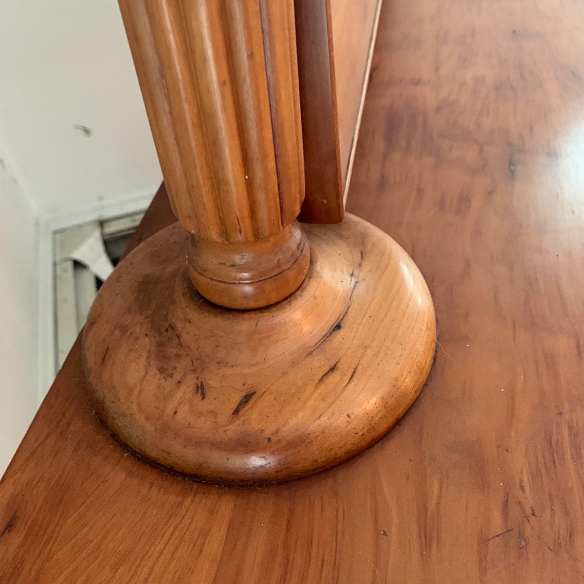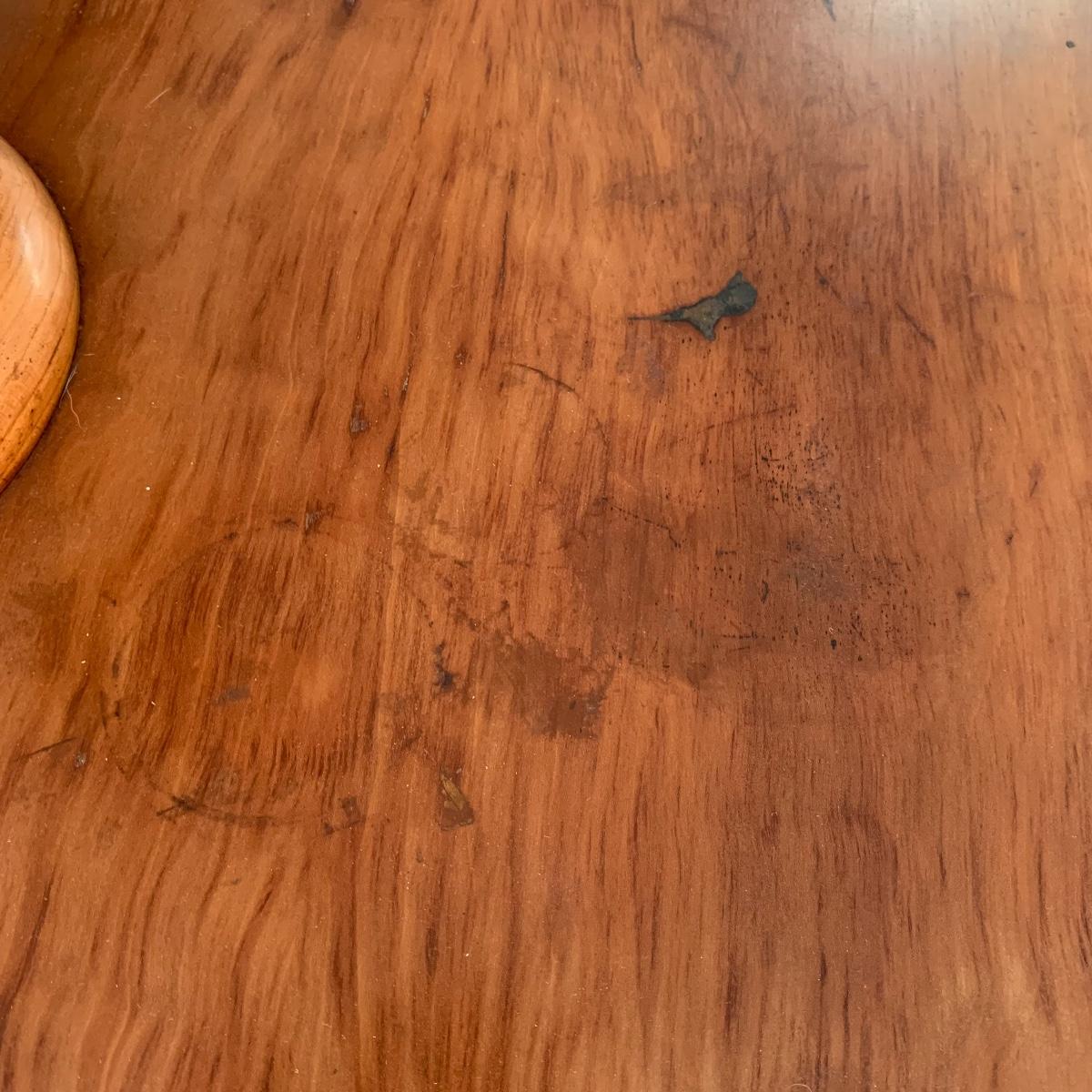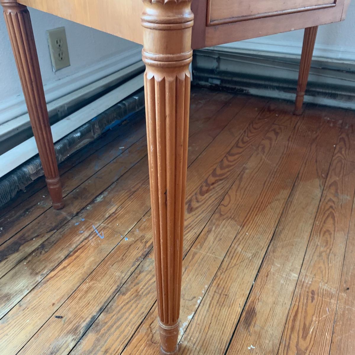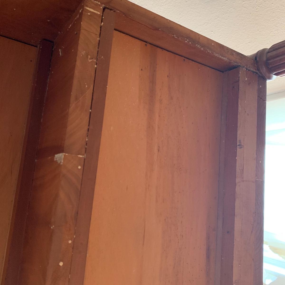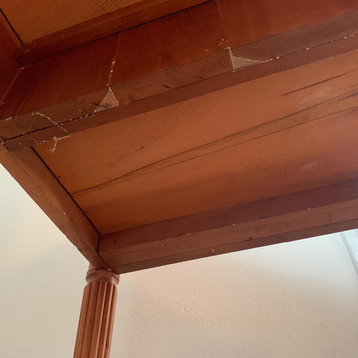 This lot includes a wooden dressing table with an attached mirror and a matching upholstered bench. The table has five dovetailed drawers and long carved legs. This detail matches the mirror base and the legs on the bench. The table measures 45” x 24.5” x 32.5”. The mirror measures 27” x 31”. Including the mirror, the whole unit is 65” tall. The mirror has cardboard backing. There are some marks on the surface of the table and a bit of mildew in the drawers. The bench measures 22.5” x 14.5” x 19.5”. Local pickup only. Please note that the winning bidder will need to move the items in this lot from the second floor of the house.
