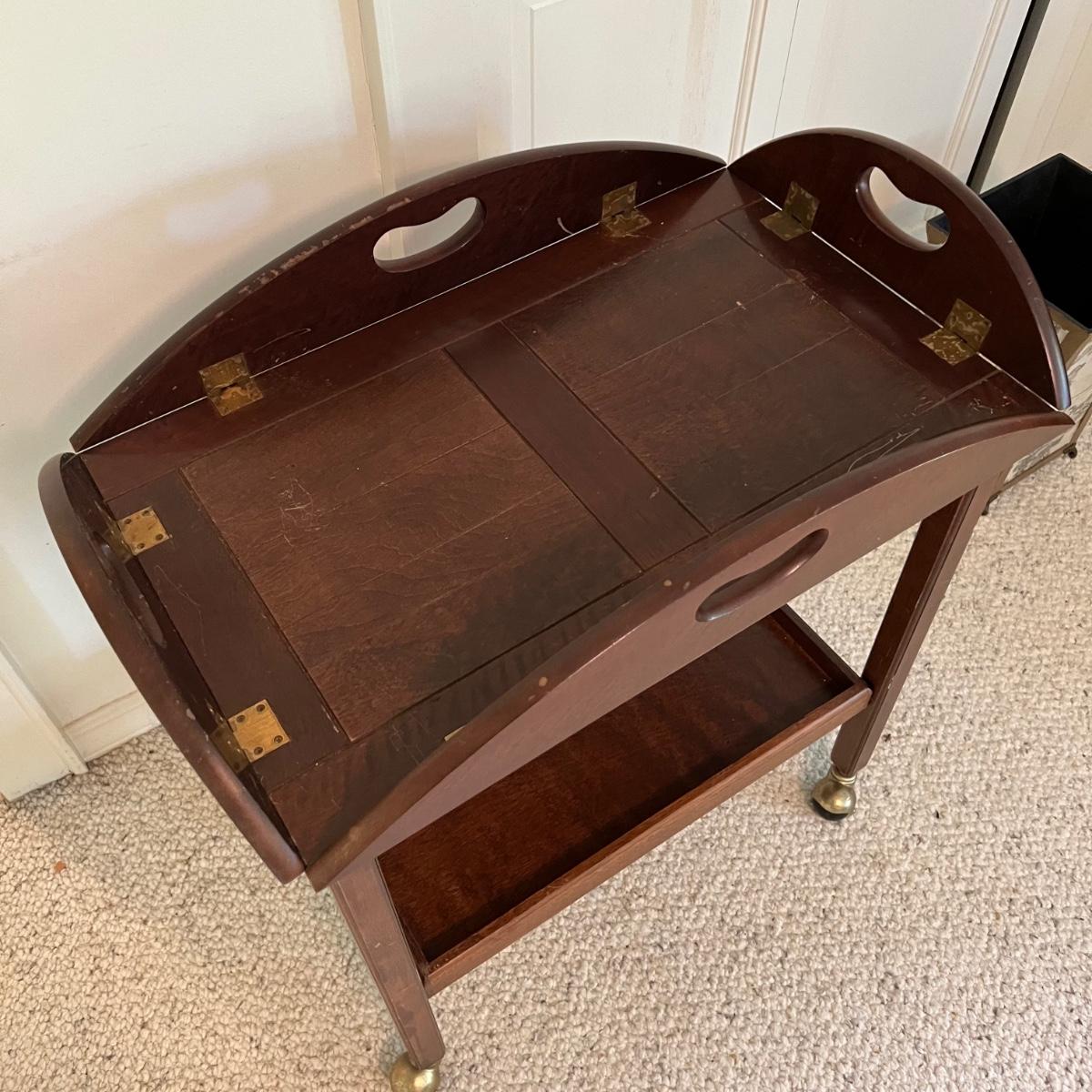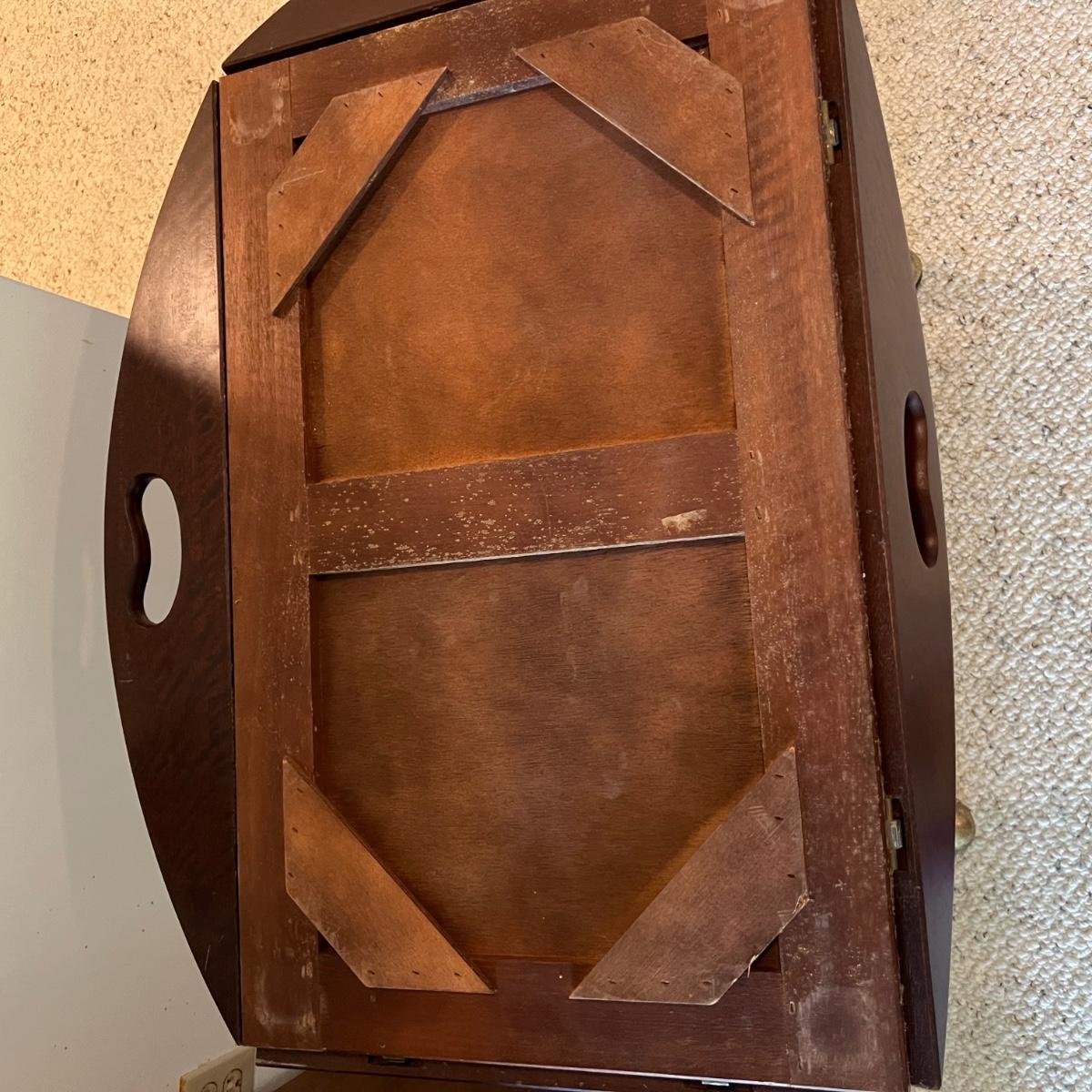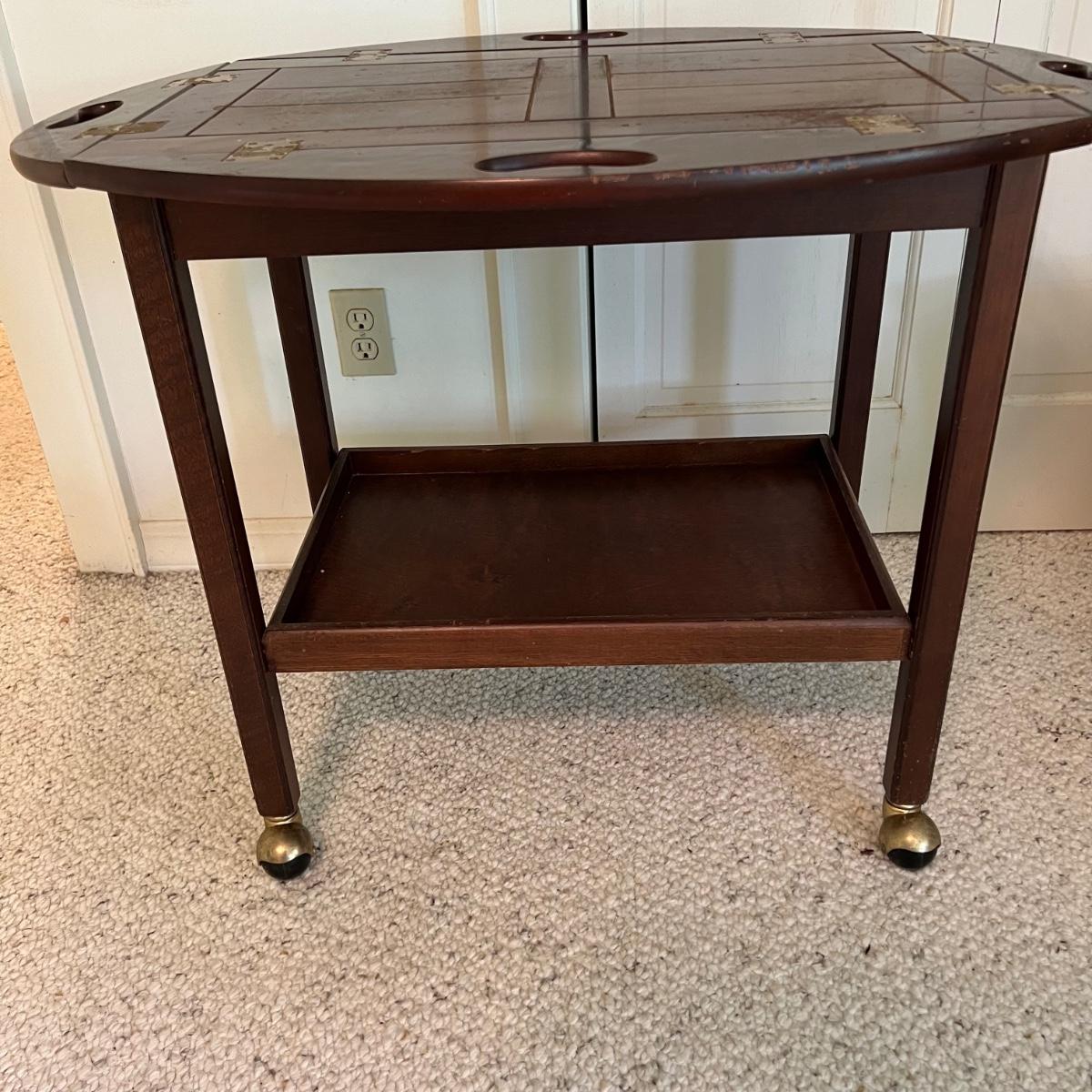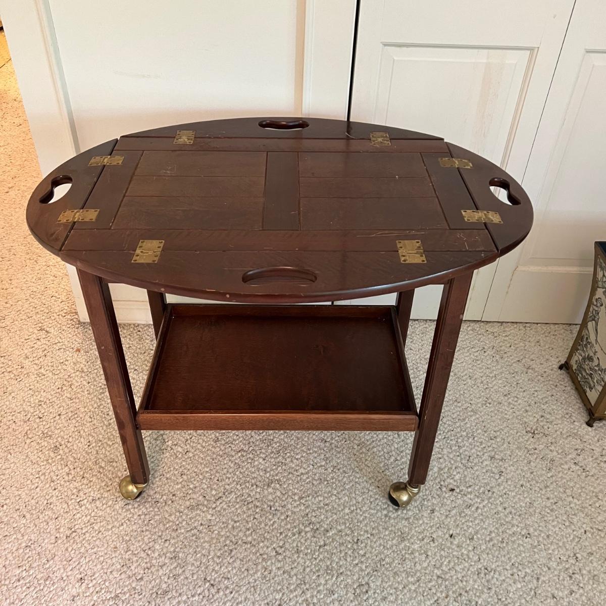 Wooden drink cart. The top comes away from the cart itself and can serve as a tray. The piece measures 35” x 25” x 27”H. The cart is on wheels and has brass-like hardware. Note wear and scratches to wood surface.