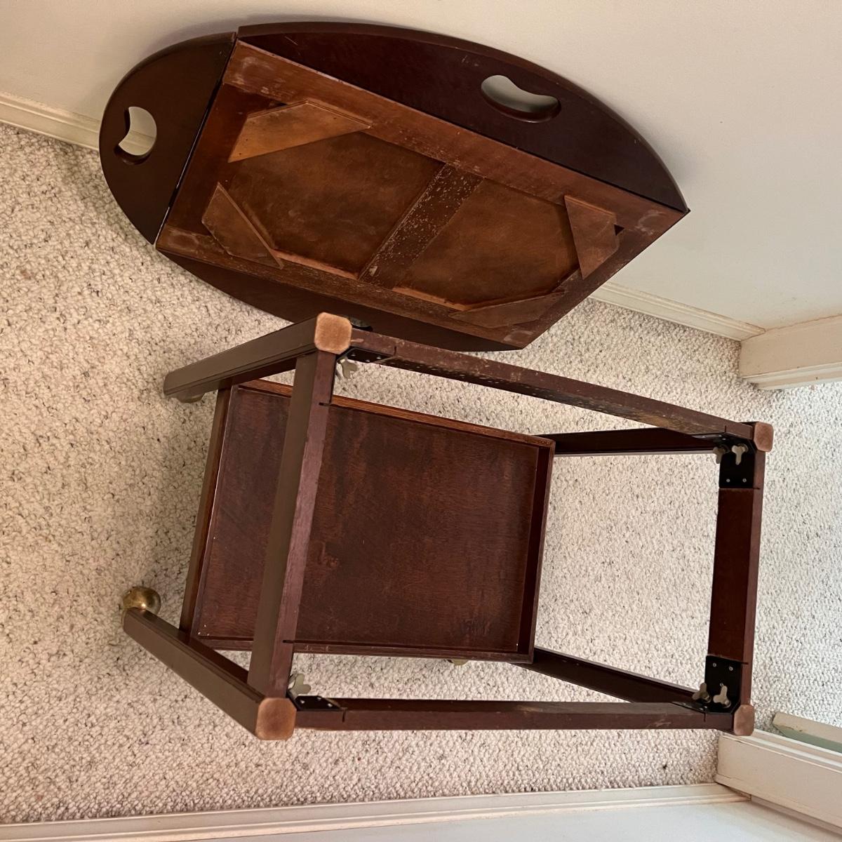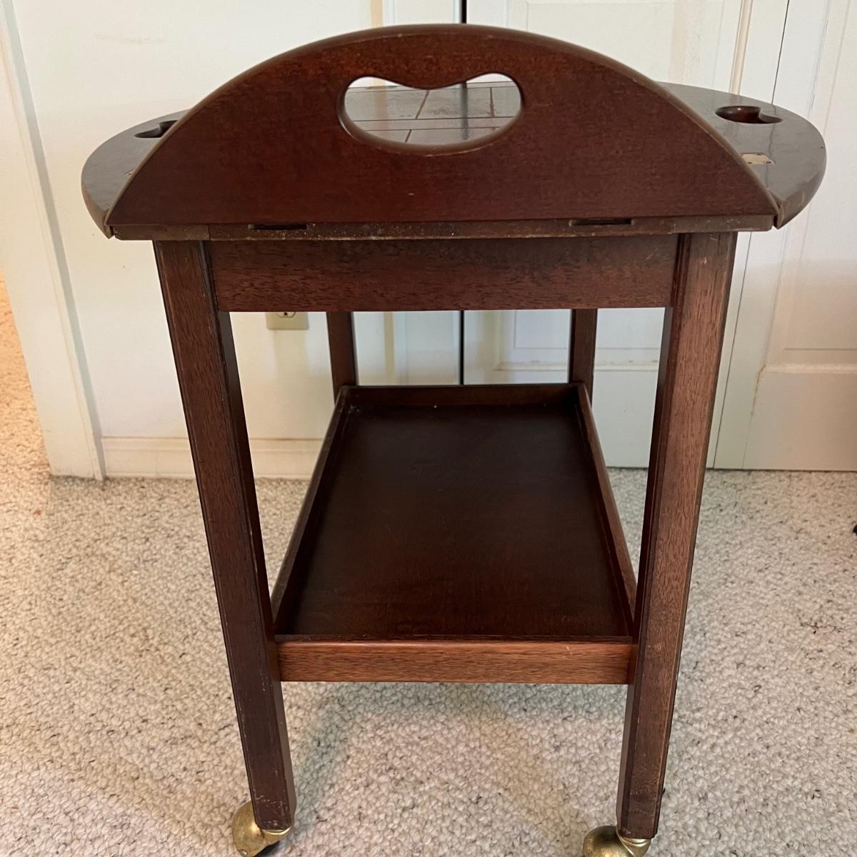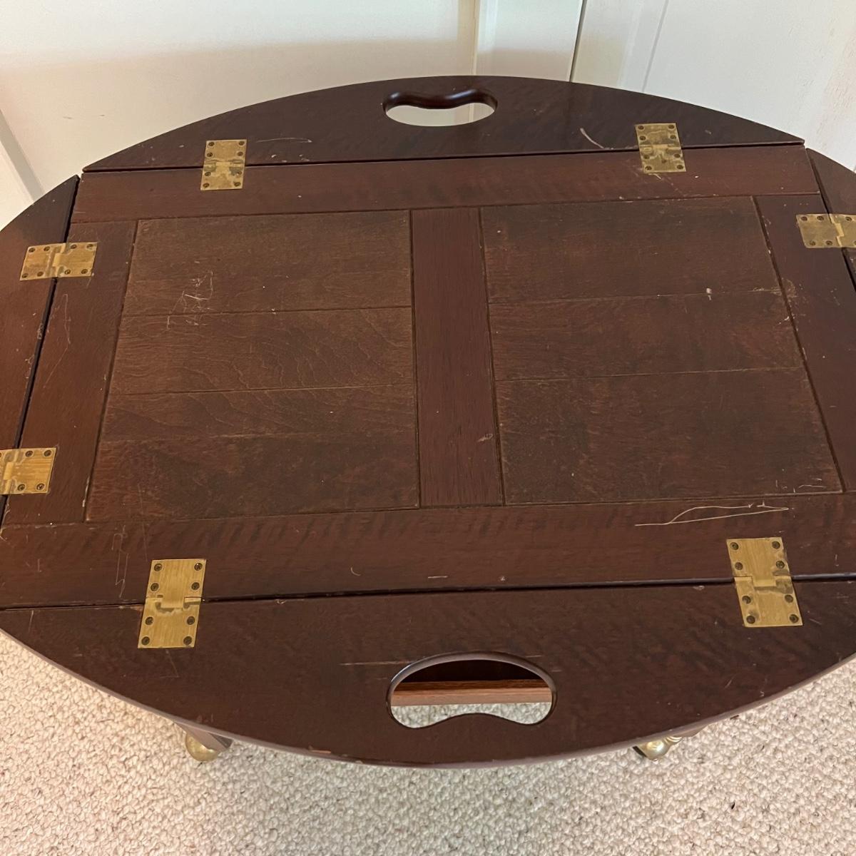 Wooden drink cart. The top comes away from the cart itself and can serve as a tray. The piece measures 35” x 25” x 27”H. The cart is on wheels and has brass-like hardware. Note wear and scratches to wood surface.
