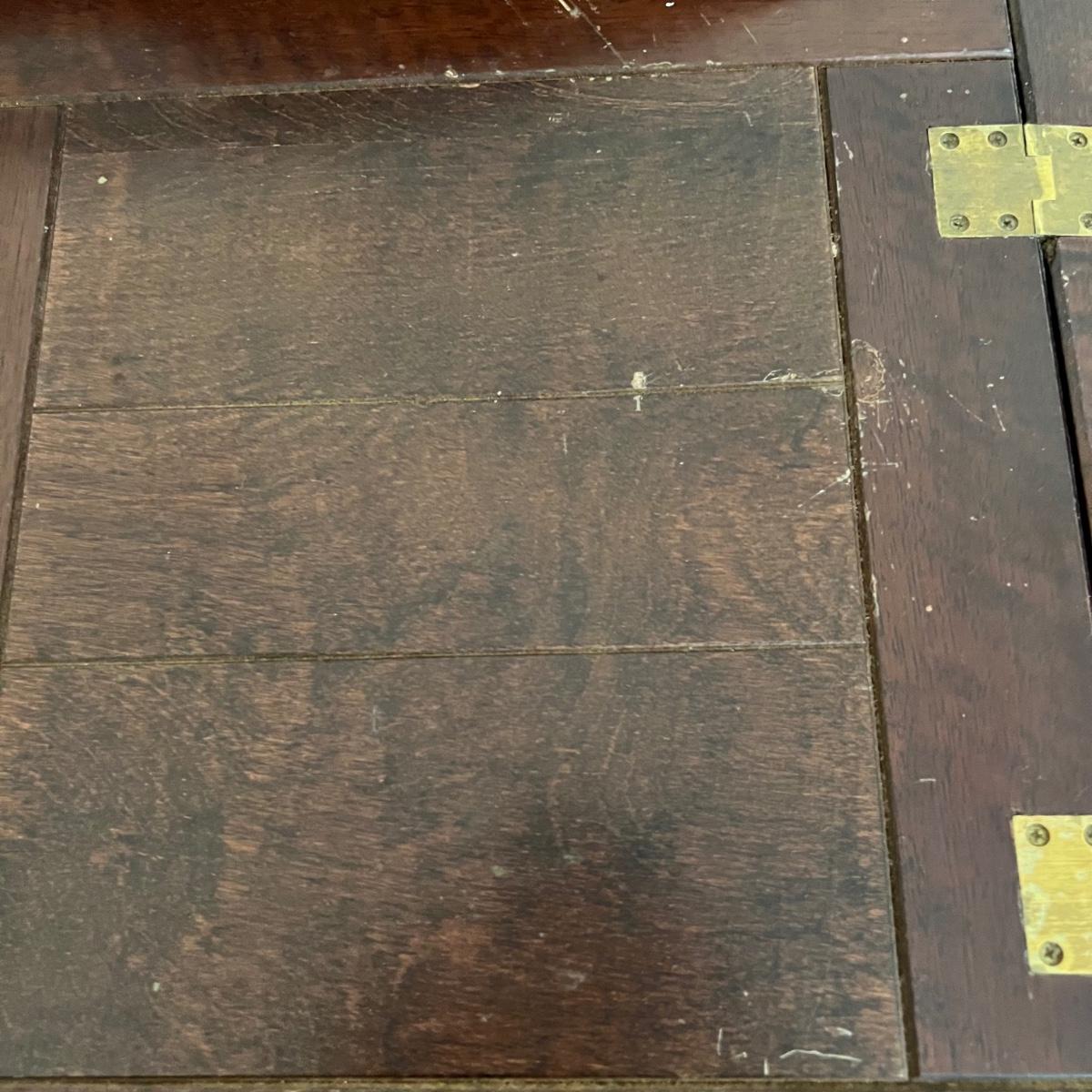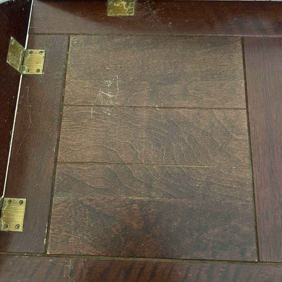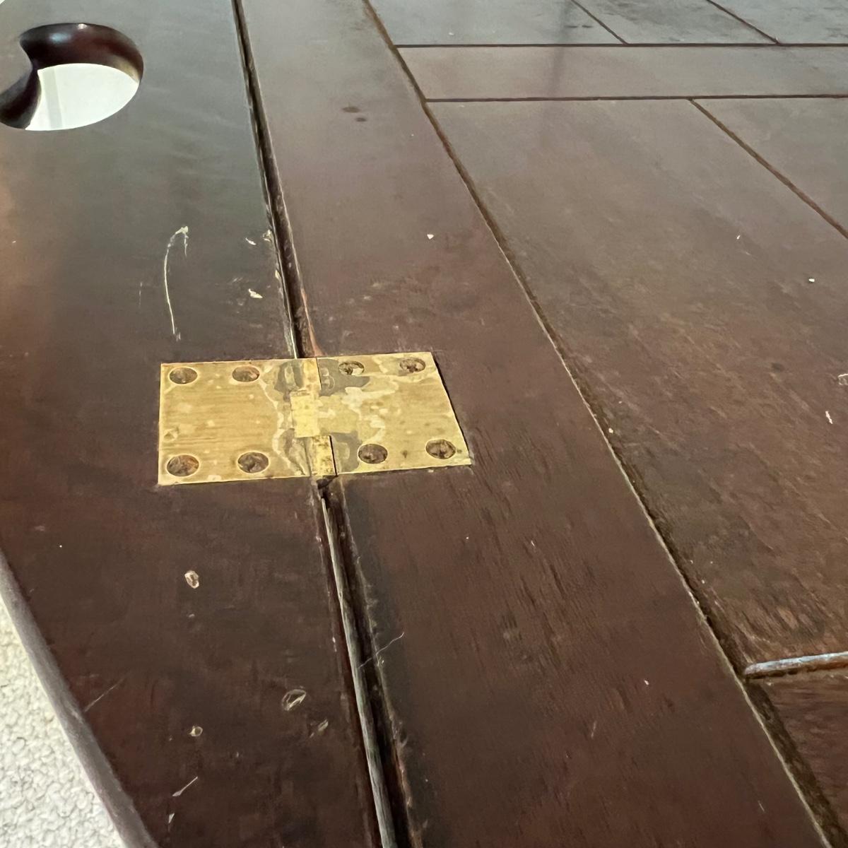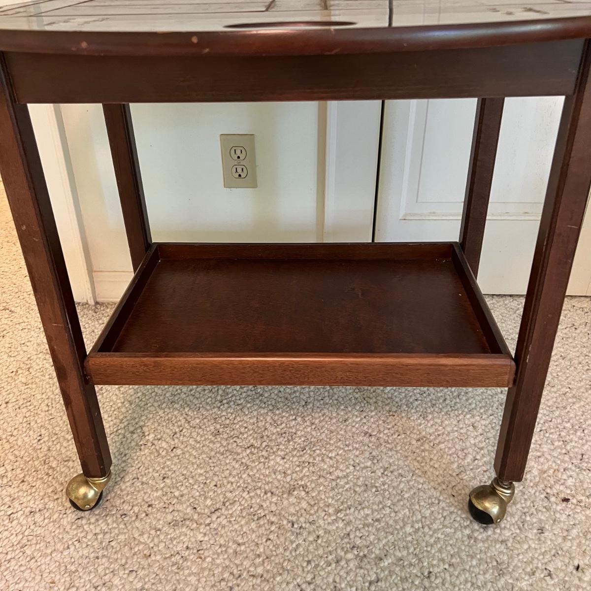 Wooden drink cart. The top comes away from the cart itself and can serve as a tray. The piece measures 35” x 25” x 27”H. The cart is on wheels and has brass-like hardware. Note wear and scratches to wood surface.