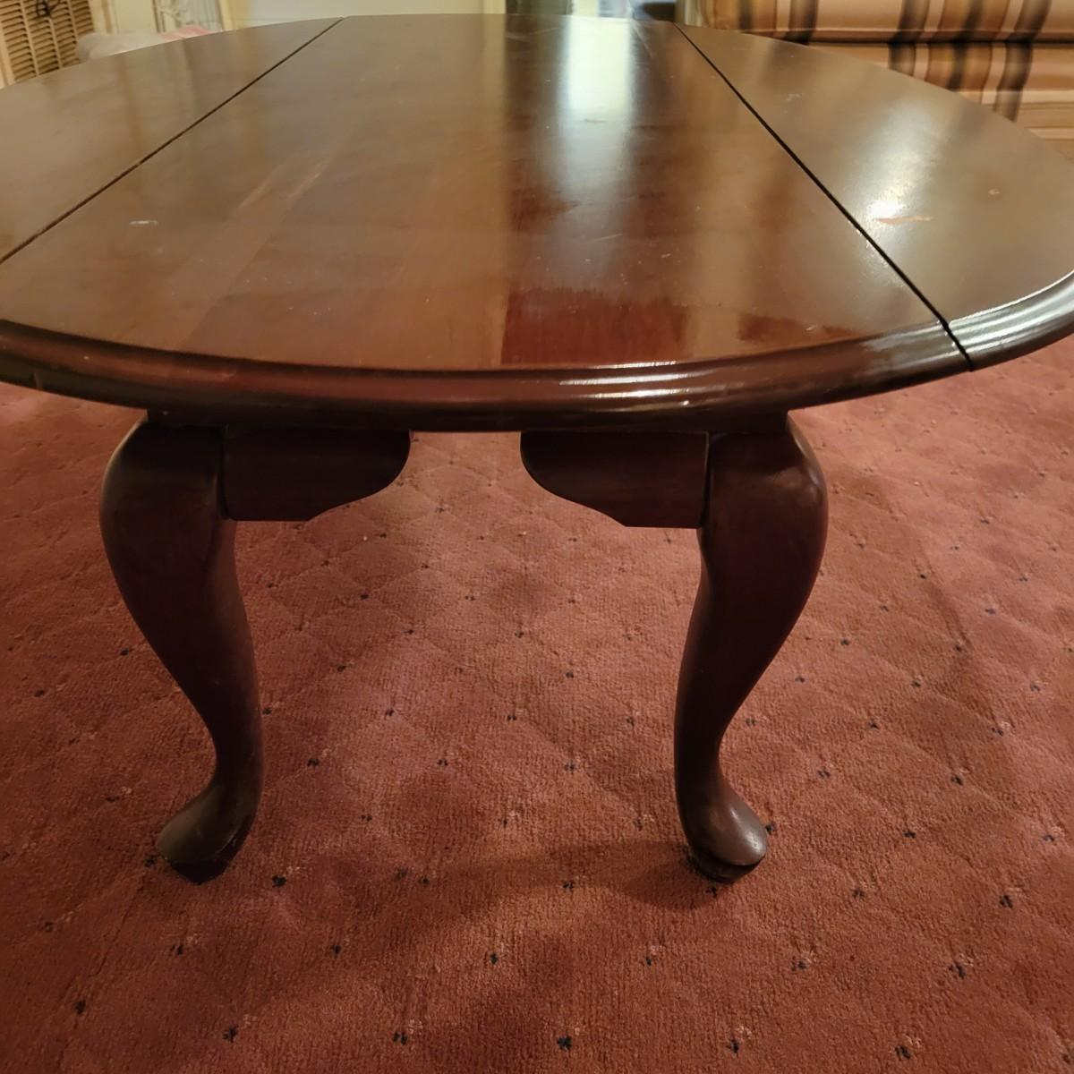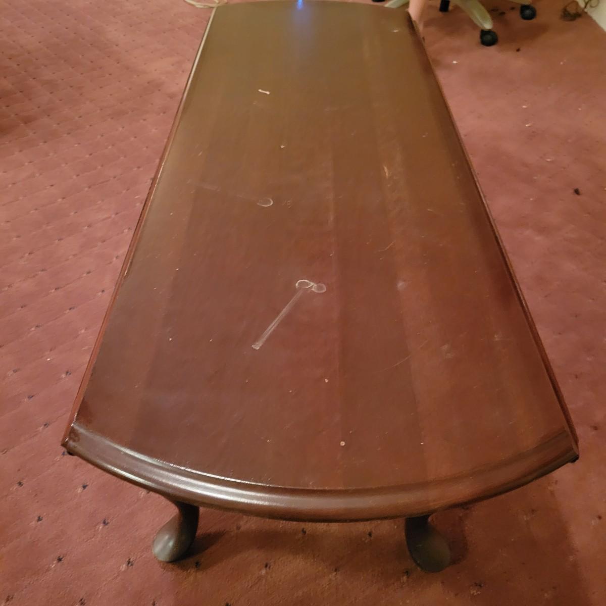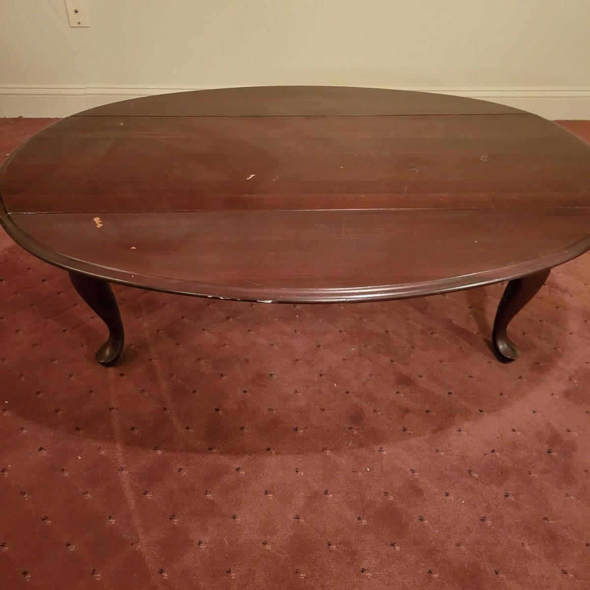 A wooden drop leaf coffee table in fair condition with notable blemishes in its surface. Table is a dark cherry stain and measures approximately 34.5" x 49" x 16.5" Local pickup only