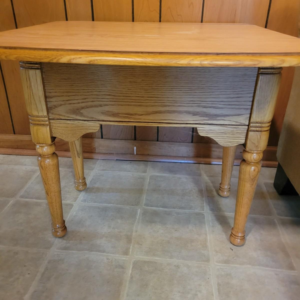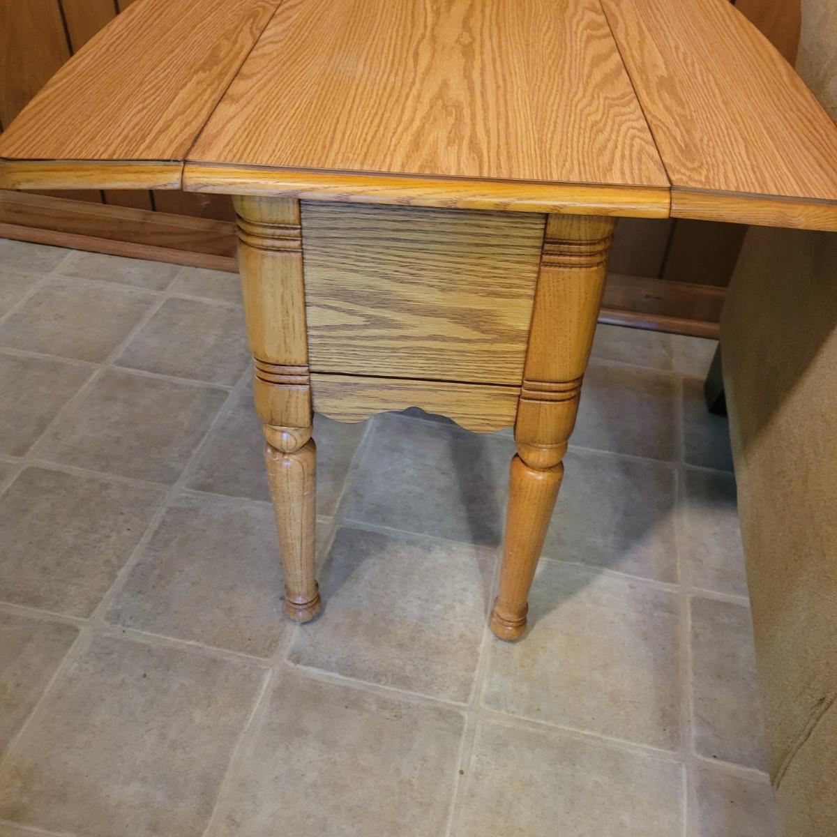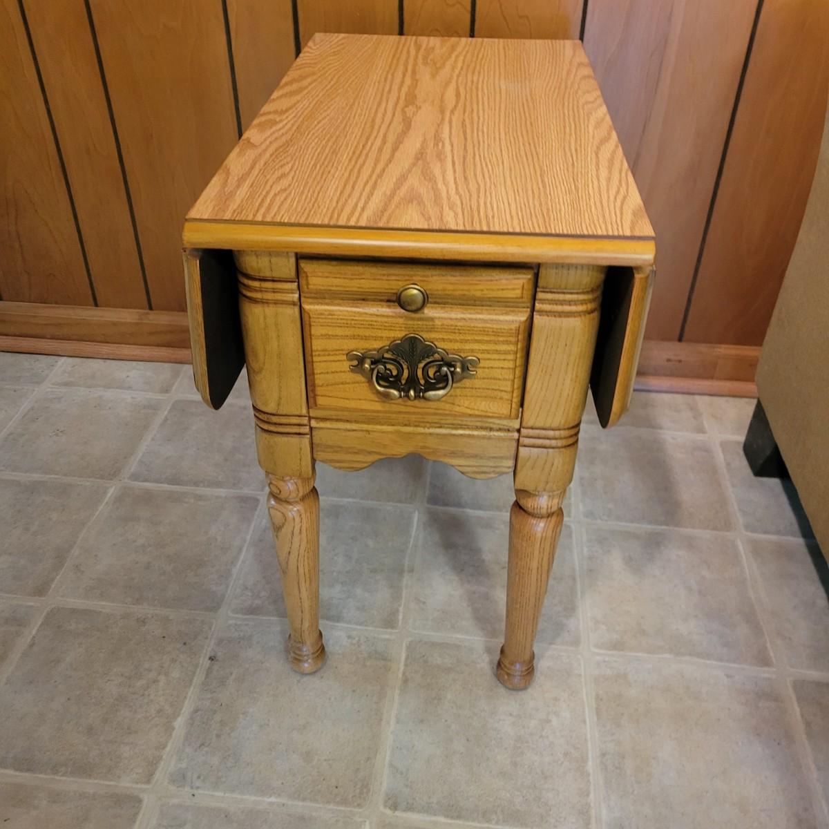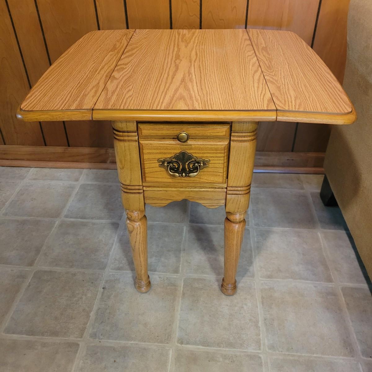 A wooden drop leaf side table in good condition with no notable damage. This table features an oak veneer that appearsto be formica,, brass hardware, and a single drawer. Measures approximately 28.5" x 25" x 23.5". Local pickup only.