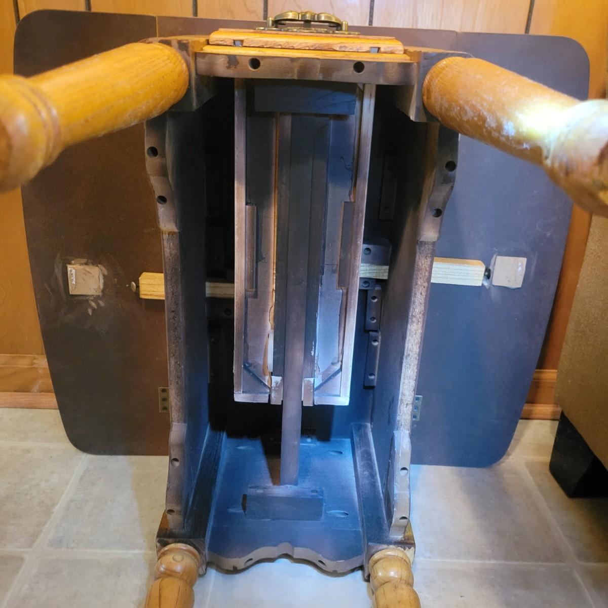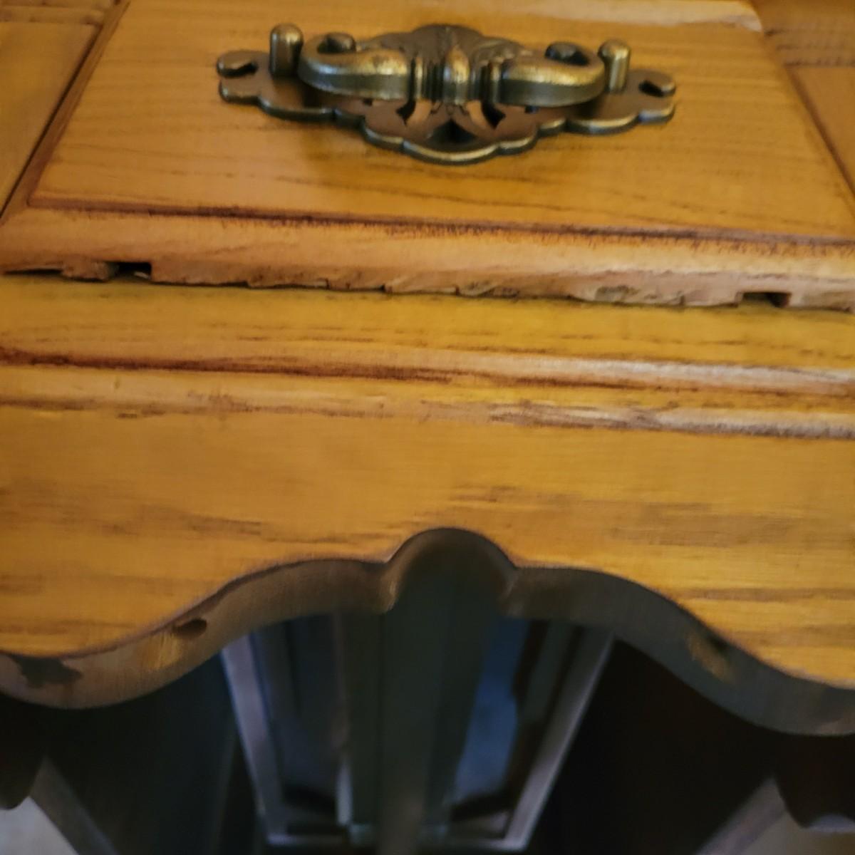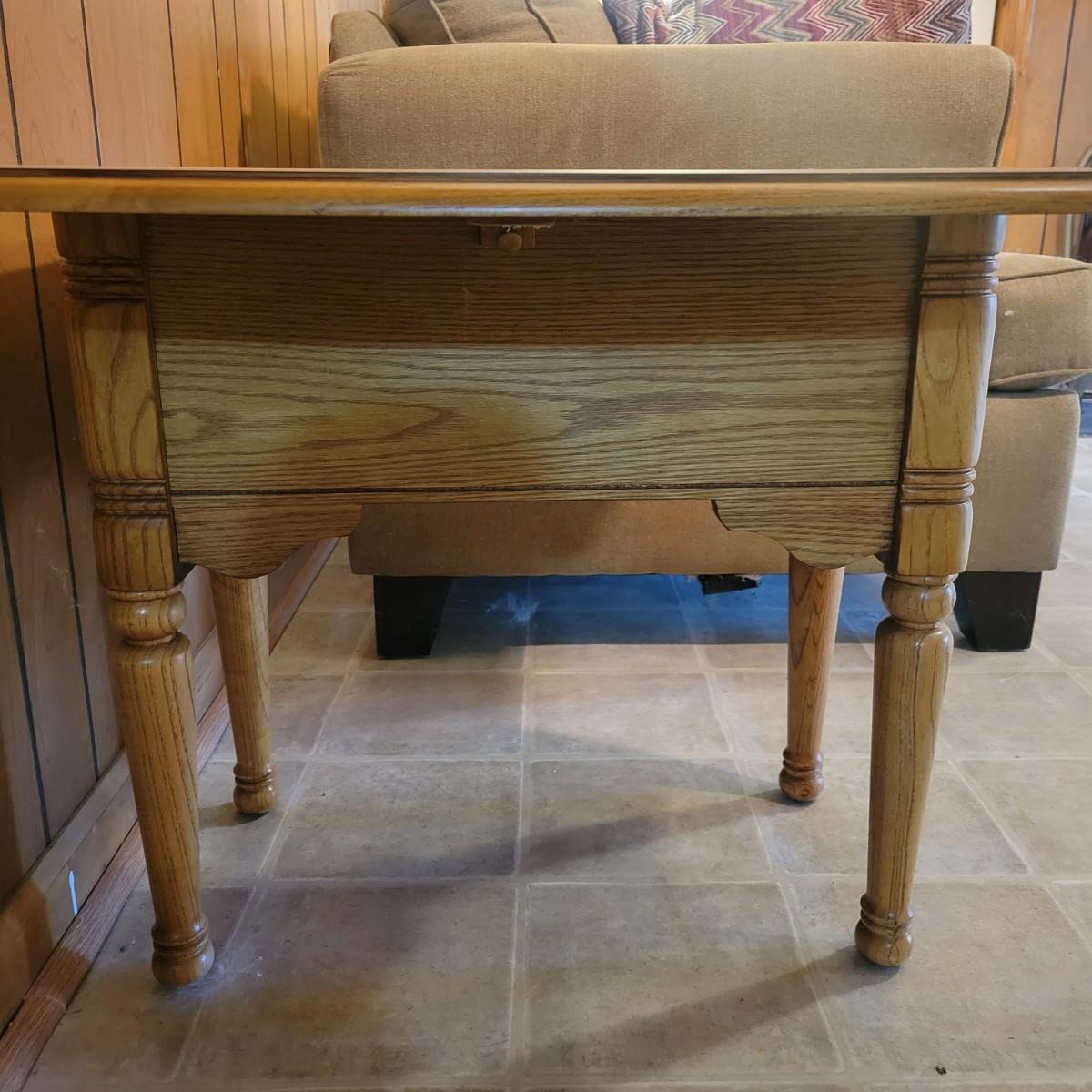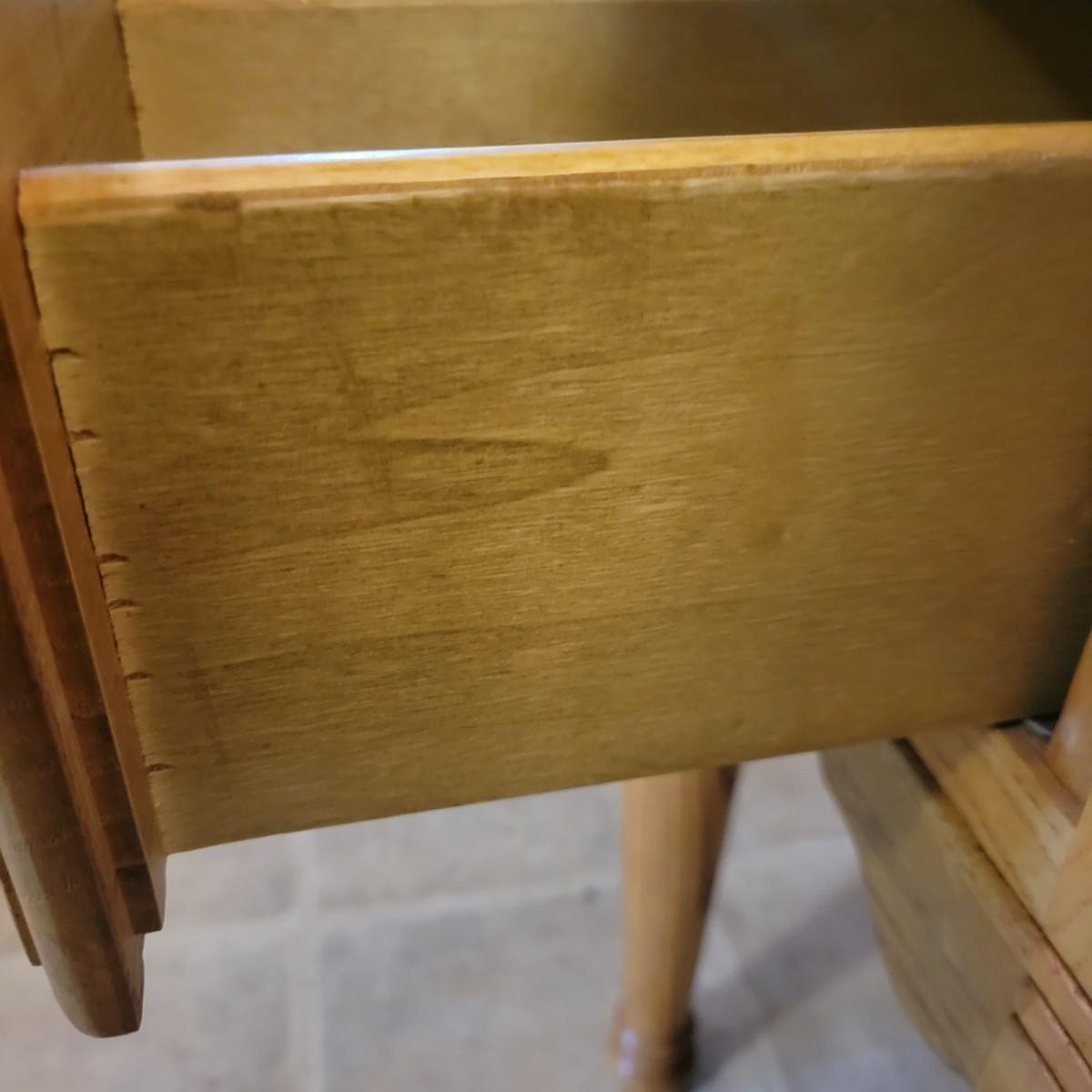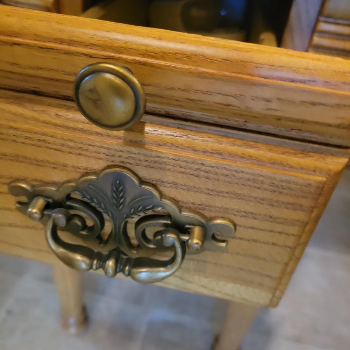 A wooden drop leaf side table in good condition with no notable damage. This table features an oak veneer that appearsto be formica,, brass hardware, and a single drawer. Measures approximately 28.5" x 25" x 23.5". Local pickup only.