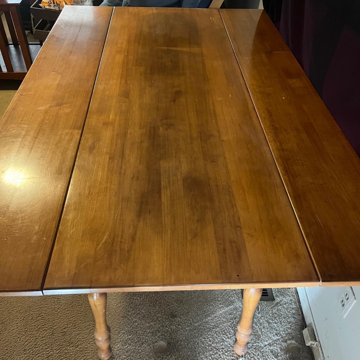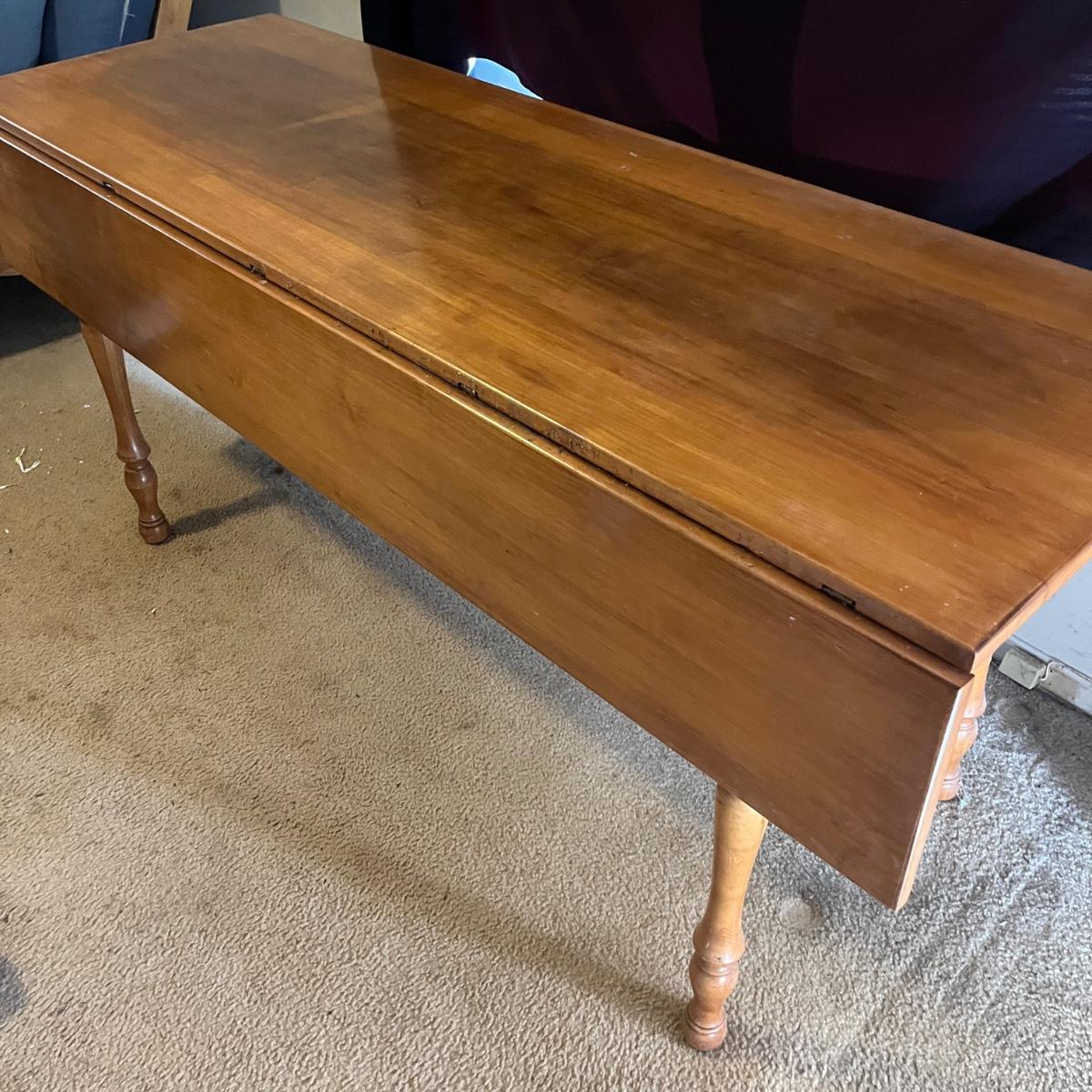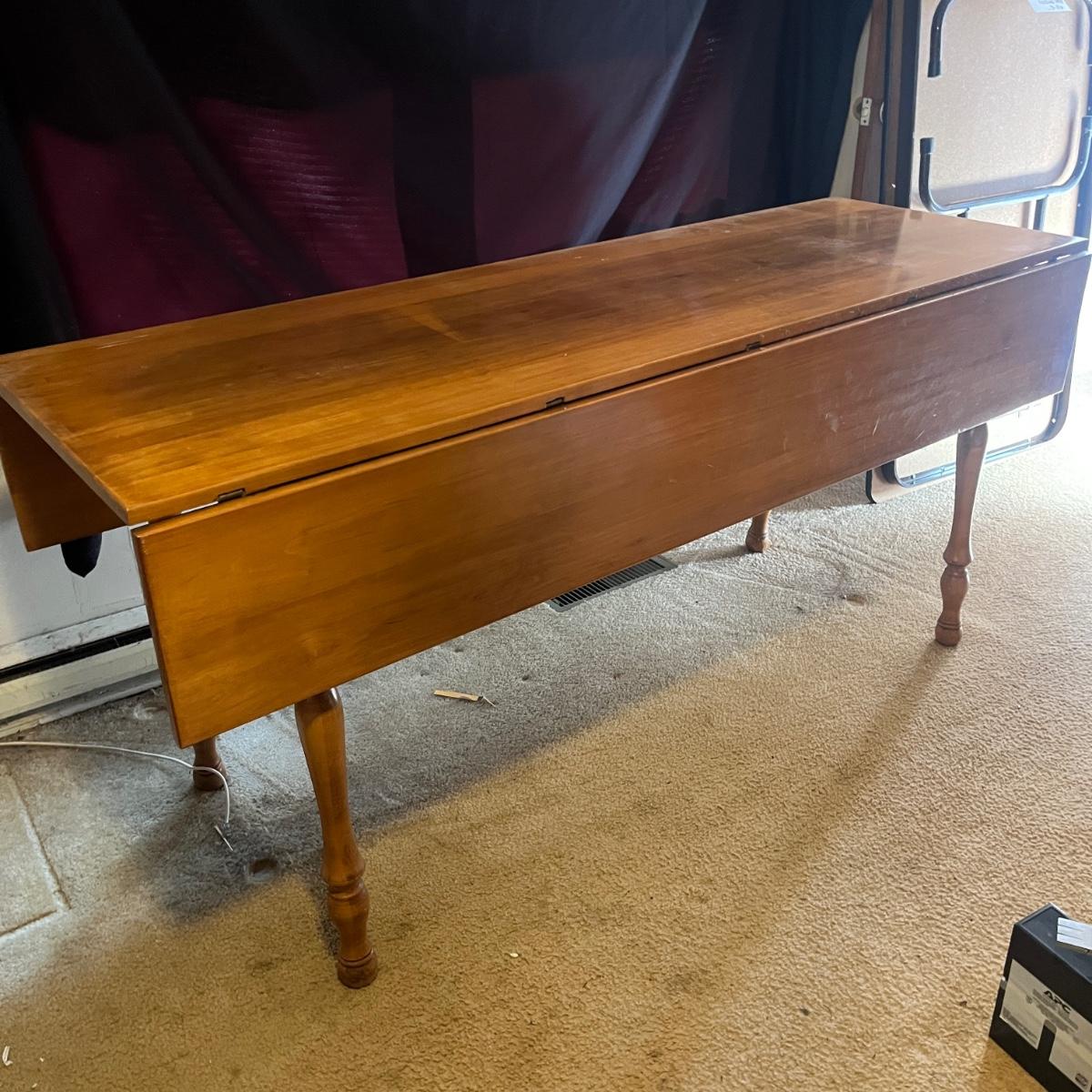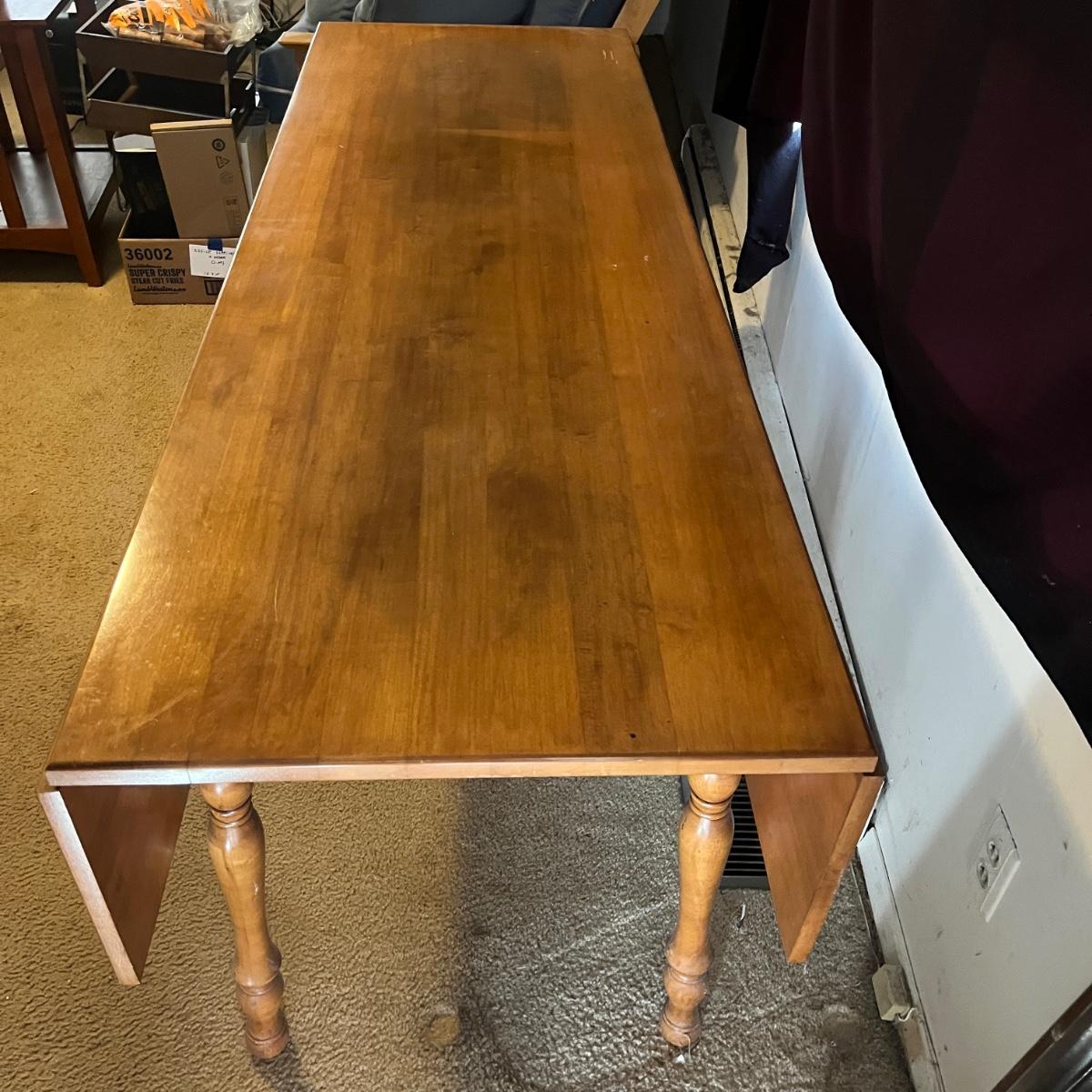 Lot includes a wooden drop leaf table that measures 66” x 23” x 30.5”H when leaves dropped and 66” x 42” x 30.5”H when leaves open.