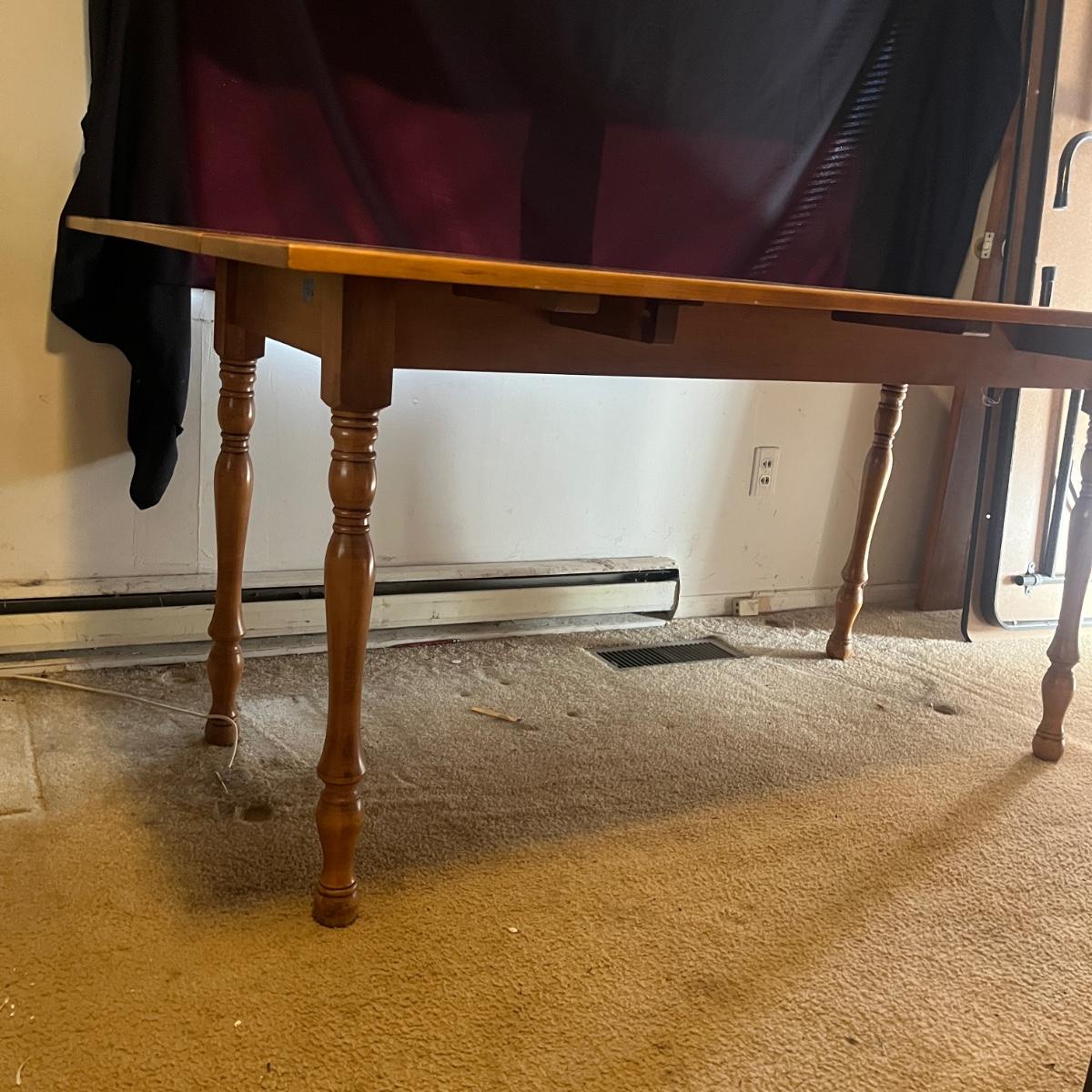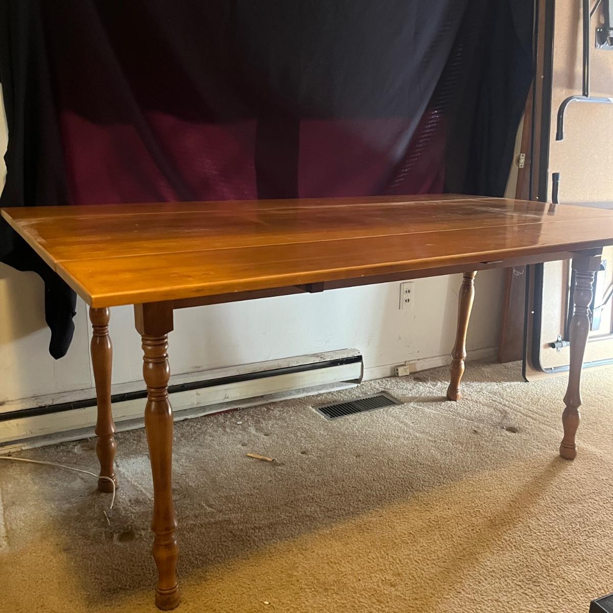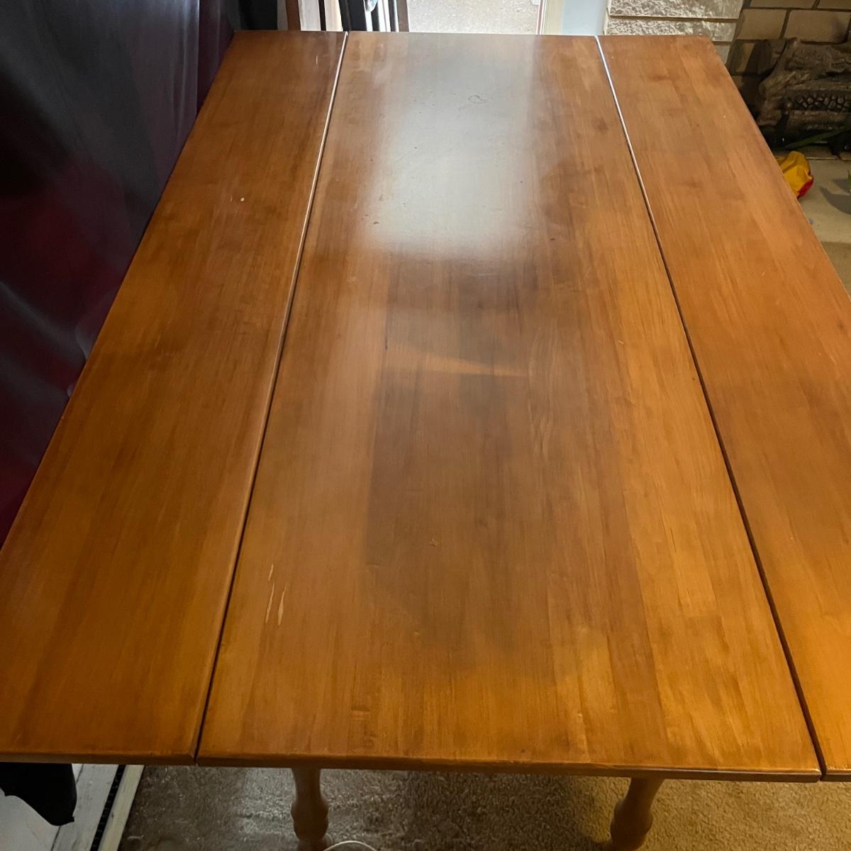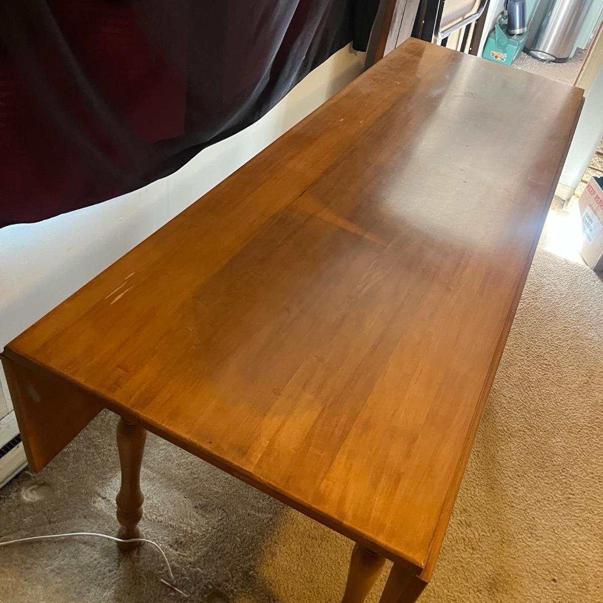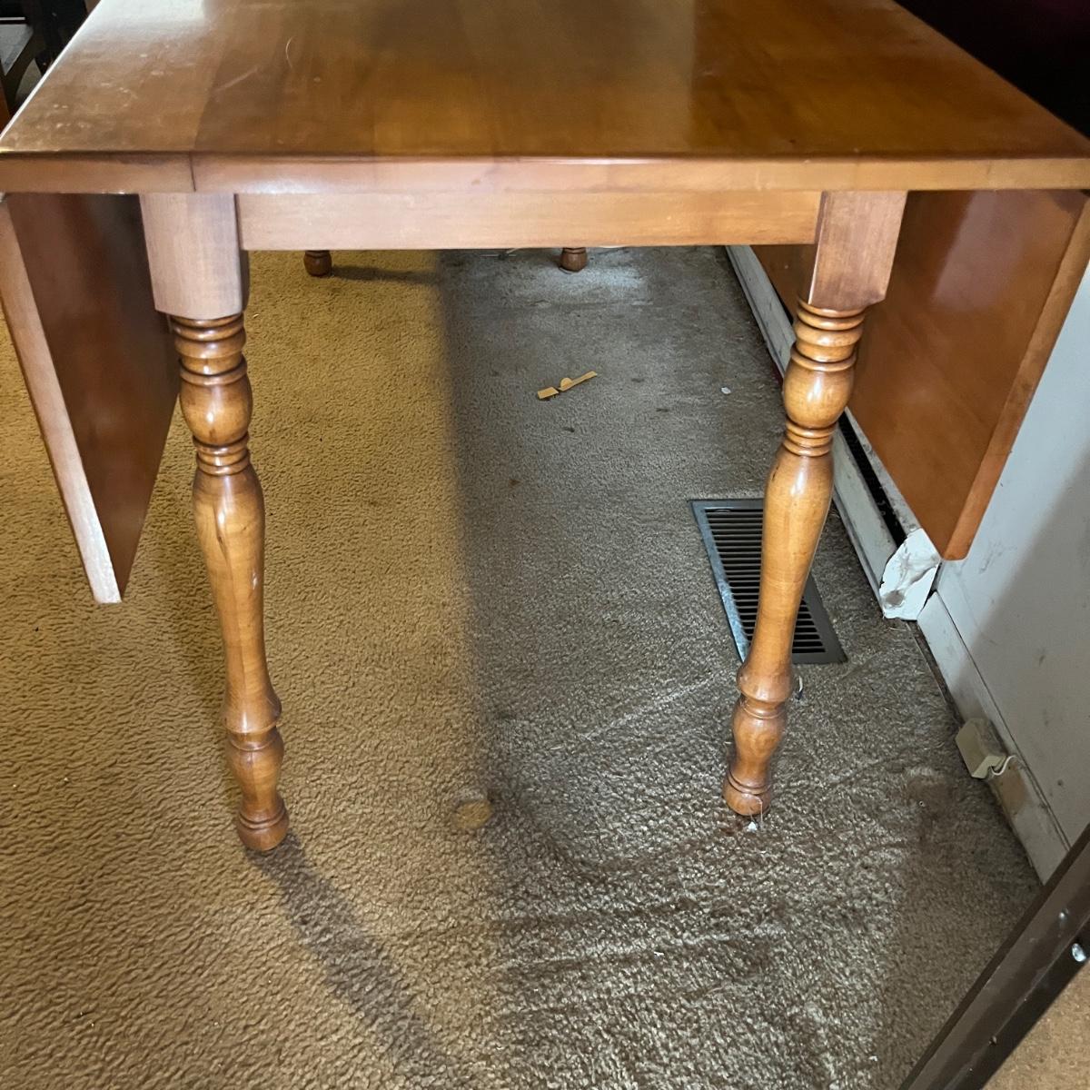 Lot includes a wooden drop leaf table that measures 66” x 23” x 30.5”H when leaves dropped and 66” x 42” x 30.5”H when leaves open.