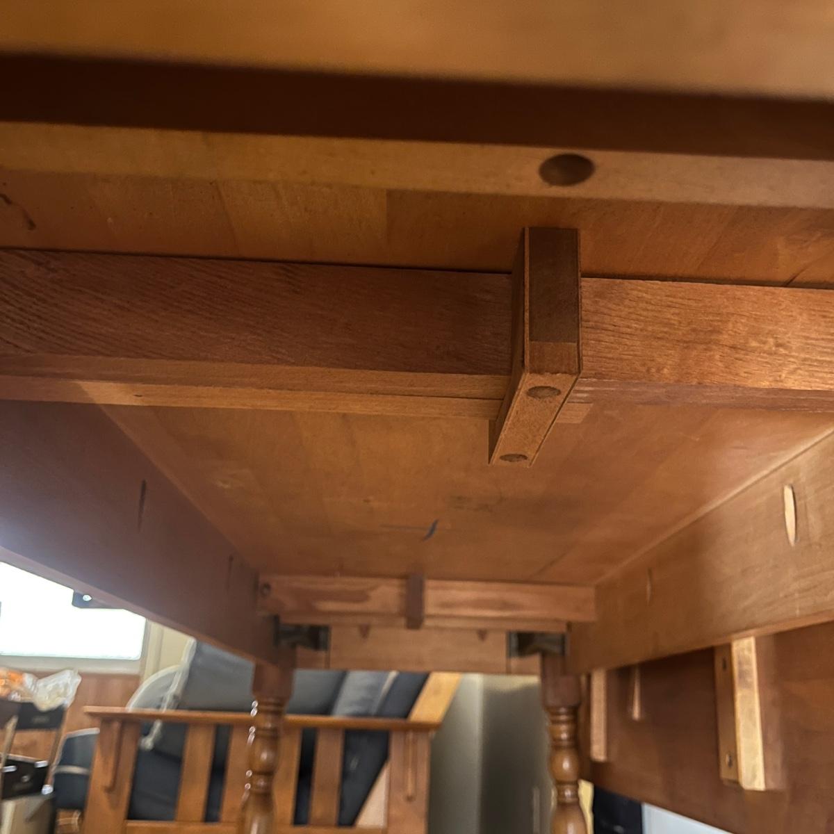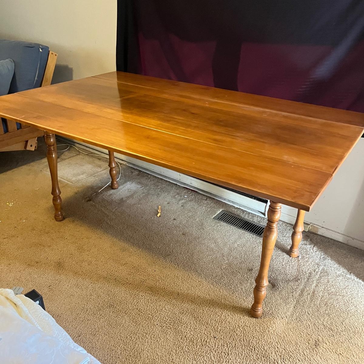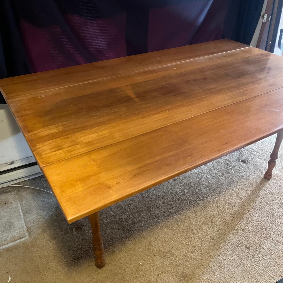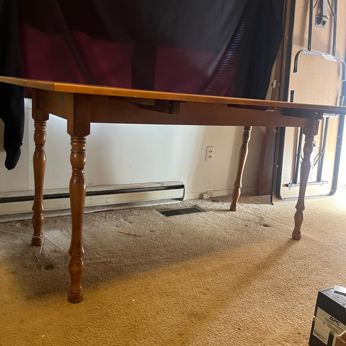 Lot includes a wooden drop leaf table that measures 66” x 23” x 30.5”H when leaves dropped and 66” x 42” x 30.5”H when leaves open.