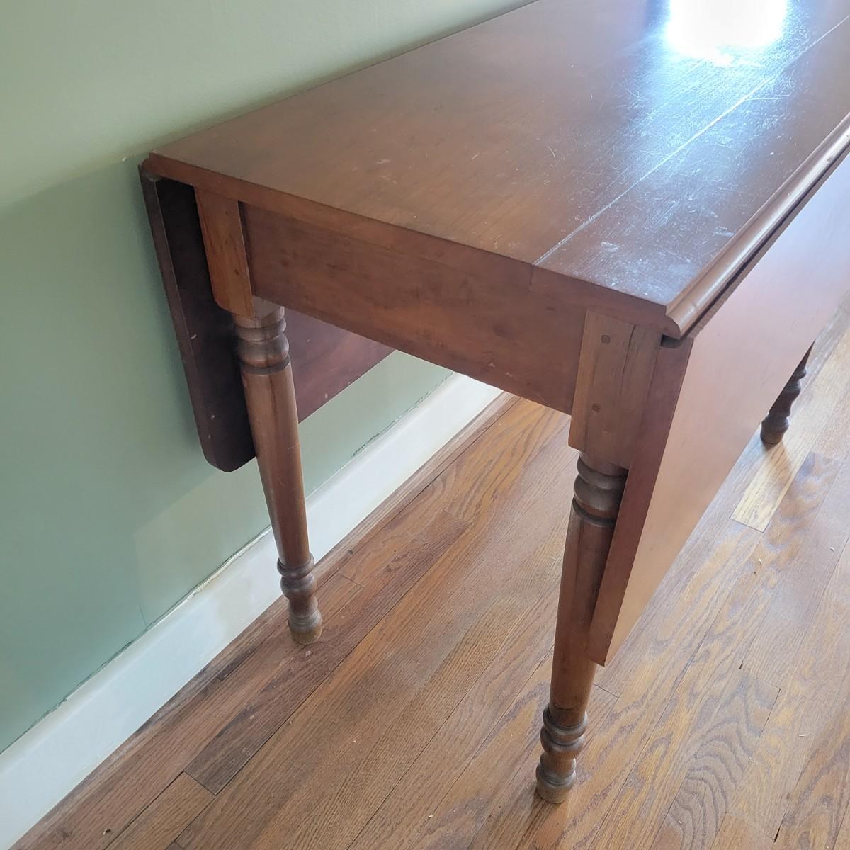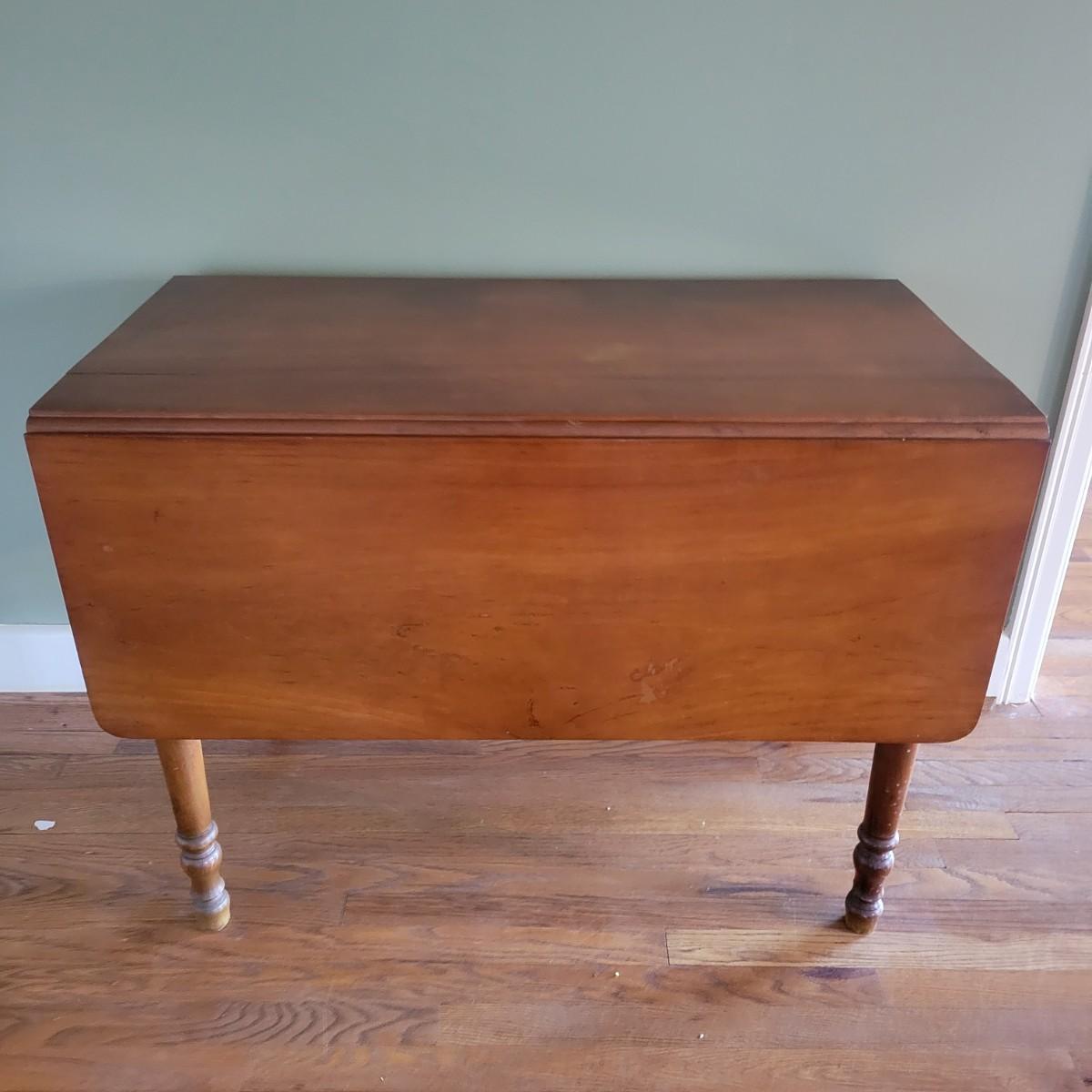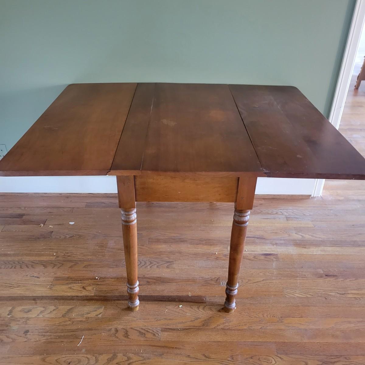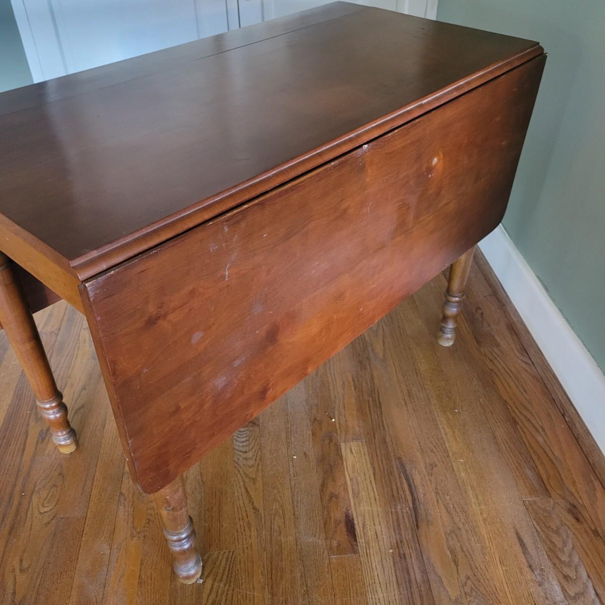 A wooden drop leaf table. This piece has two drop leafs that each measure 15" and are held up by swing out arms. Table extended measures approximately 49.5" x 39" x 29". Table is in good condition with some blemishes and scratches. There is a large crack on the top where a board has buckled and repaired. Local pickup only. Winning bidder will need to bring assistance to move this item.
