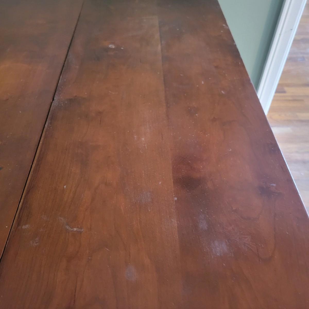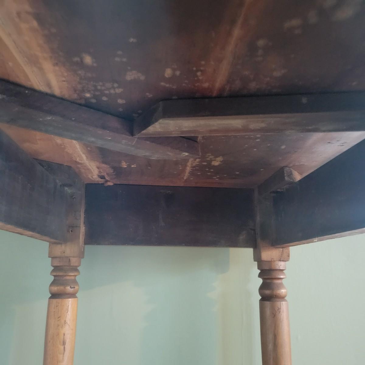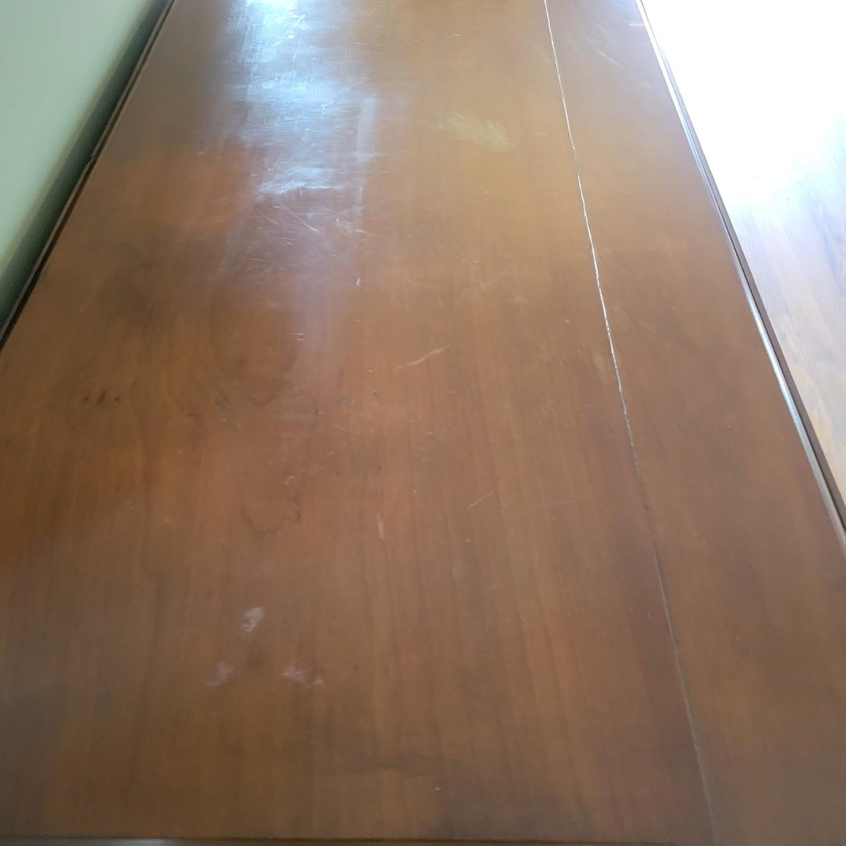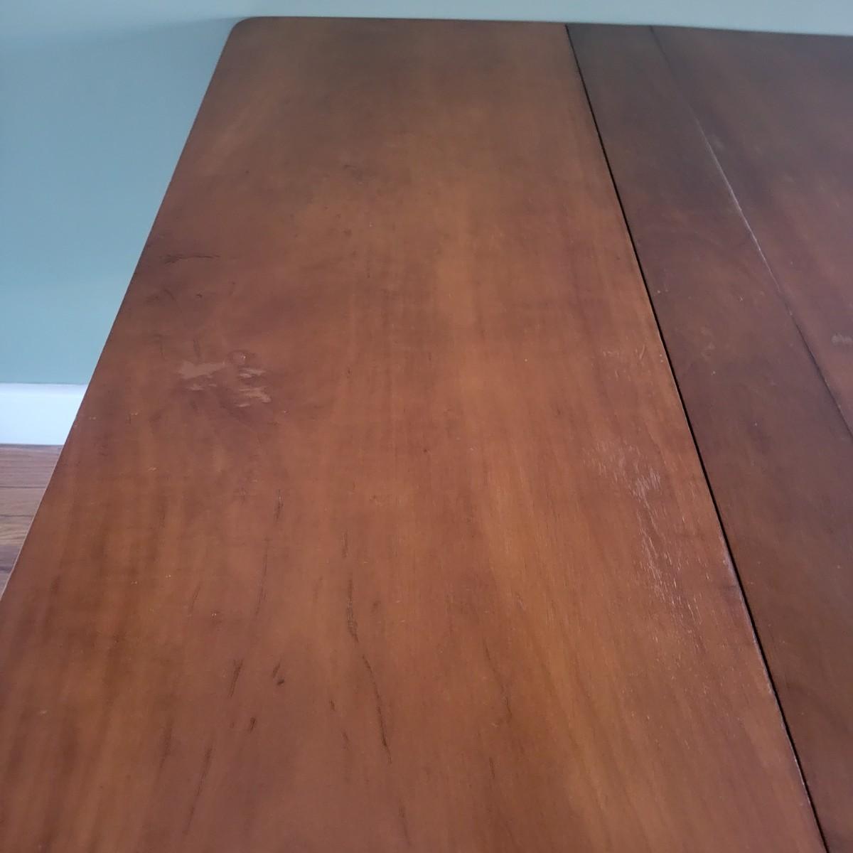 A wooden drop leaf table. This piece has two drop leafs that each measure 15" and are held up by swing out arms. Table extended measures approximately 49.5" x 39" x 29". Table is in good condition with some blemishes and scratches. There is a large crack on the top where a board has buckled and repaired. Local pickup only. Winning bidder will need to bring assistance to move this item.