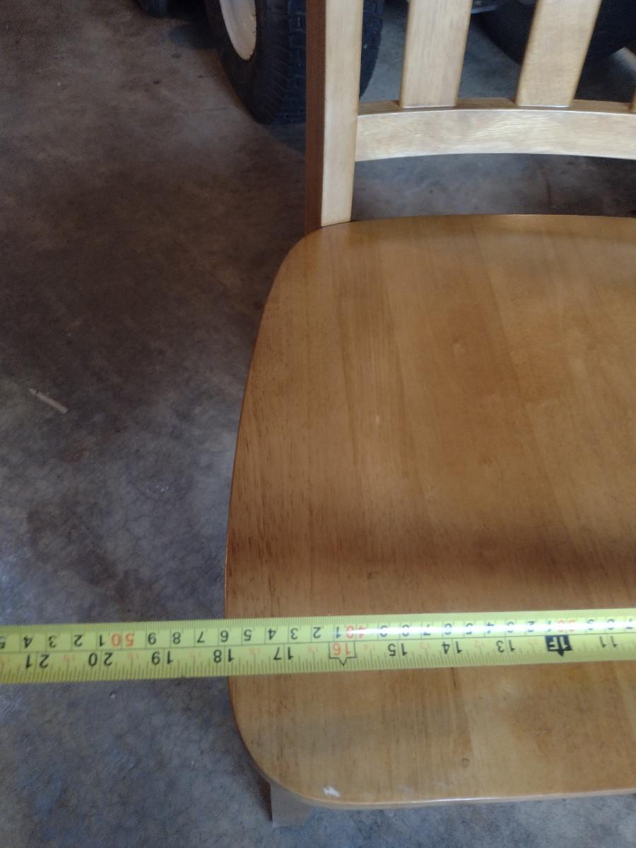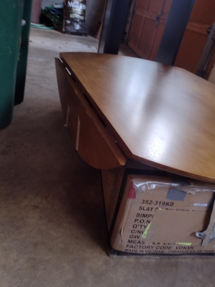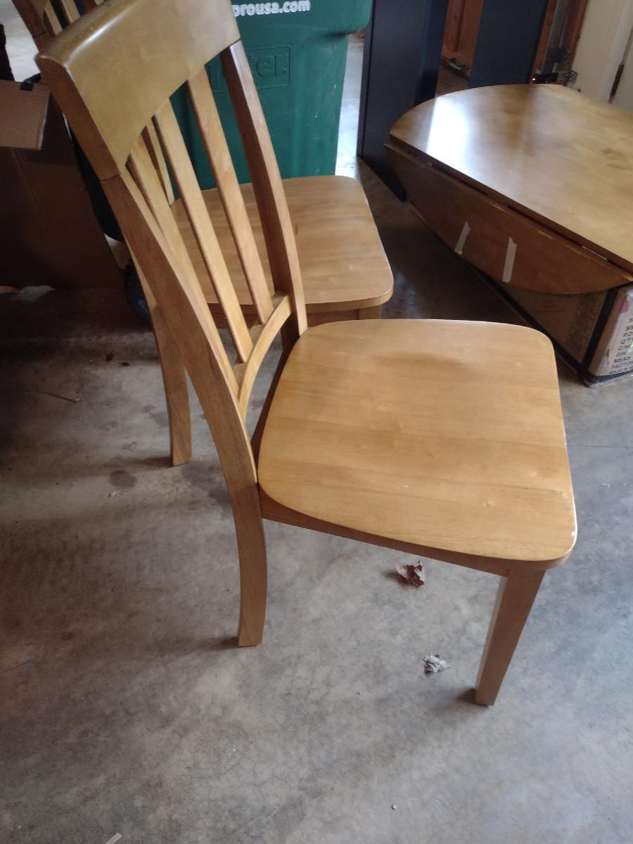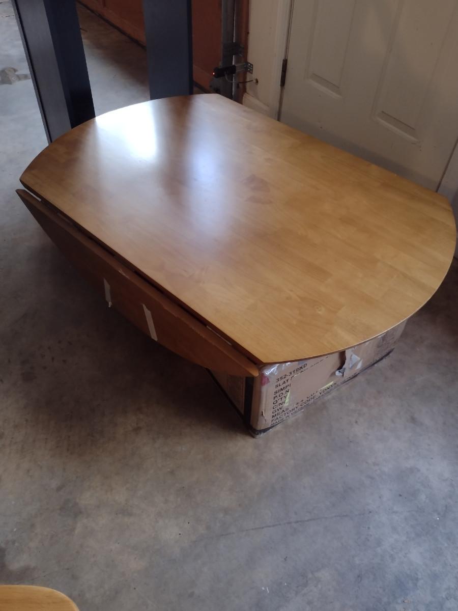 Wooden Drop Leaf Table with Four Chairs. Table is round and is 42" in diameter with leaves up- width decreases to 28 1/4" with leaves down. Table is approx 30 1/4" tall. Item is new and needs to be assembled.