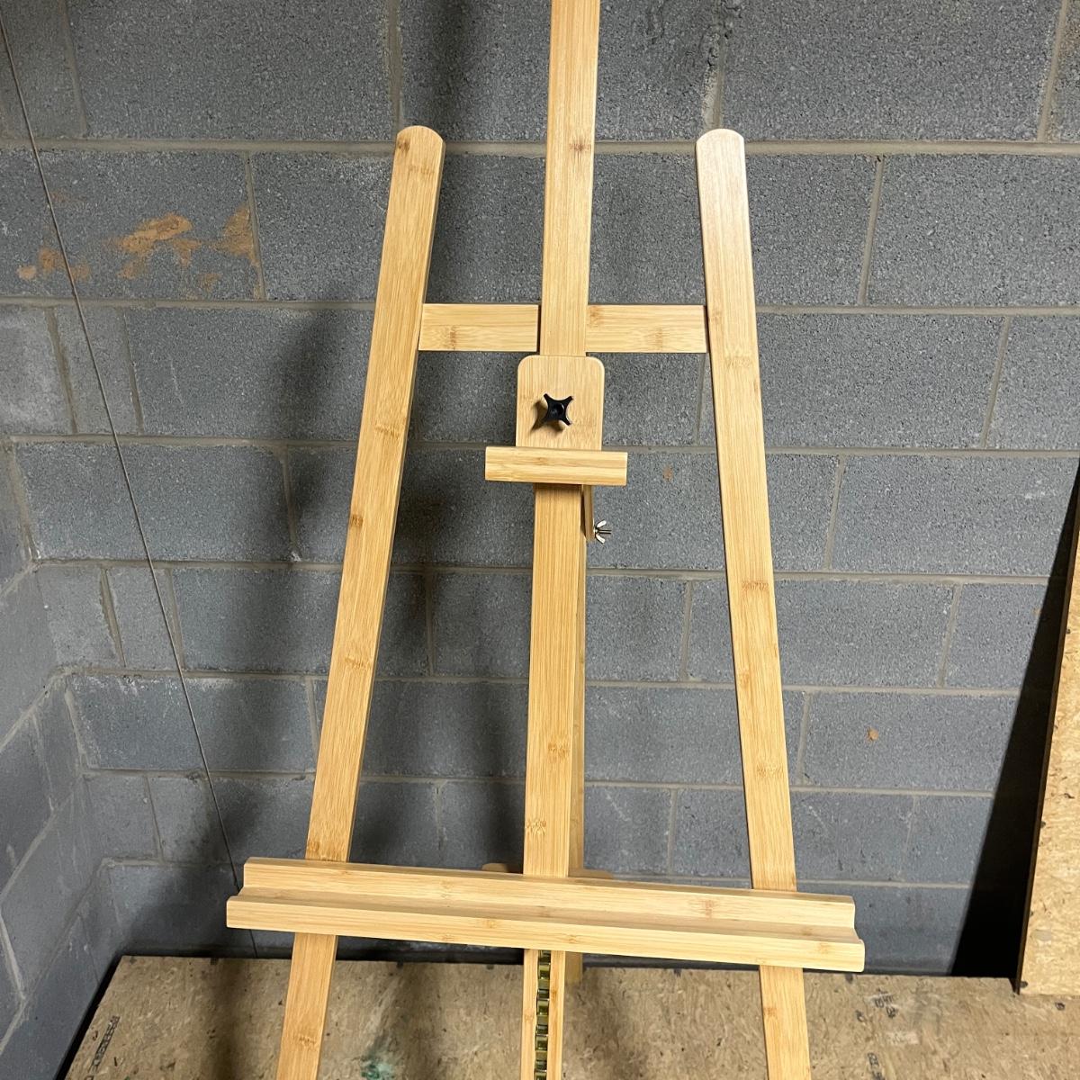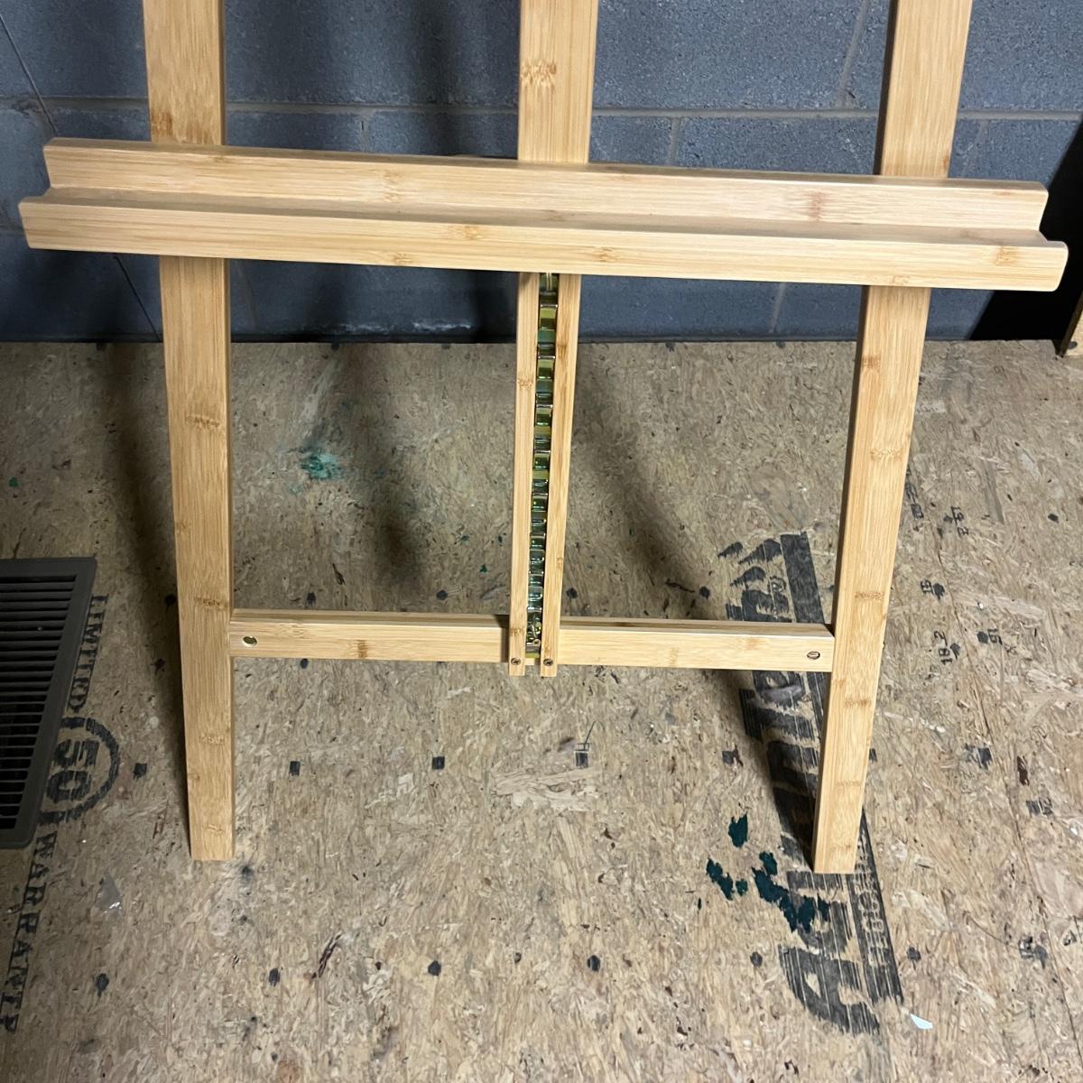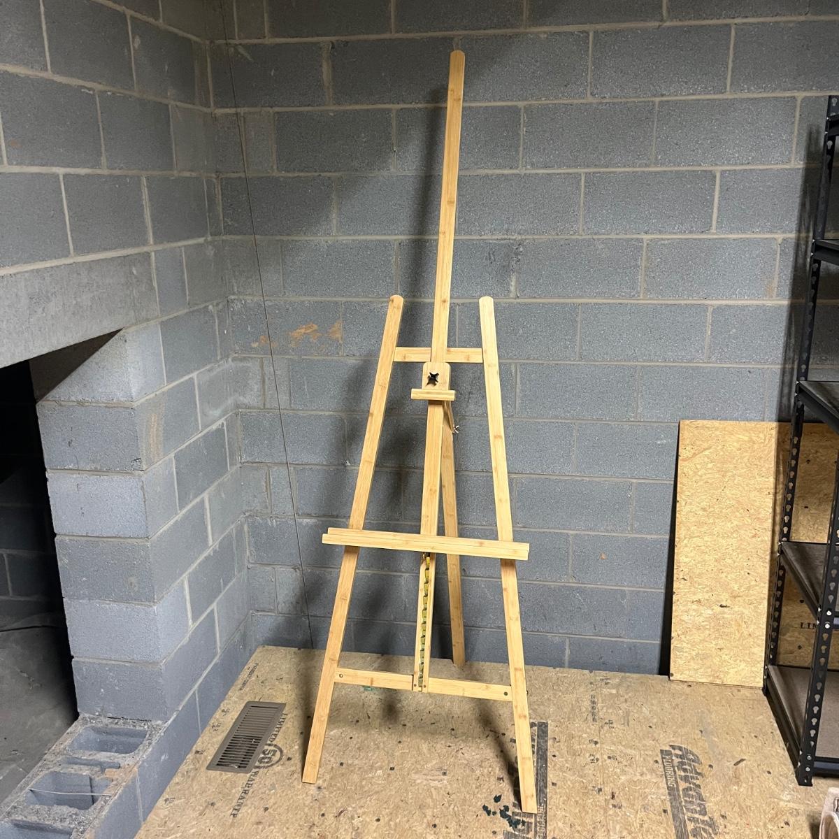 Lot includes a wooden adjustable height easel that measures 25” x 28” x 78”H at tallest setting.