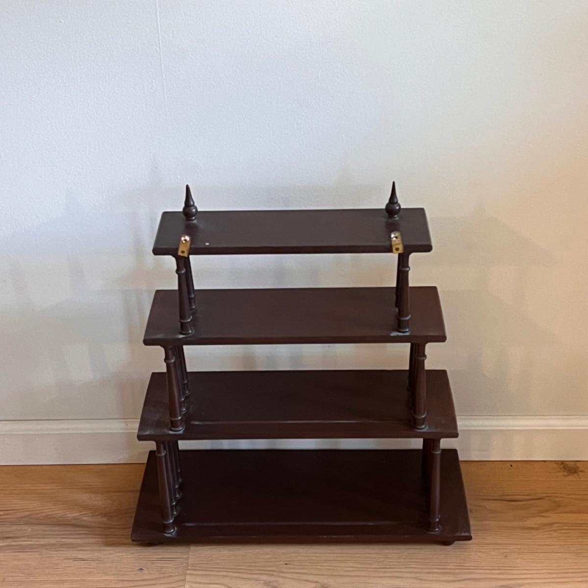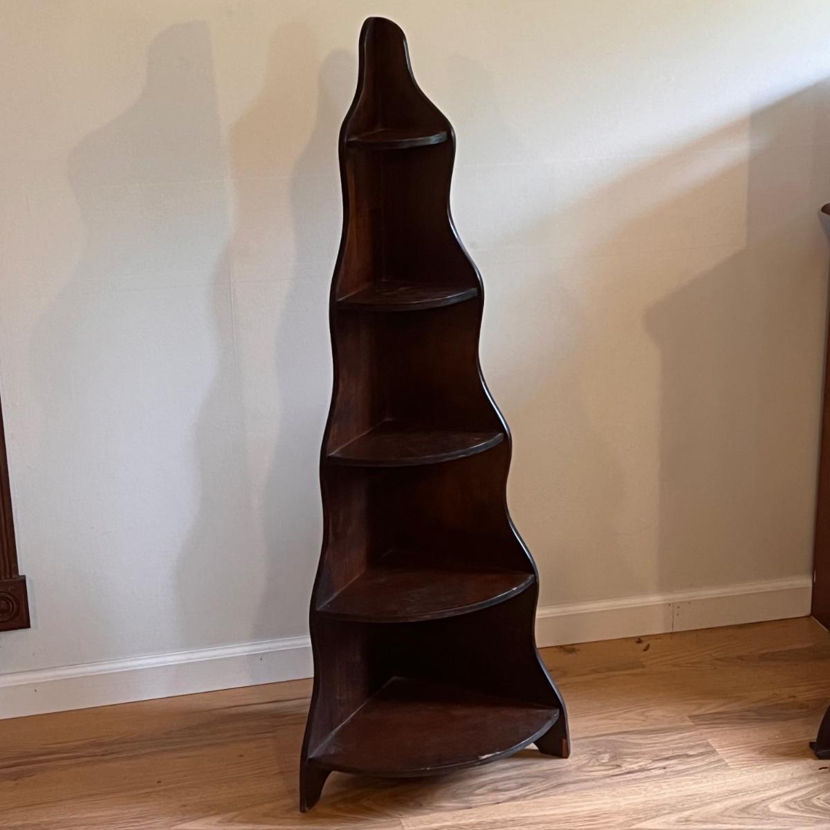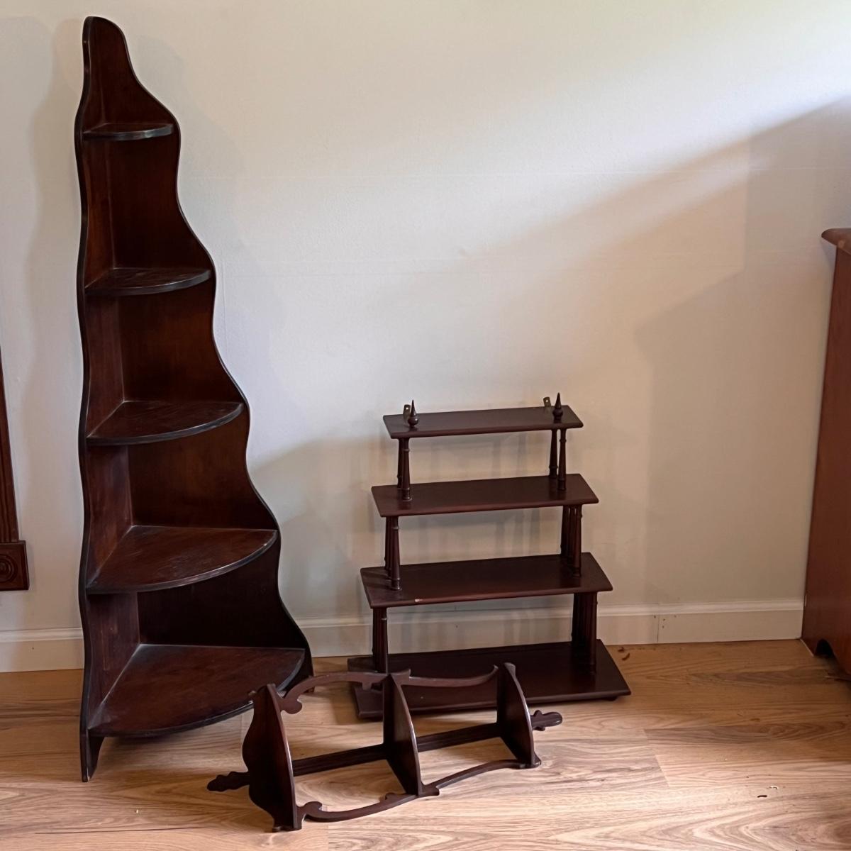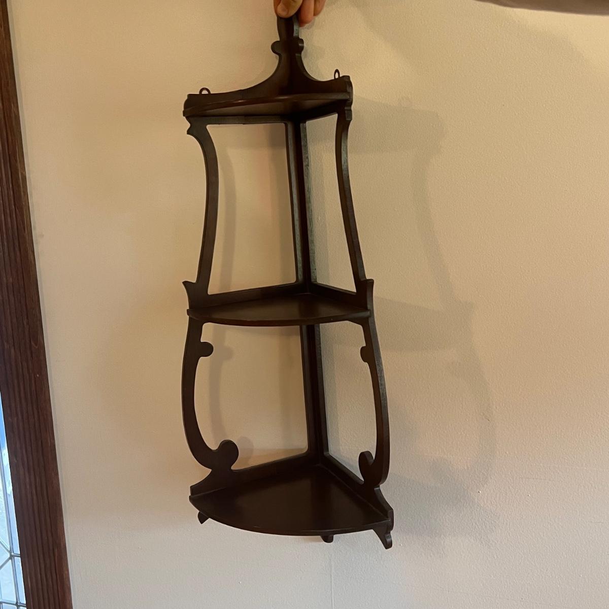 This lot includes three eclectic wooden shelves. The small corner shelf and the four tier curio shelf have brackets for hanging. The large corner shelf with five tiers measures 18” x 49”H. There is a small chip on the bottom of the largest shelf. Please see photos for details. Local pickup only.