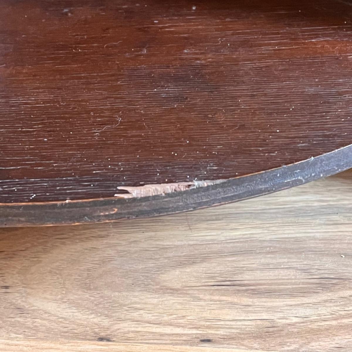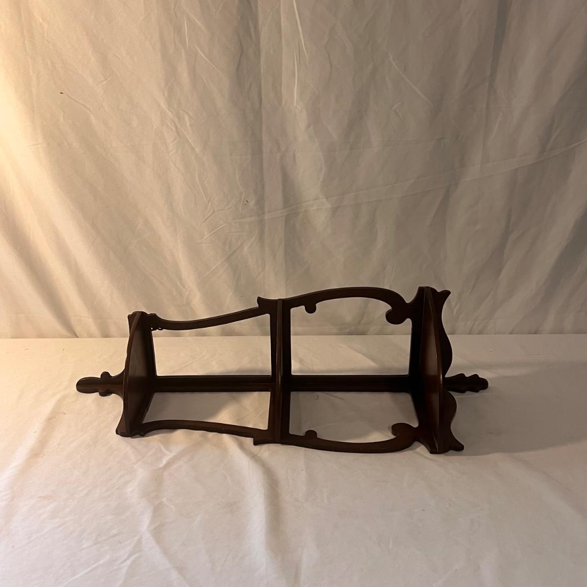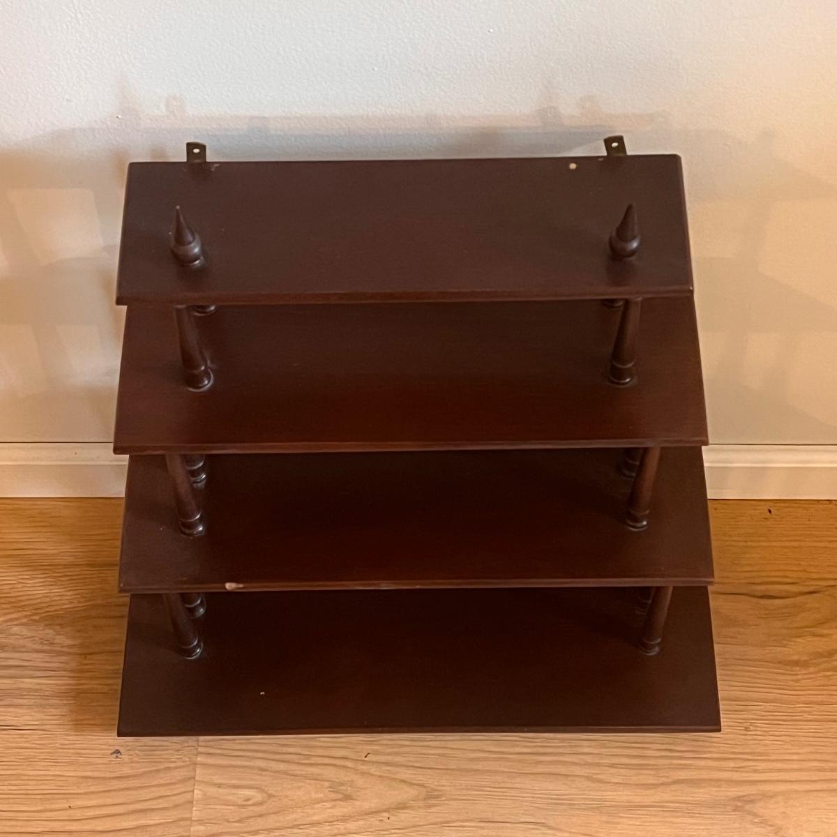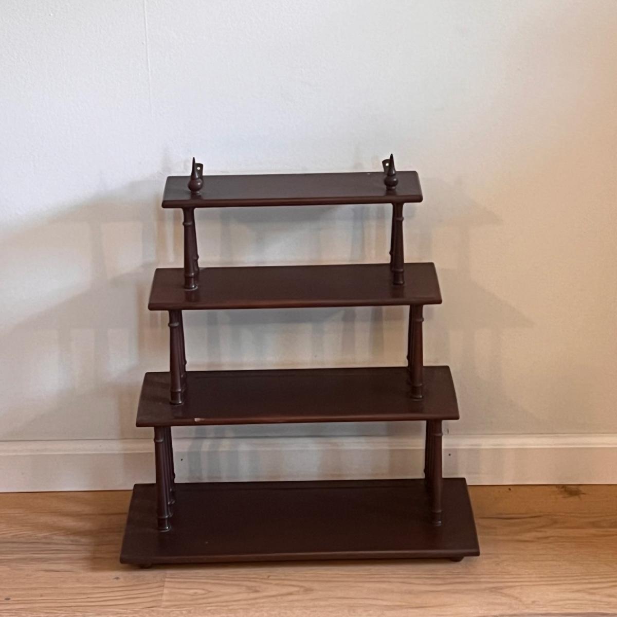 This lot includes three eclectic wooden shelves. The small corner shelf and the four tier curio shelf have brackets for hanging. The large corner shelf with five tiers measures 18” x 49”H. There is a small chip on the bottom of the largest shelf. Please see photos for details. Local pickup only.