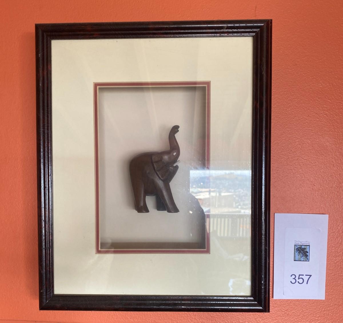 Wooden Elephant shadow box art with frame. Carved. 12" x 15"