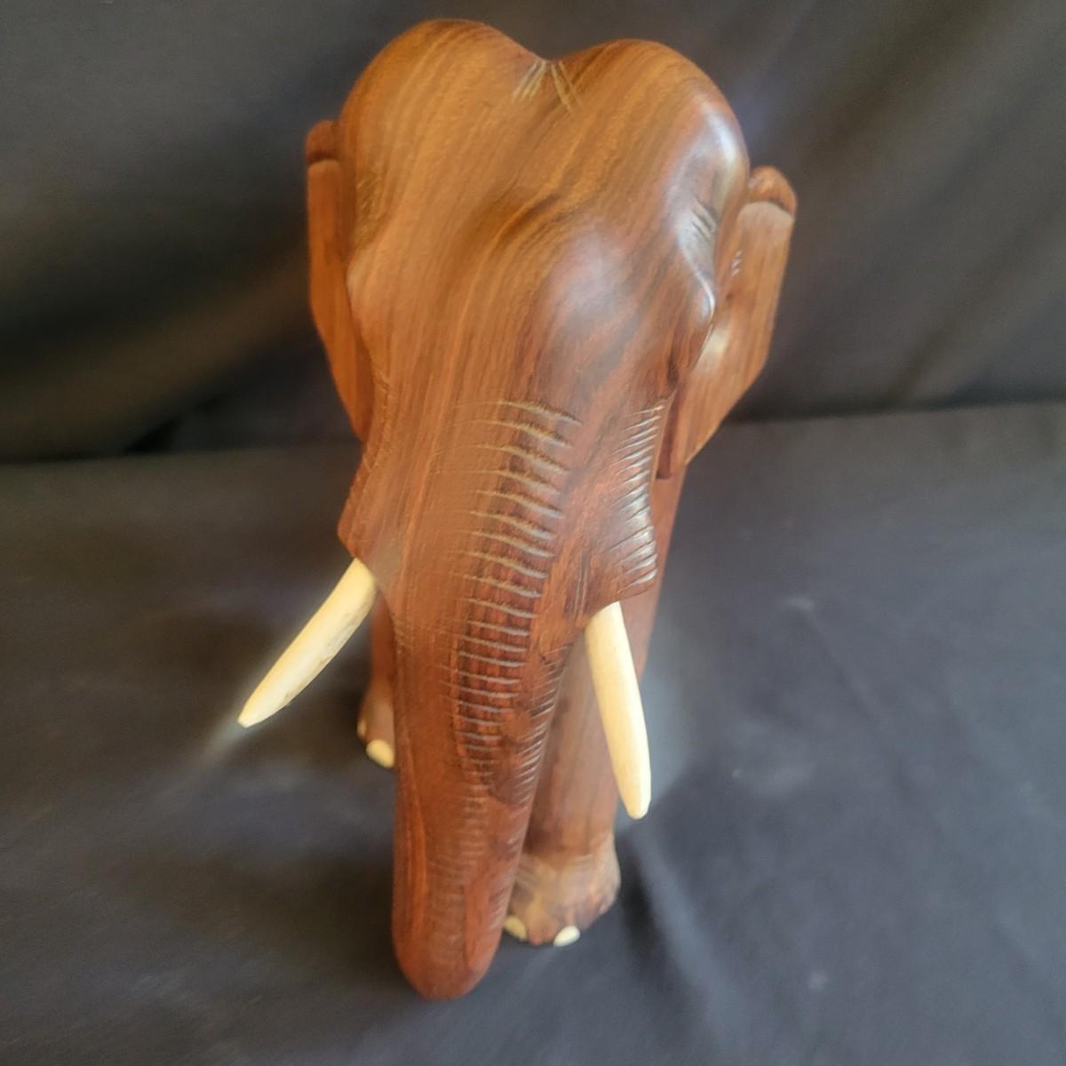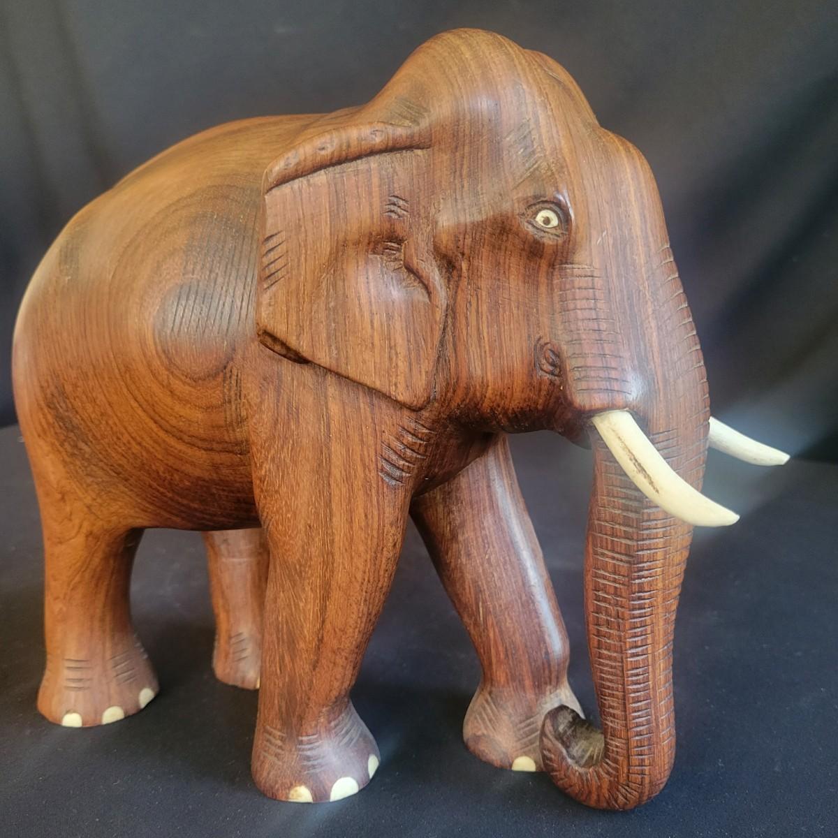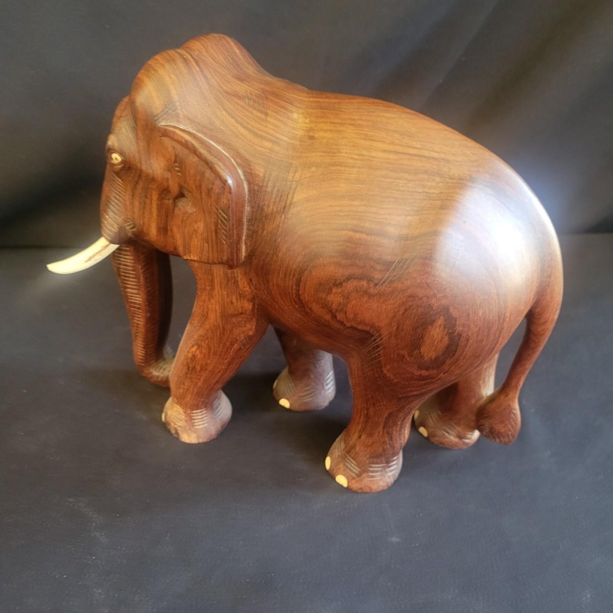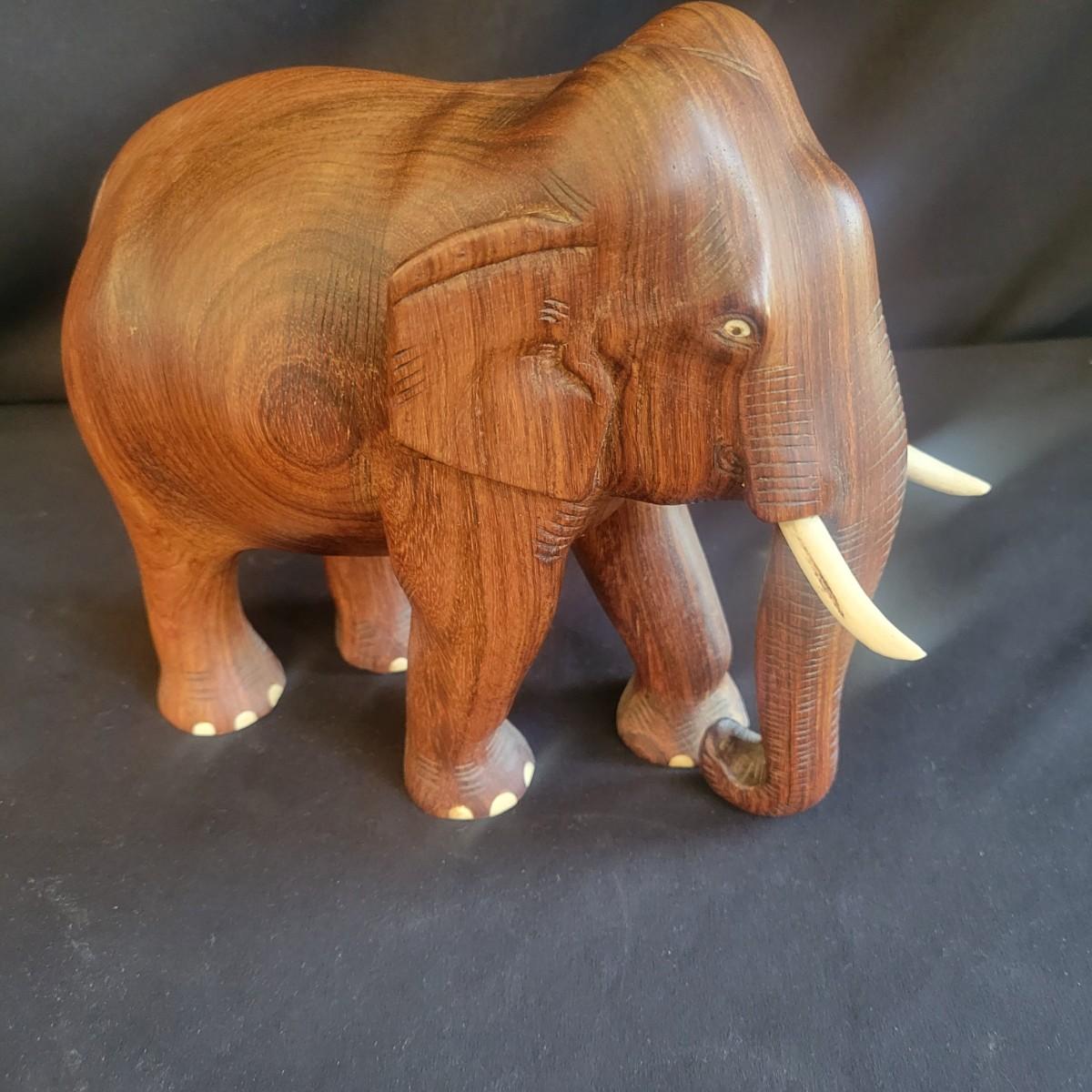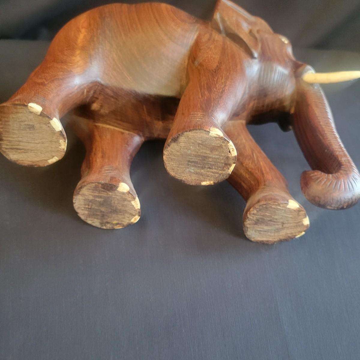 A carved wooden elephant with no damage. It measures approximately 9" x 4" x 8.5"H. Shipping available