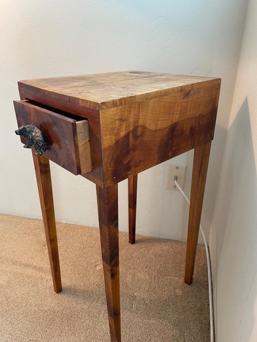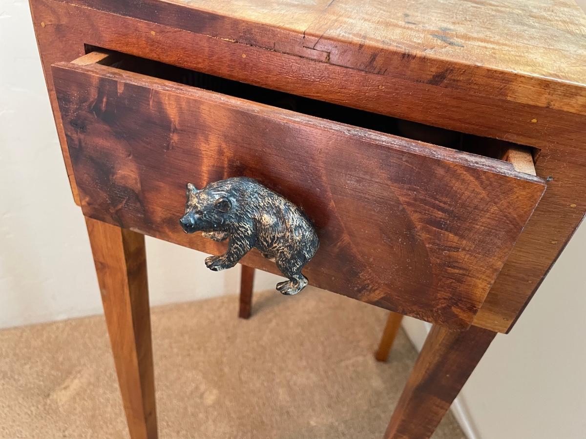 Wooden end/occasional table with bear knob in good condition with some wear on the top as pictured. (12inX15inX27in)