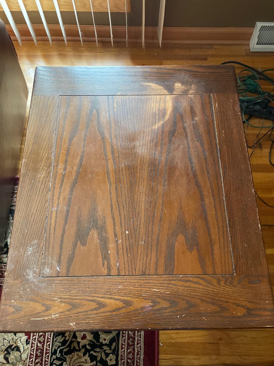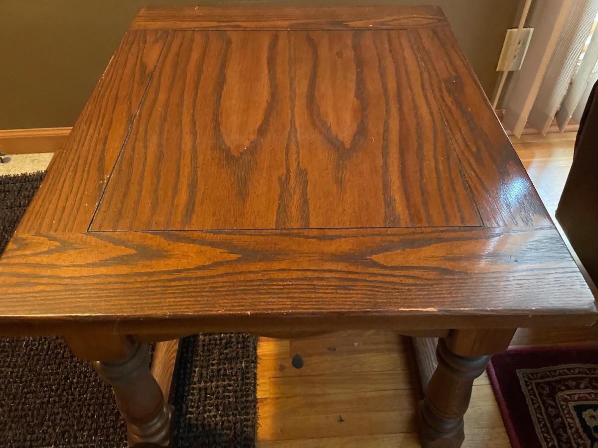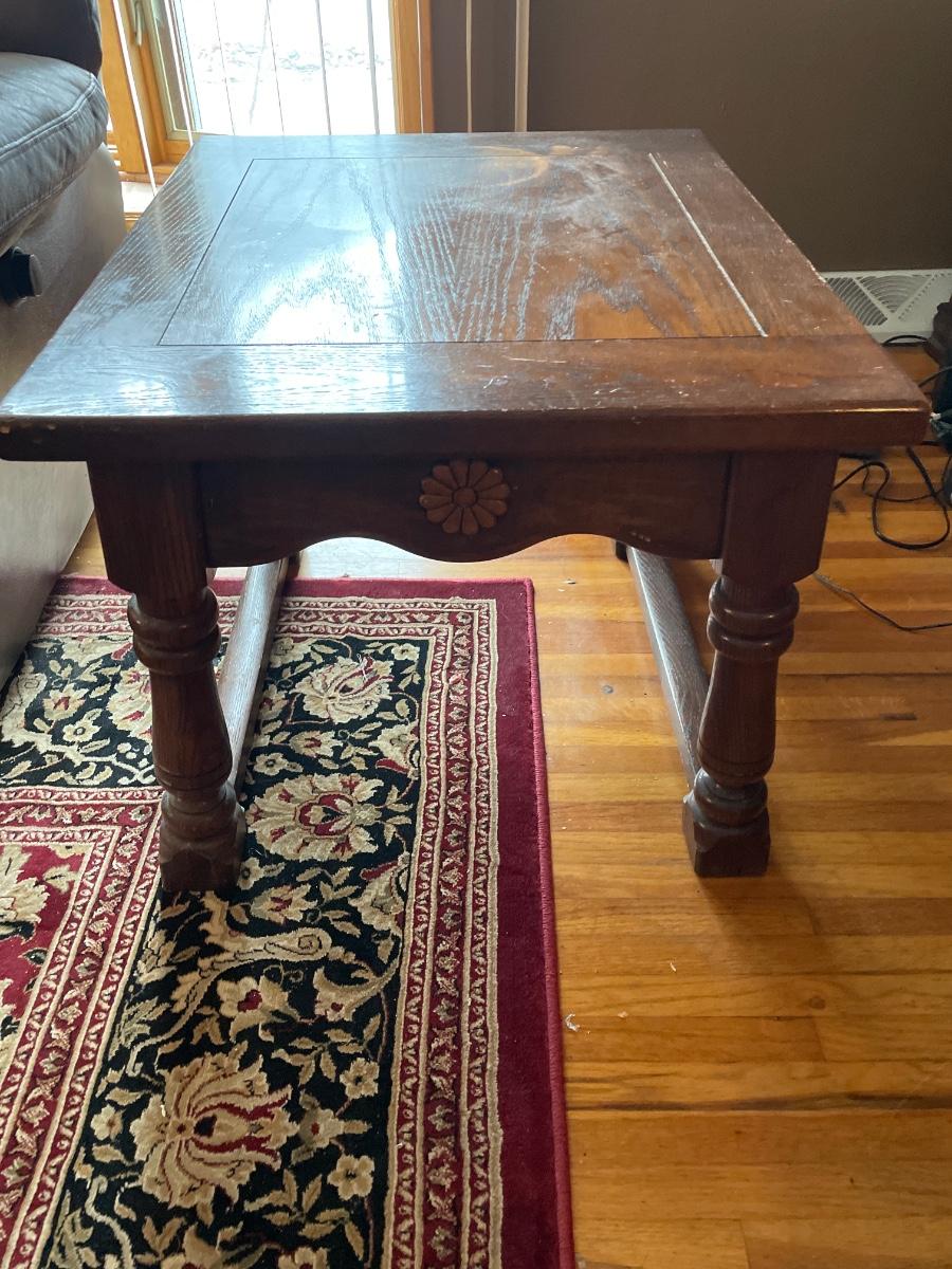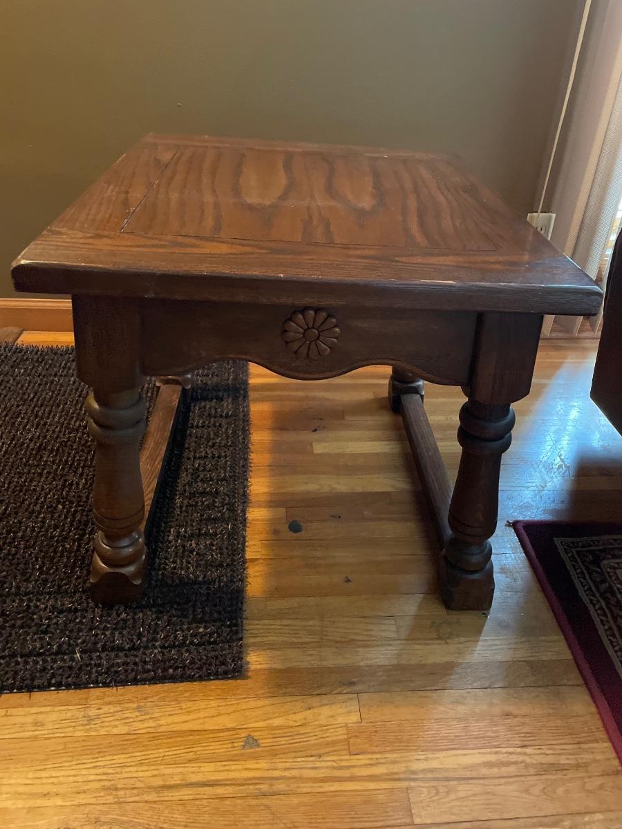 Wooden end tables set of two. Shows some wear on the tops of both. Dimensions are 26” long x 22” wide by 20 1/2” tall