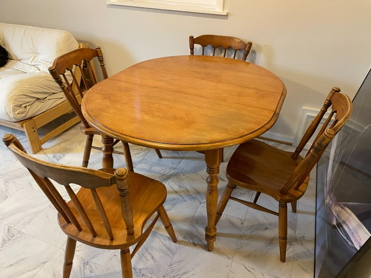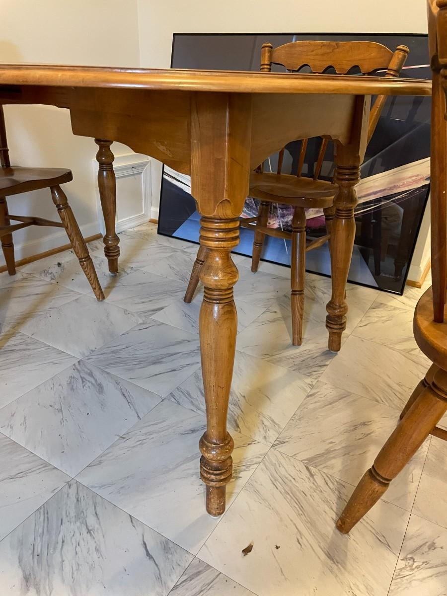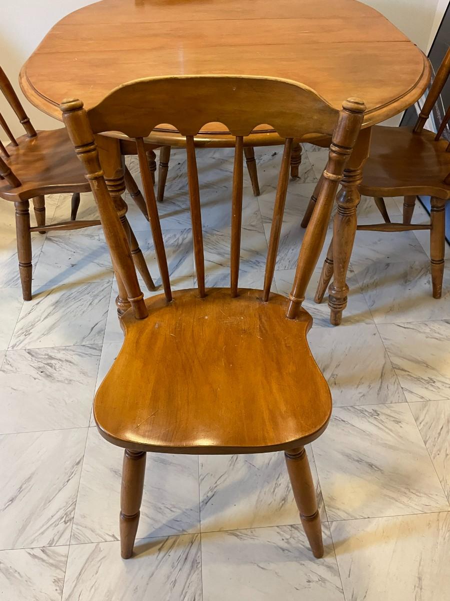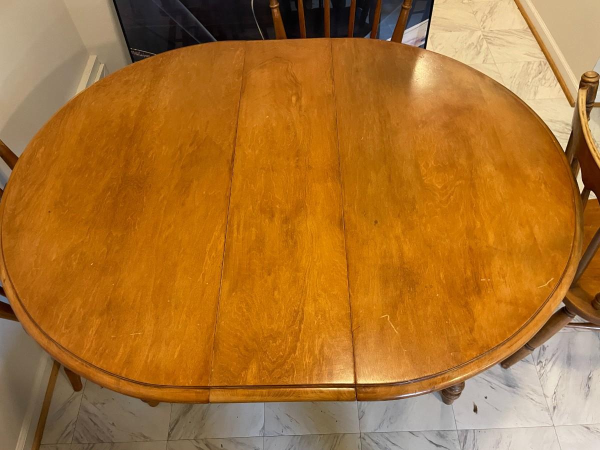 Oval wooden dining table with an extendable leaf and matching set of four spindle-back chairs. The table and chairs feature turned legs and a medium wood stain finish. The set shows signs of wear consistent with use, including surface scratches and wood discoloration. A functional and sturdy addition to any dining space.