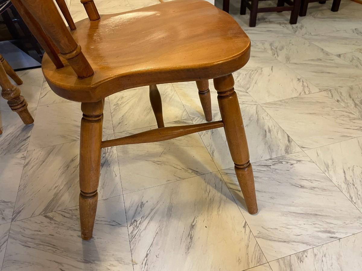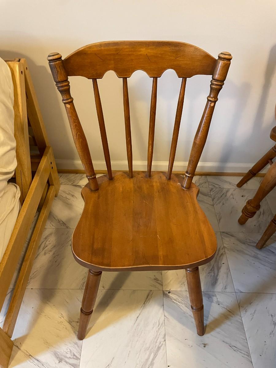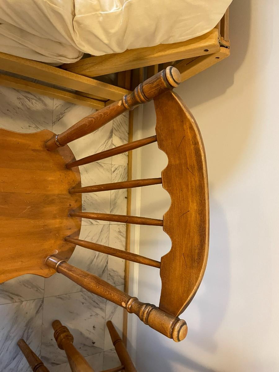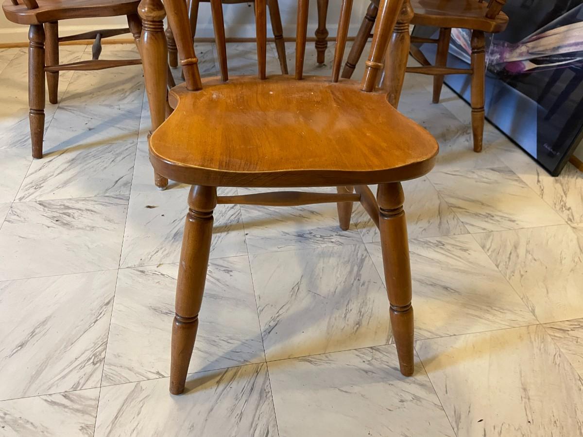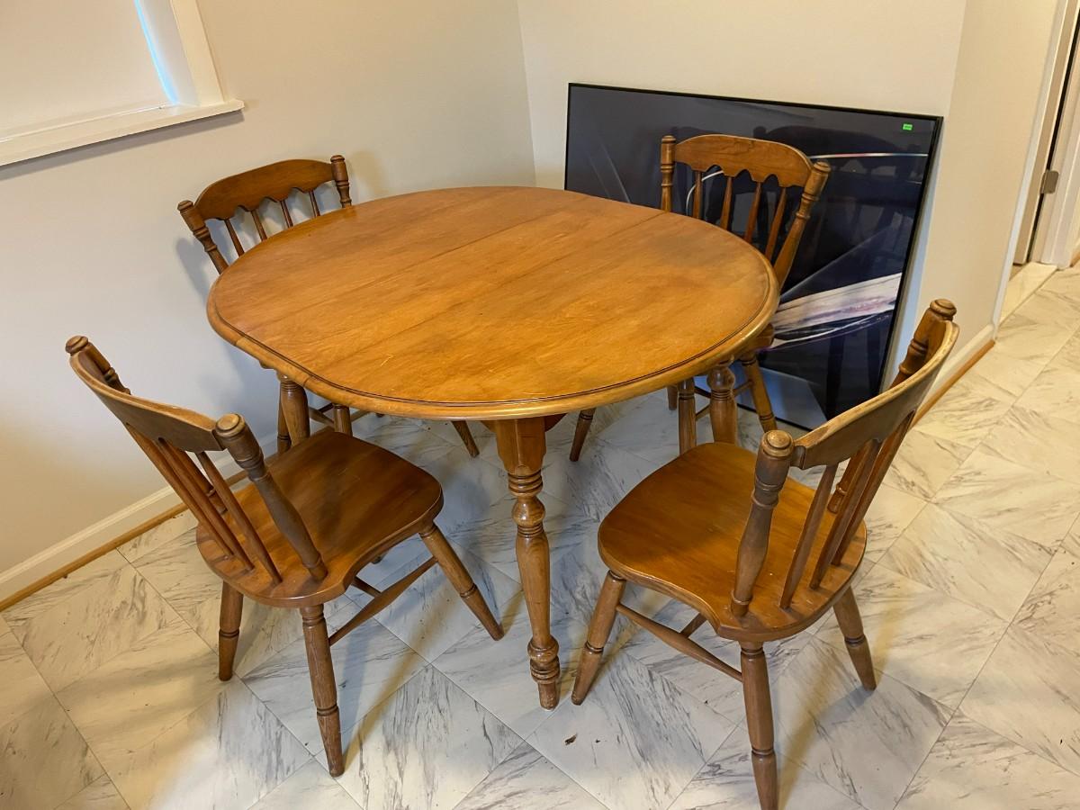 Oval wooden dining table with an extendable leaf and matching set of four spindle-back chairs. The table and chairs feature turned legs and a medium wood stain finish. The set shows signs of wear consistent with use, including surface scratches and wood discoloration. A functional and sturdy addition to any dining space.