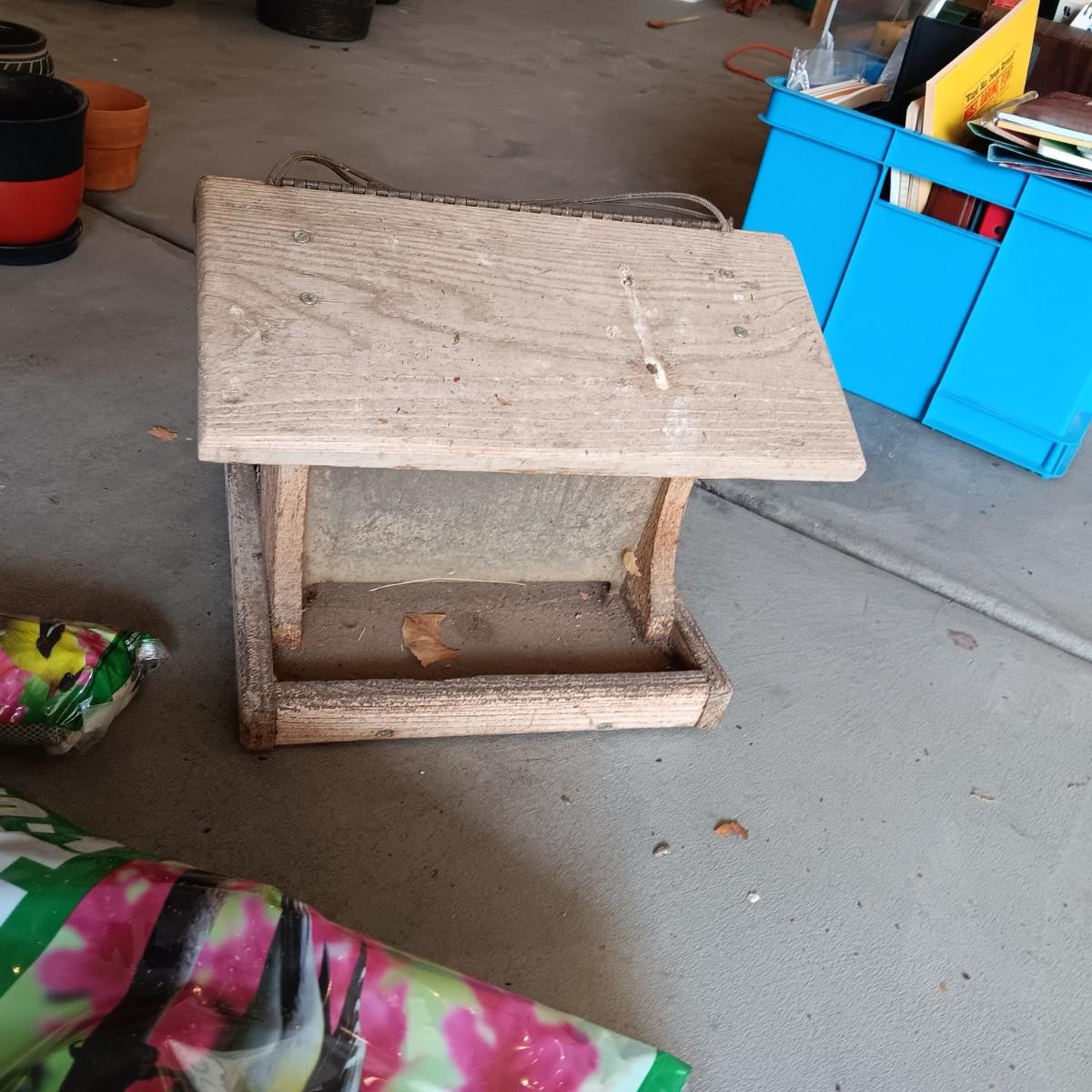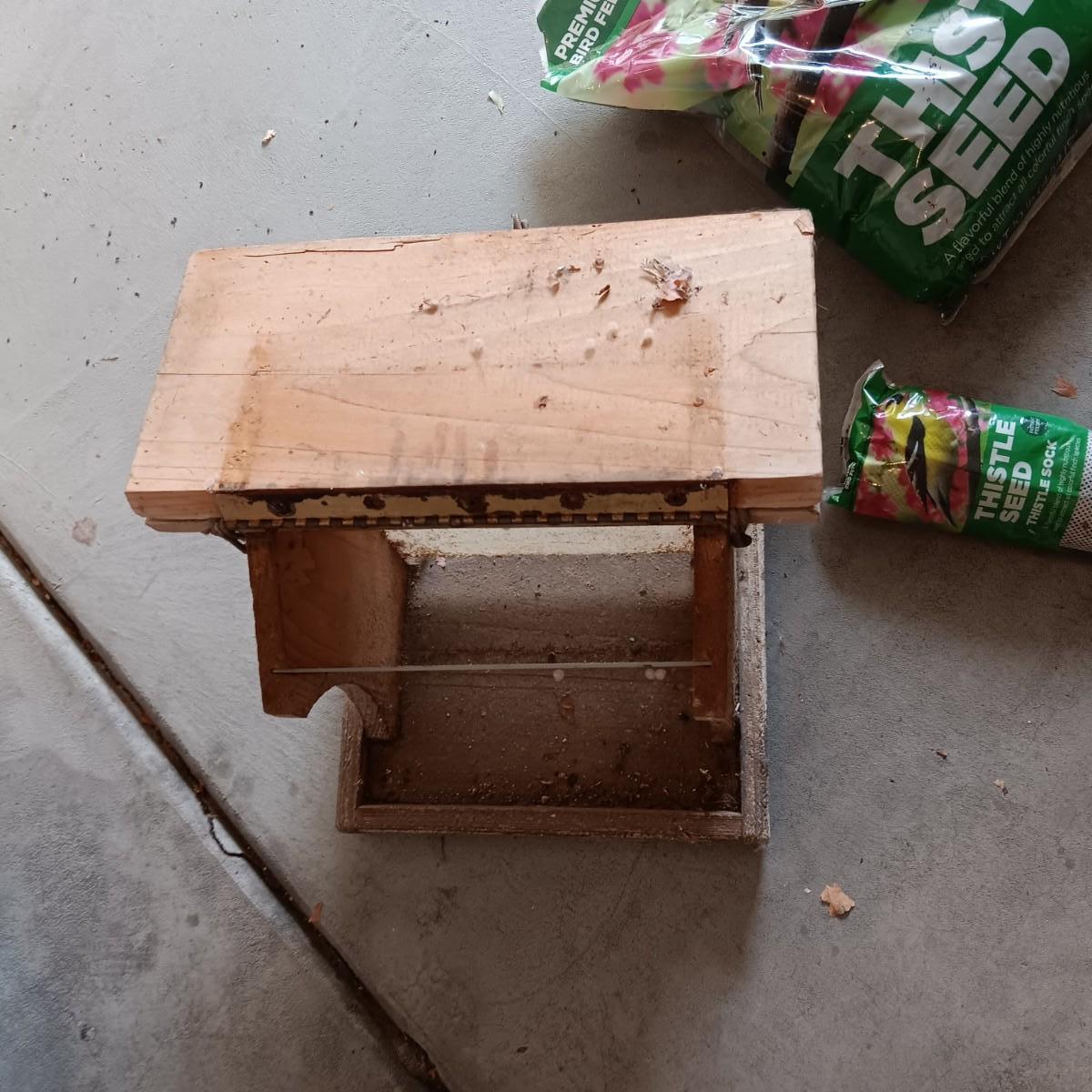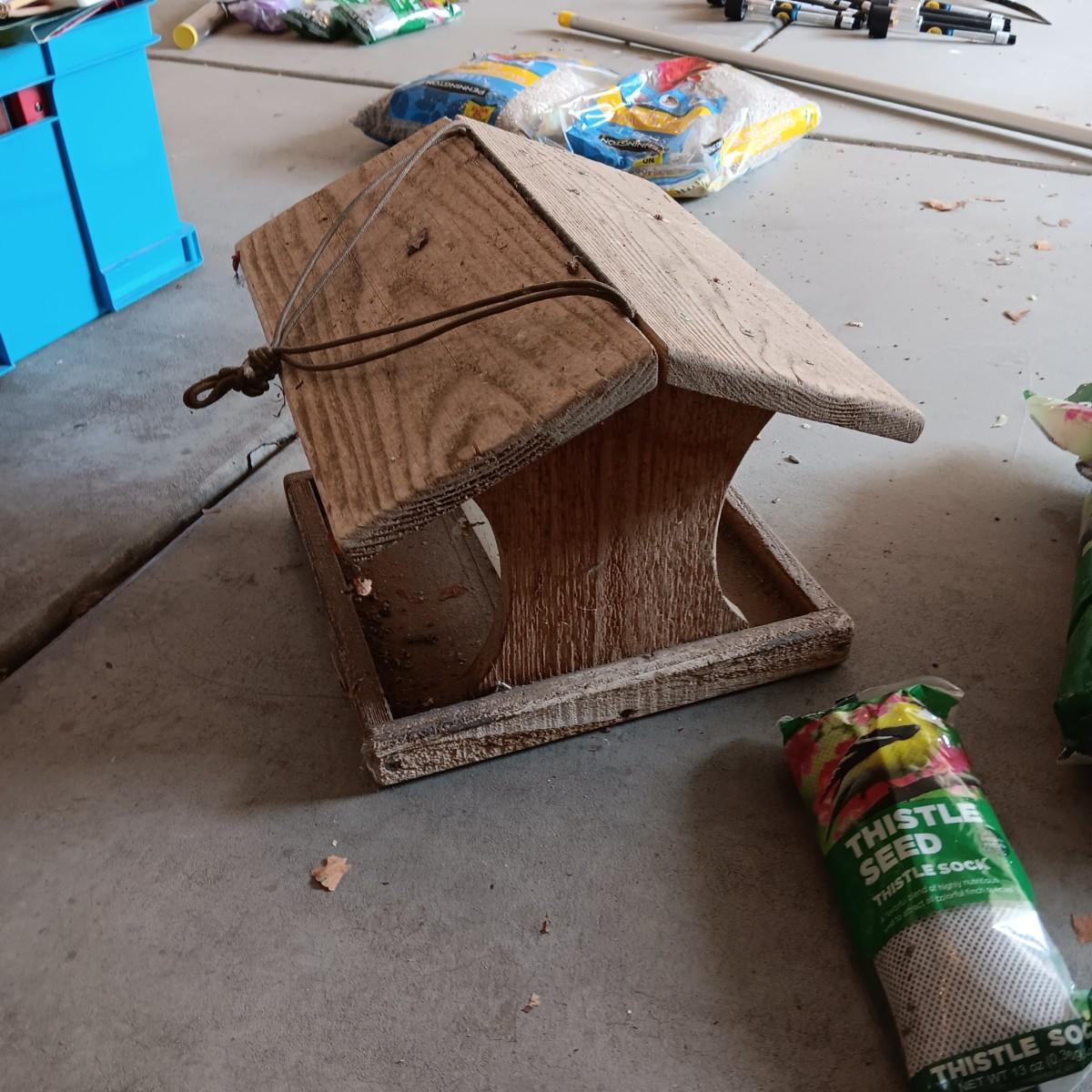 WOODEN FAIRLY LARGE BIRD FEEDER AND THISTLE BIRD SEED