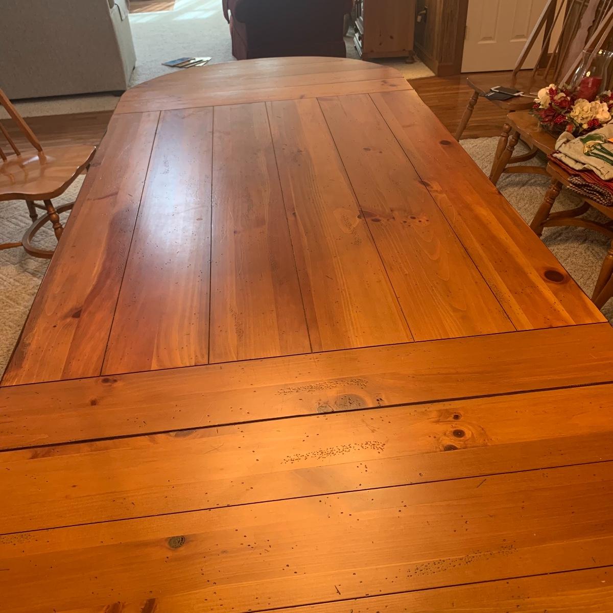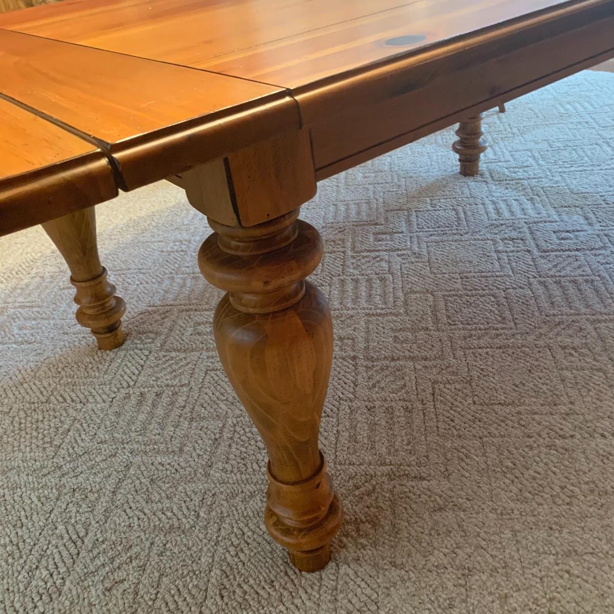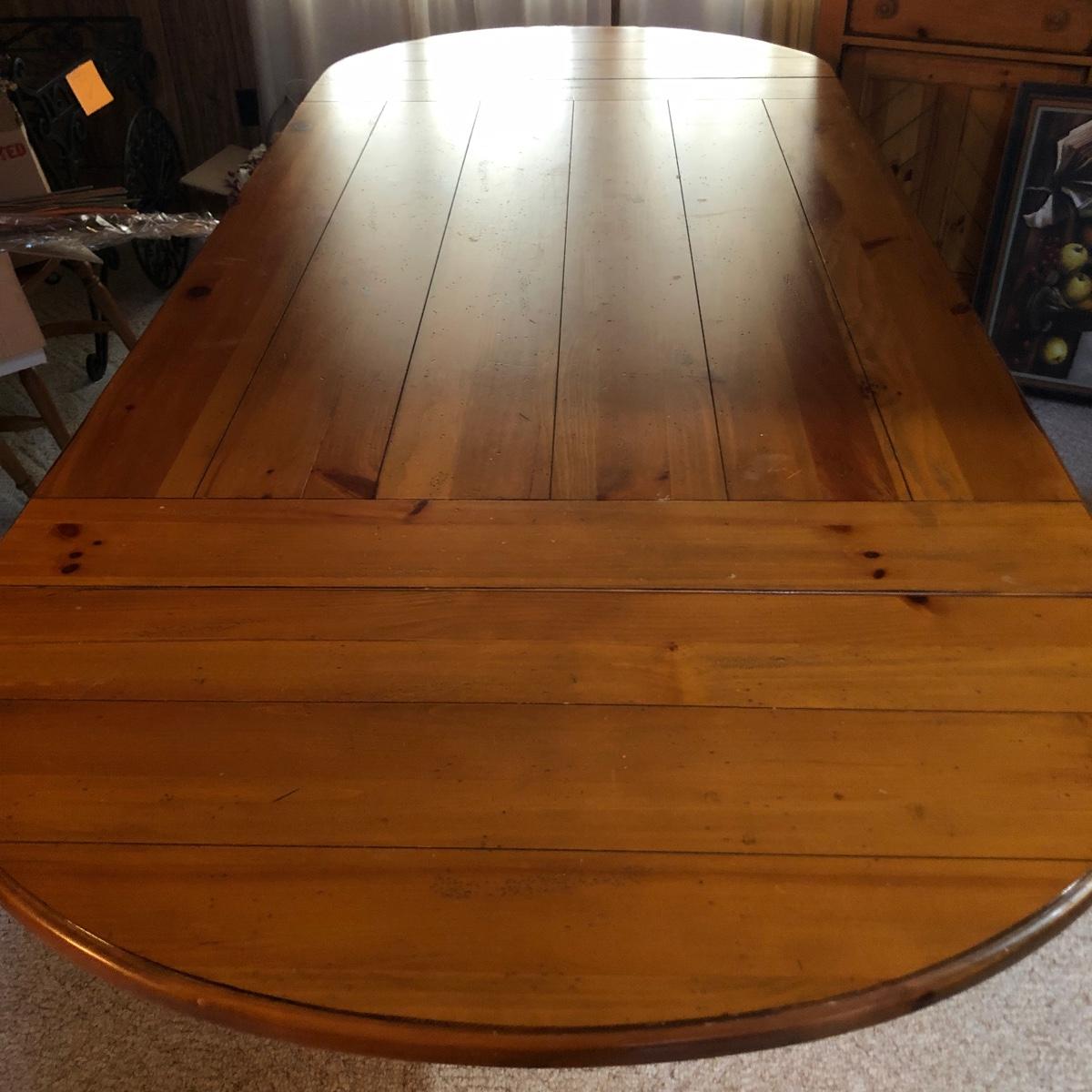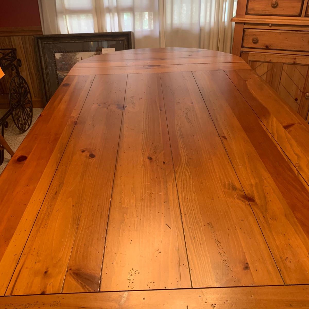 This wooden farm table is absolutely gorgeous! Made of solid distressed pine and has folding end leafs. This table measures 44” X 104” with leaves in and 44” x 68” with leaves removed and is in good condition. Leaves have a latch underneath and pull out to remove.