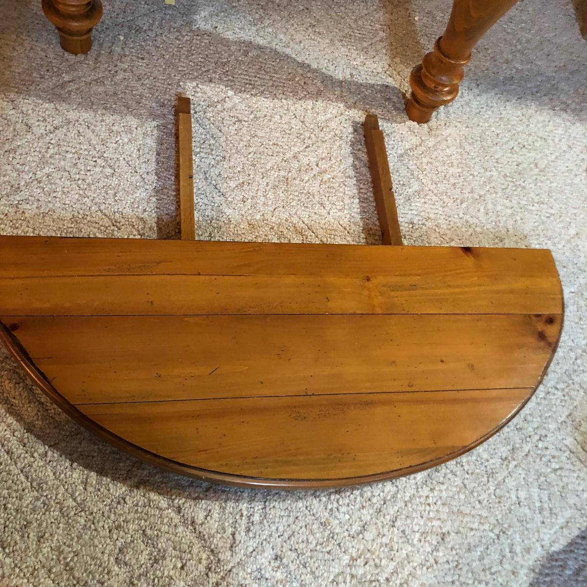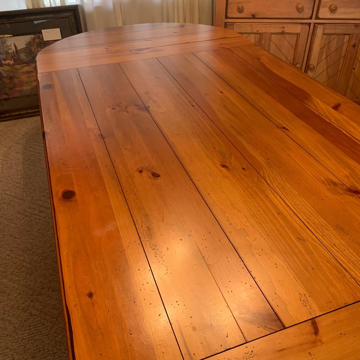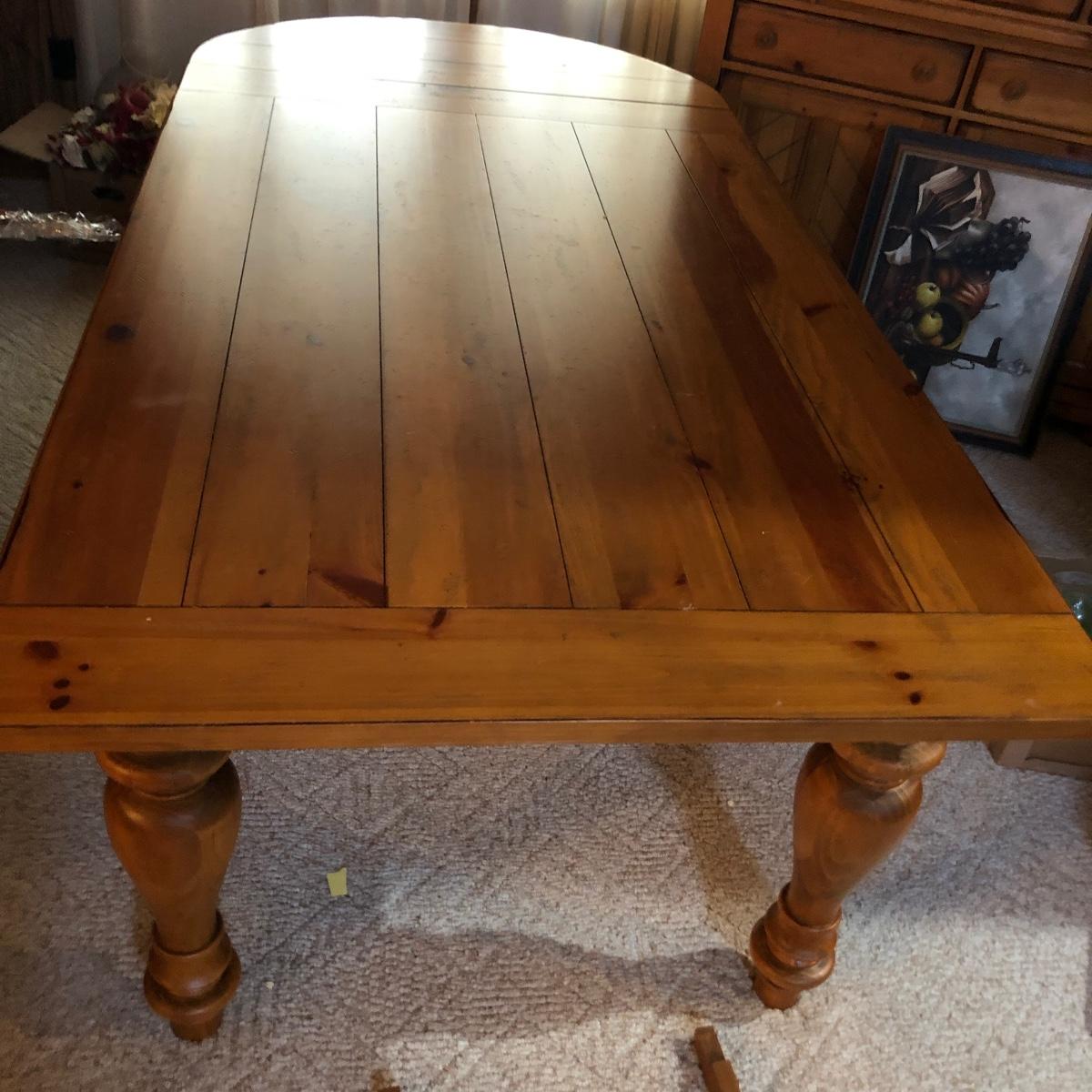 This wooden farm table is absolutely gorgeous! Made of solid distressed pine and has folding end leafs. This table measures 44” X 104” with leaves in and 44” x 68” with leaves removed and is in good condition. Leaves have a latch underneath and pull out to remove.
