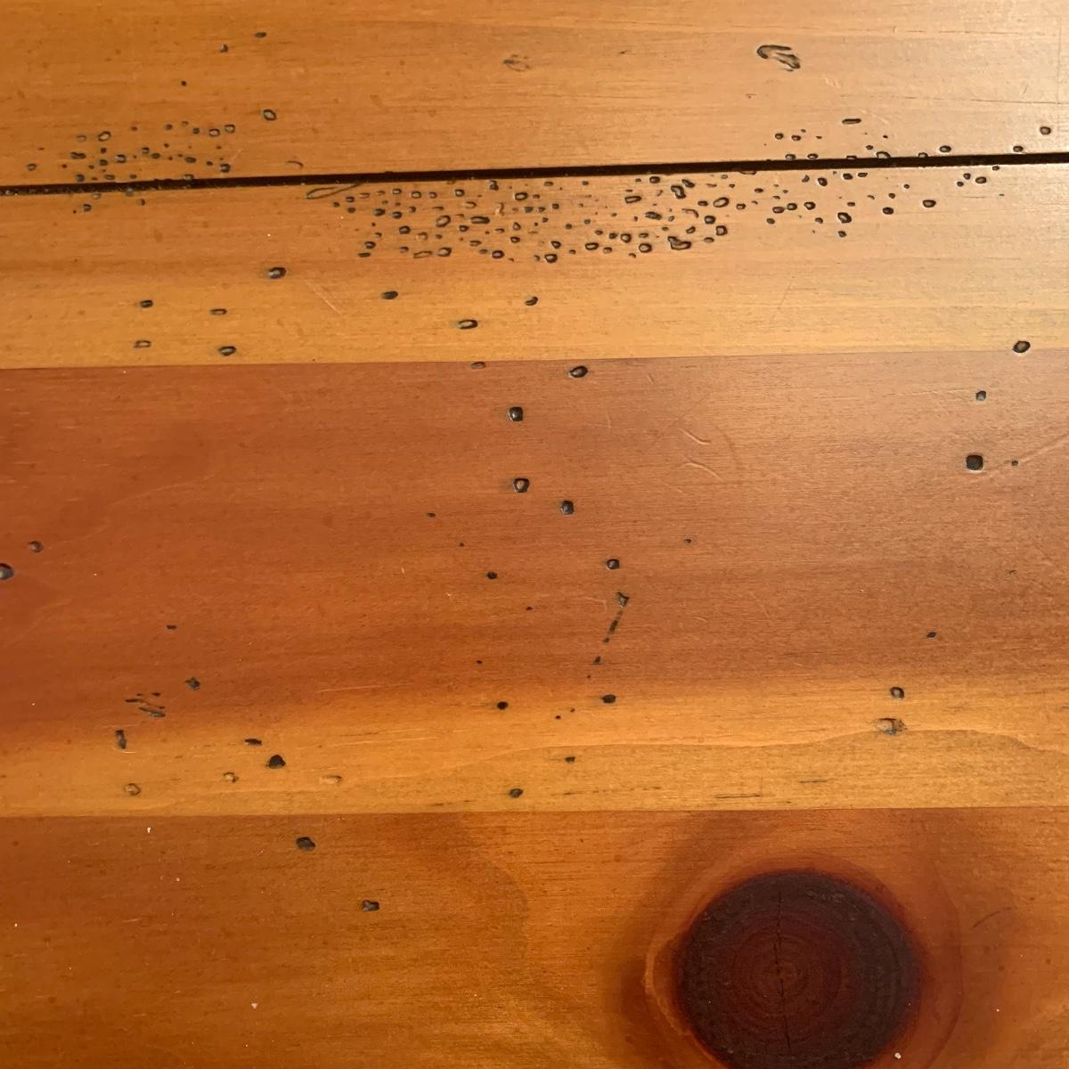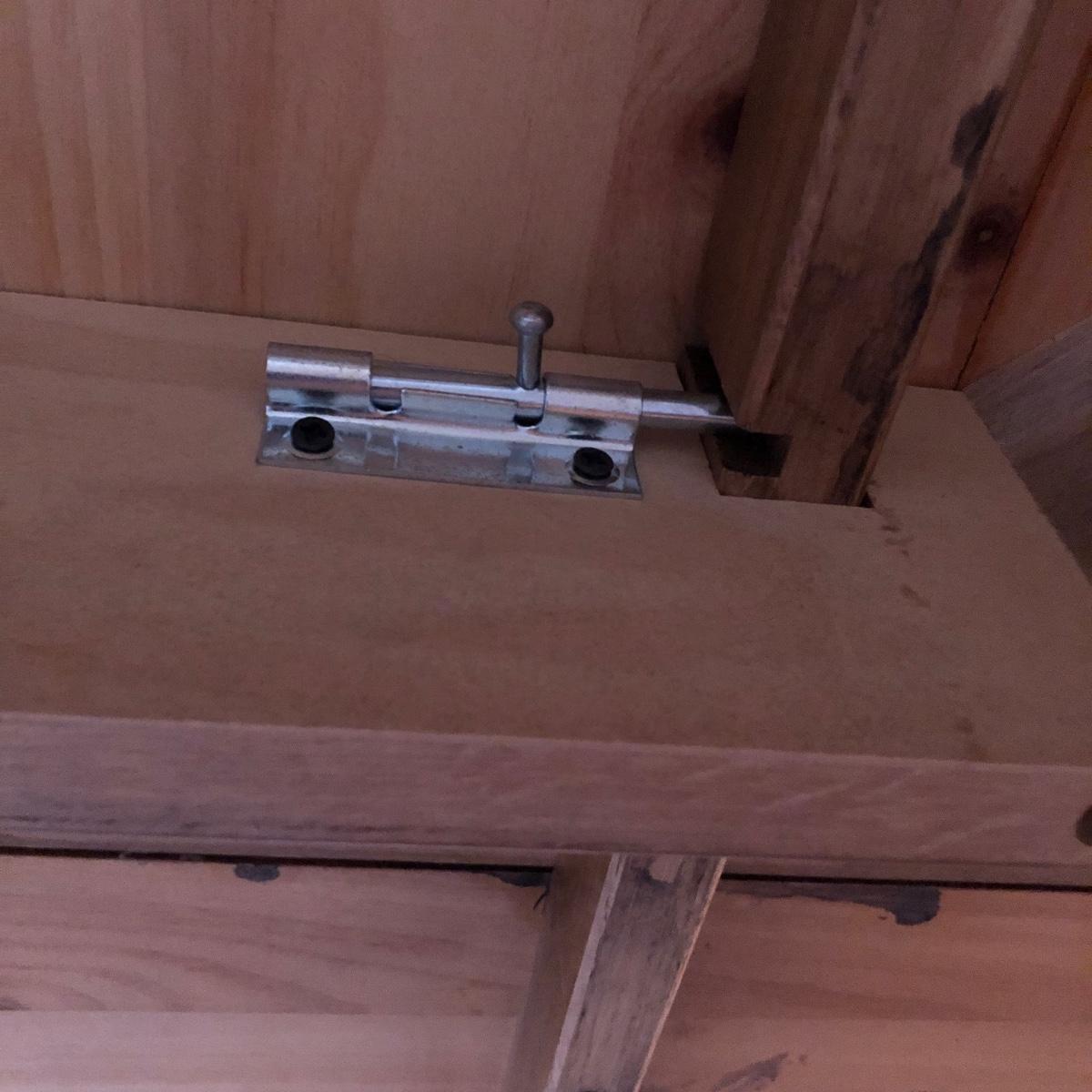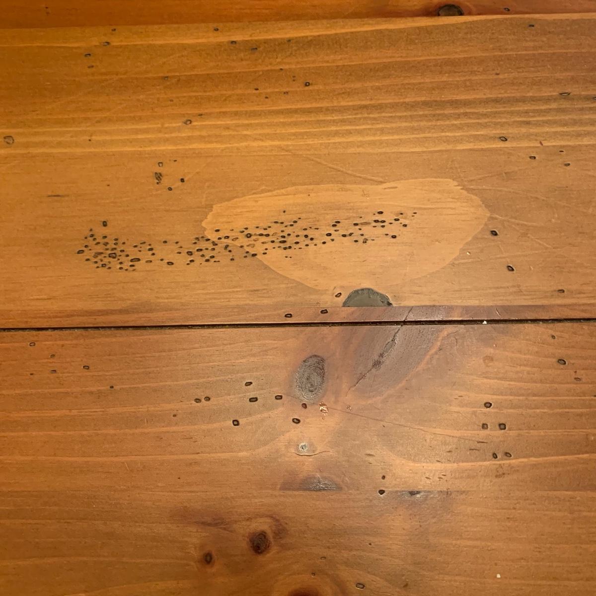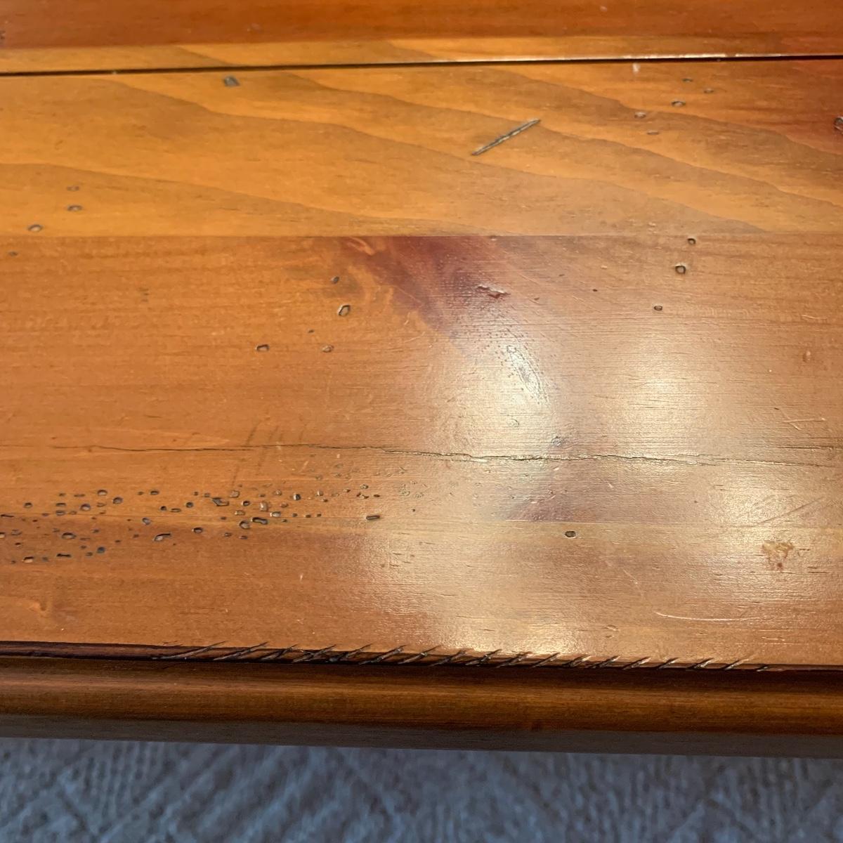 This wooden farm table is absolutely gorgeous! Made of solid distressed pine and has folding end leafs. This table measures 44” X 104” with leaves in and 44” x 68” with leaves removed and is in good condition. Leaves have a latch underneath and pull out to remove.