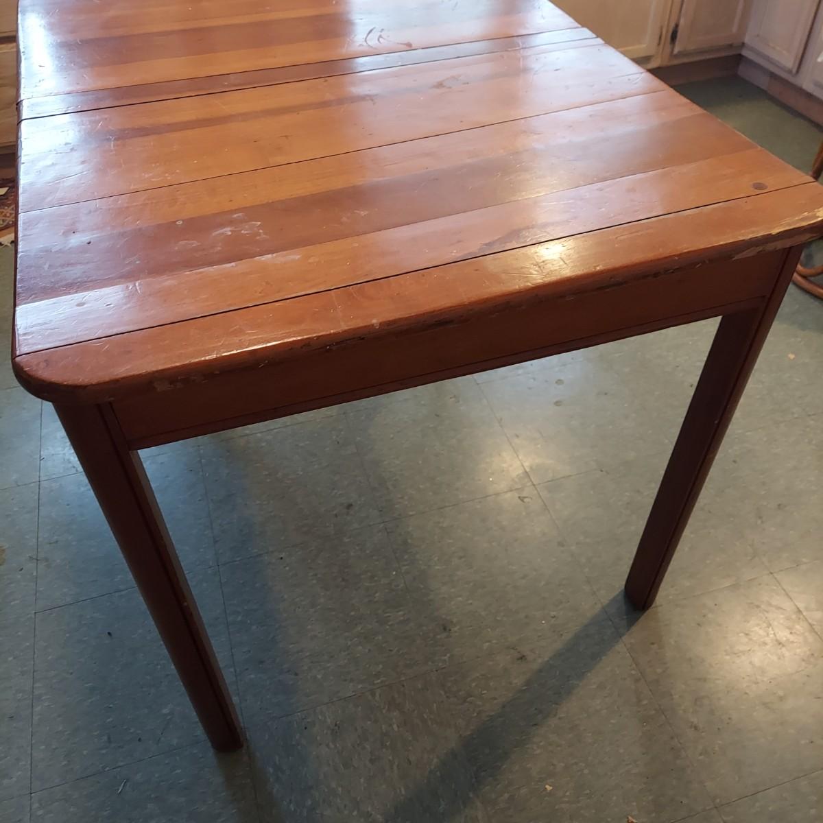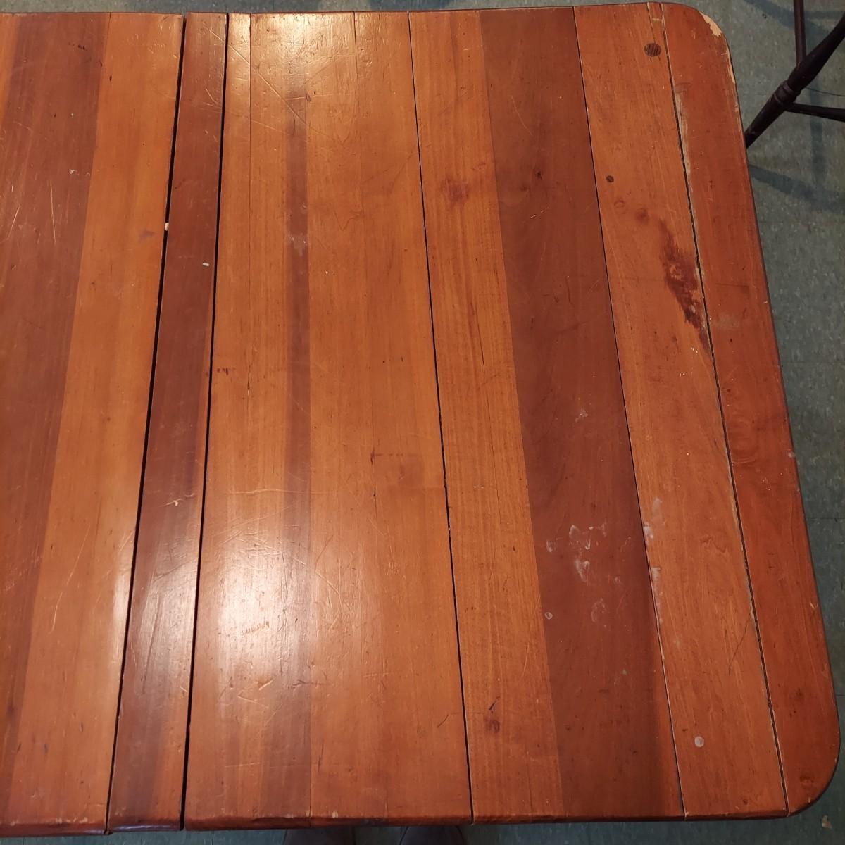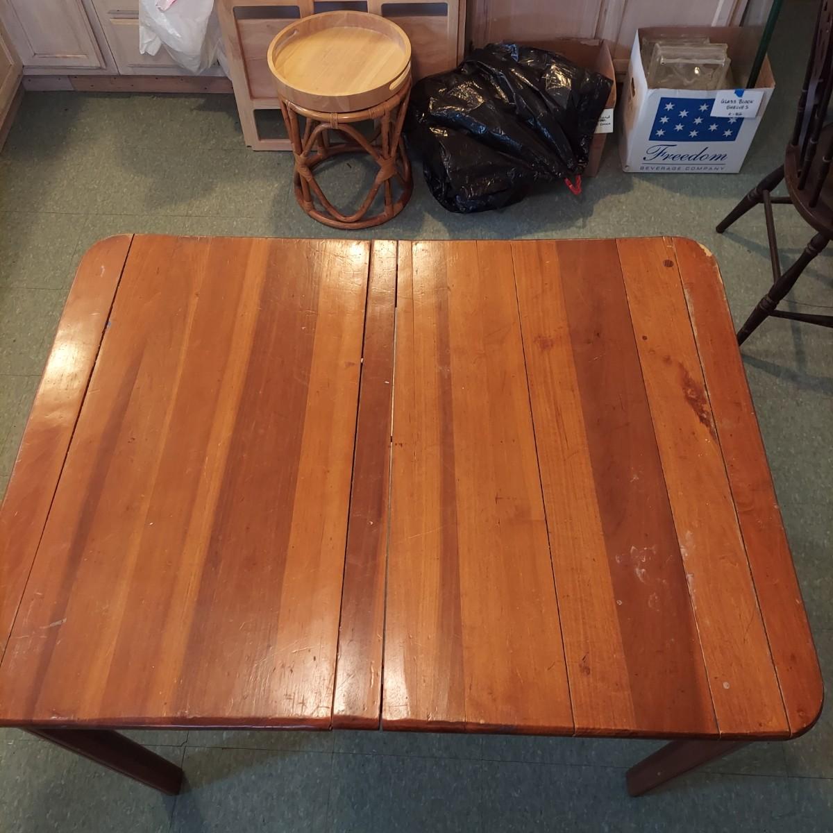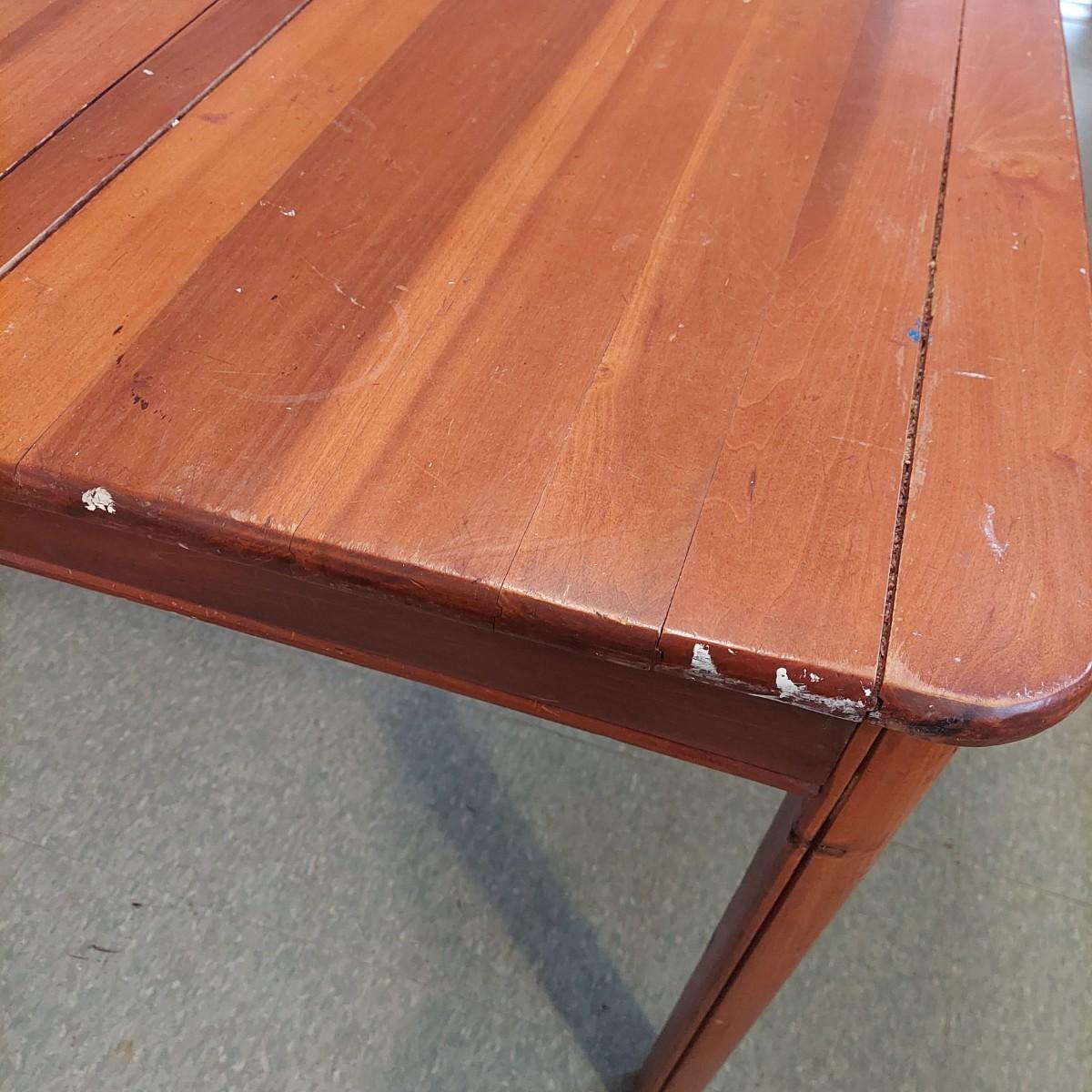 Solid wood table that measures 32” x 42” x 30"H. Some overall wear. Gaps in slats on top. Please see photos for details. Local Pickup Only