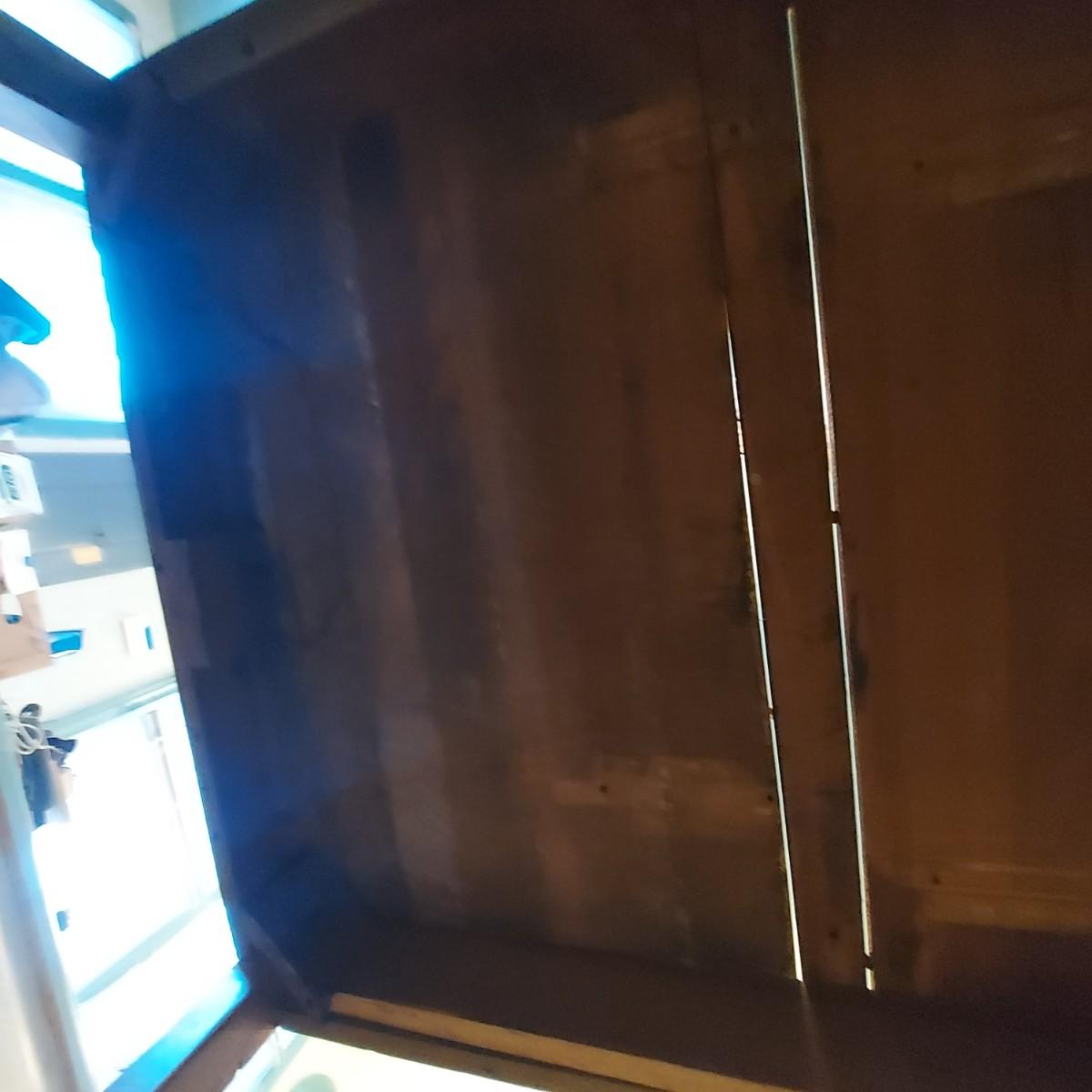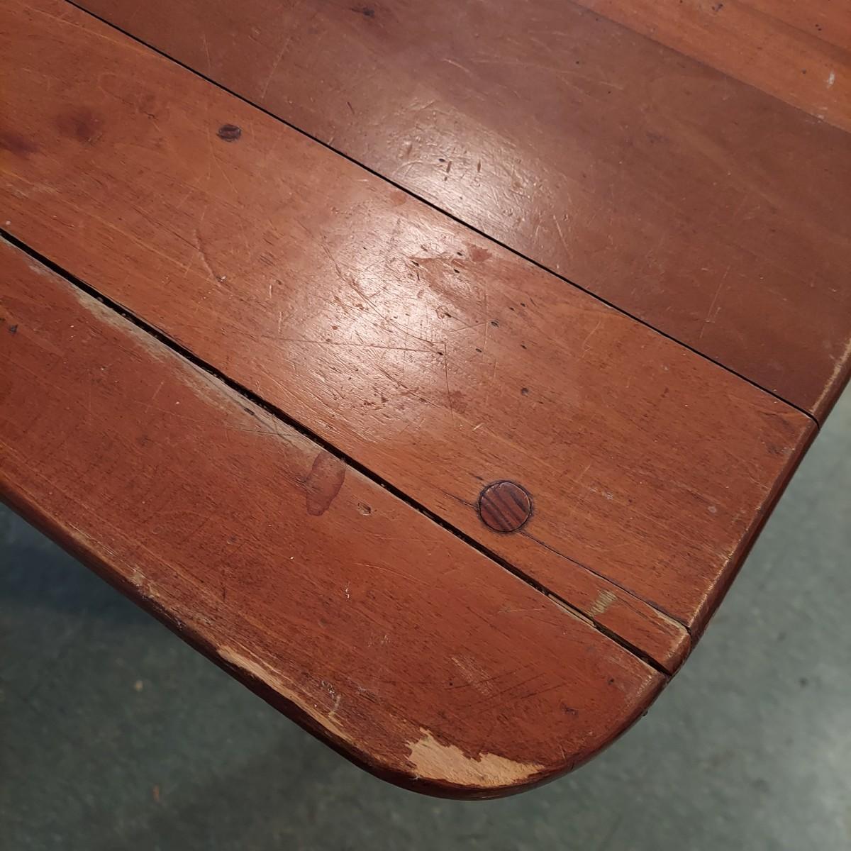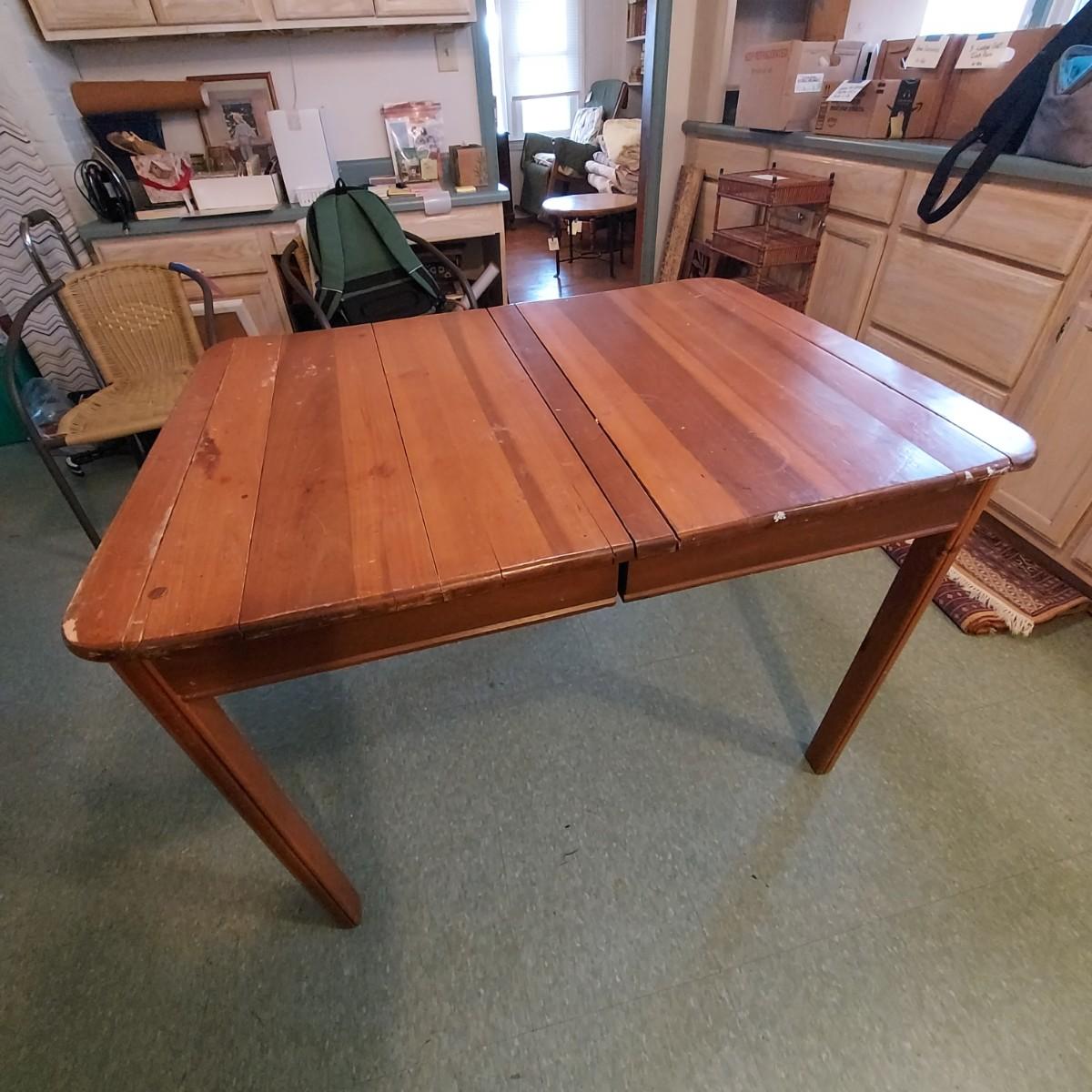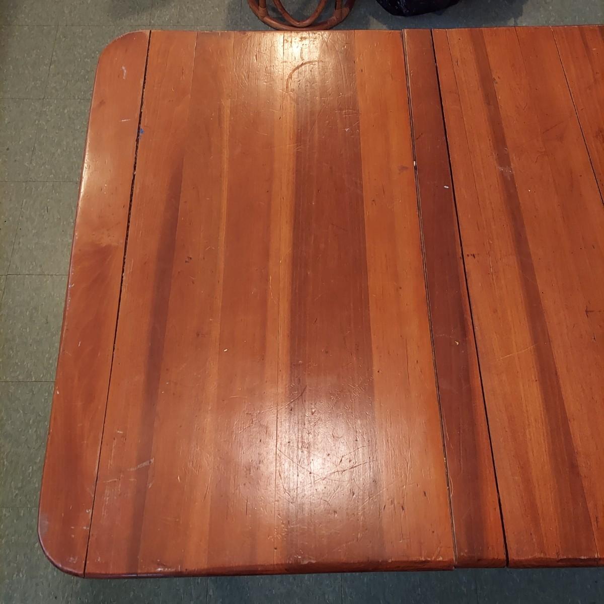 Solid wood table that measures 32” x 42” x 30"H. Some overall wear. Gaps in slats on top. Please see photos for details. Local Pickup Only