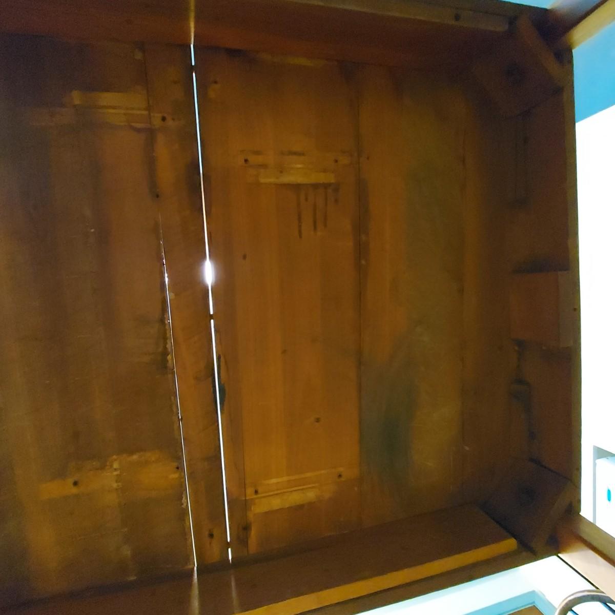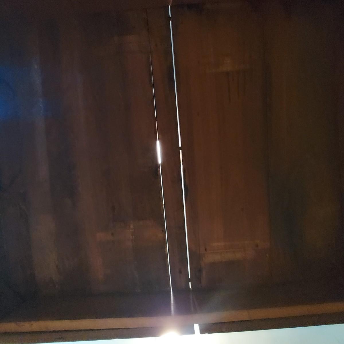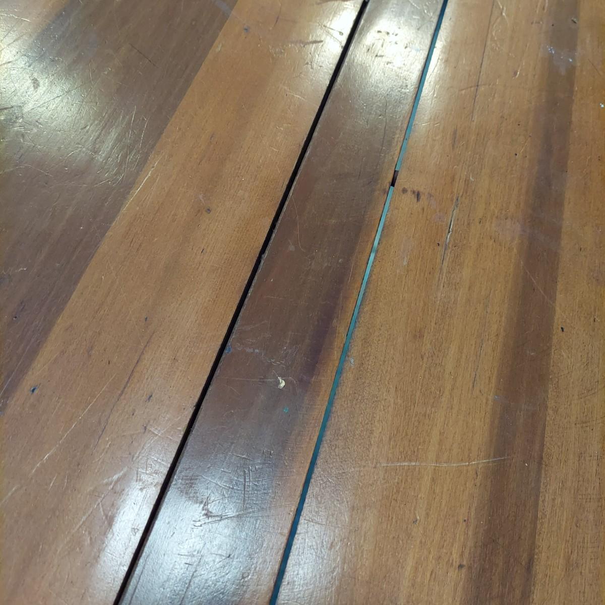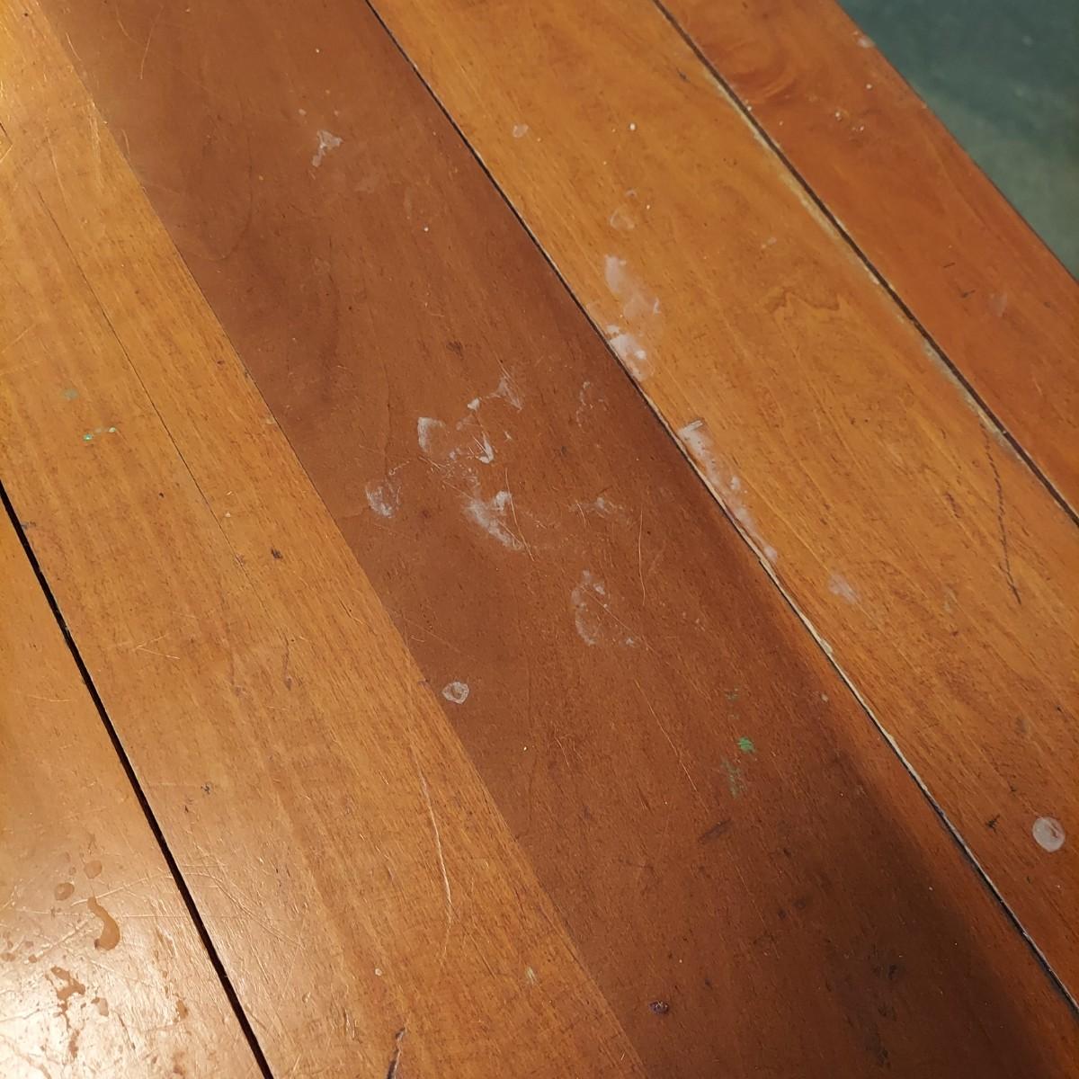 Solid wood table that measures 32” x 42” x 30"H. Some overall wear. Gaps in slats on top. Please see photos for details. Local Pickup Only