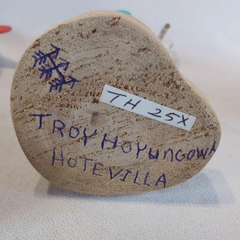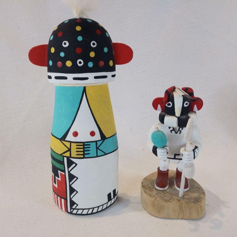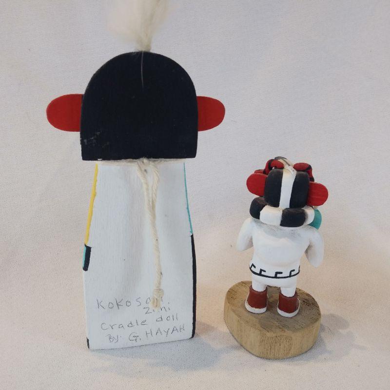 Two very nice hand-carved and hand-painted wooden figures. Made for the tourist trade and sold in Alaska to our client. The man with a staff measures 2 1/4-inches tall X 4 1/2-inches in diameter and is signed Troy Hoyun Gowa-Hotevilla. The tall figure is marked a Cradel Doll, "Kolosori Zuni" by G. Hayah It measures 8-inches tall with hair X 2 1/2-inches wide. Both are in very good condition and will be a nice addition to your collection of Native American art.