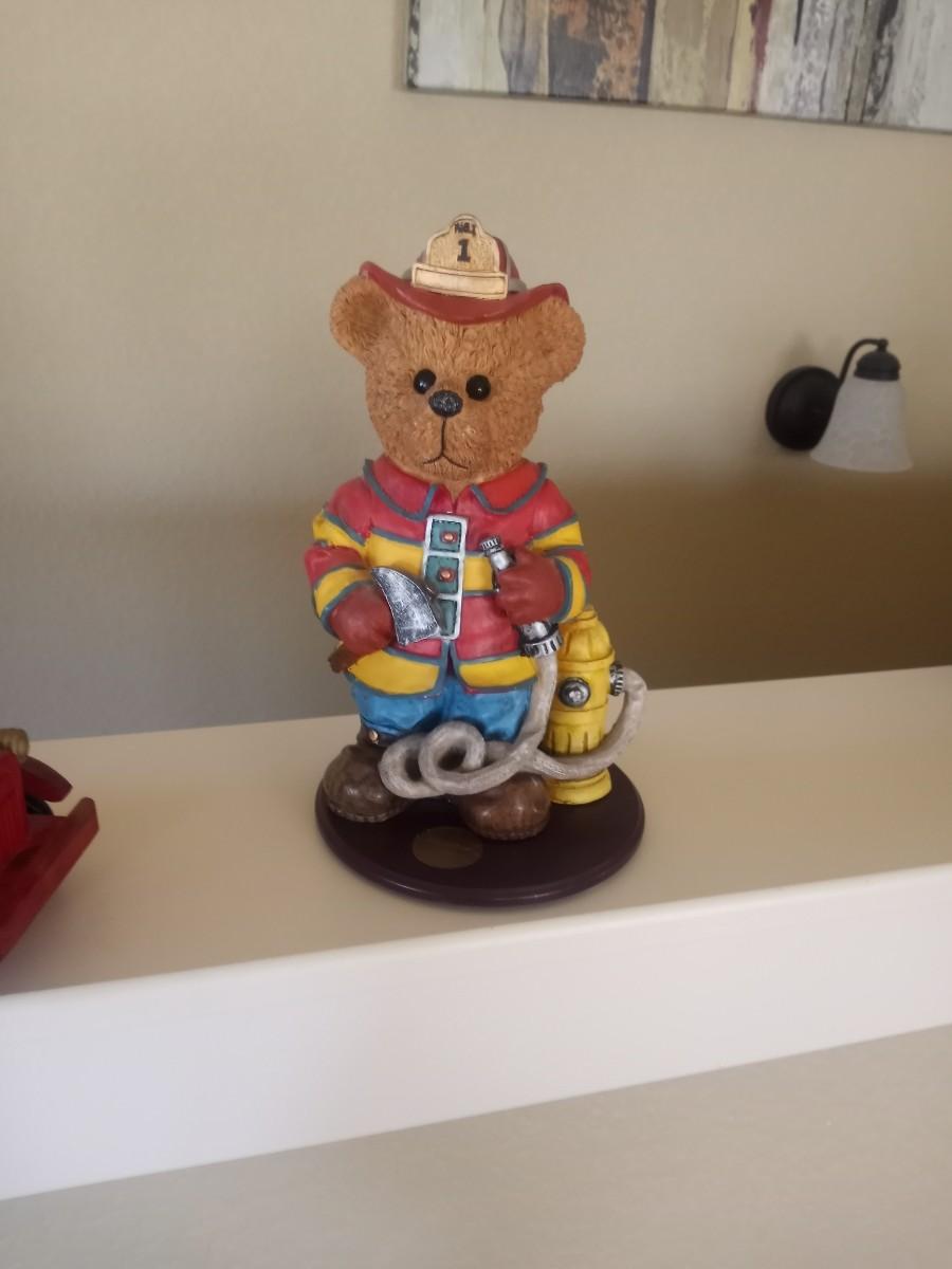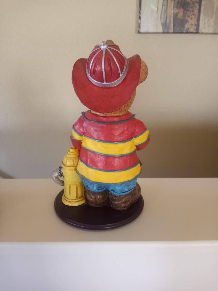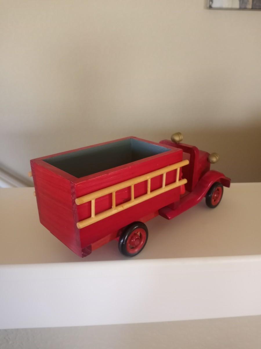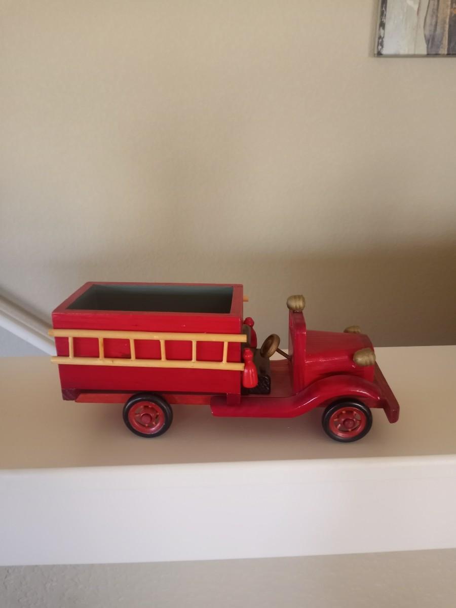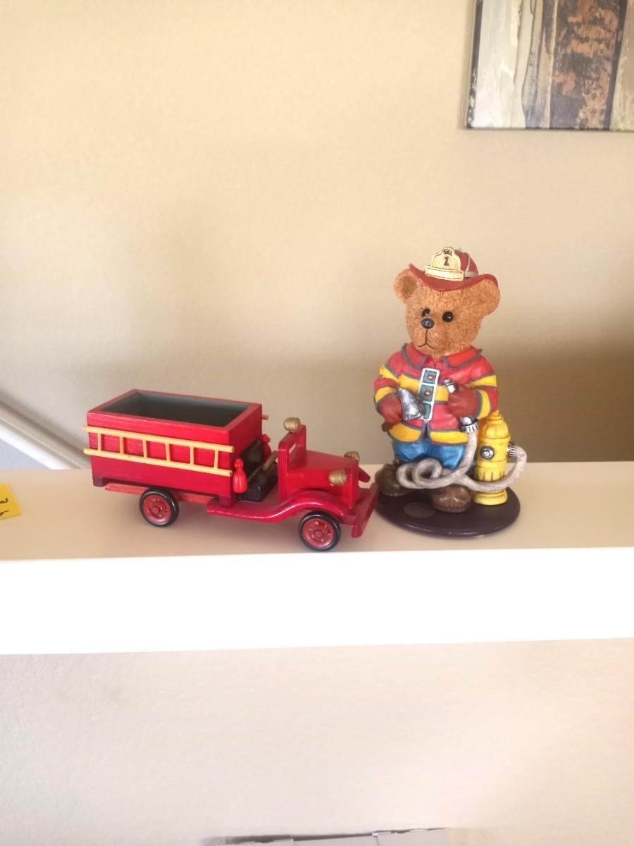 WOODEN FIRETRUCK APPROX. 10: LONG LADDERS ARE REMOVABLE AND BEAR FIREMAN FIGURINE APPROX. 10" TALL
