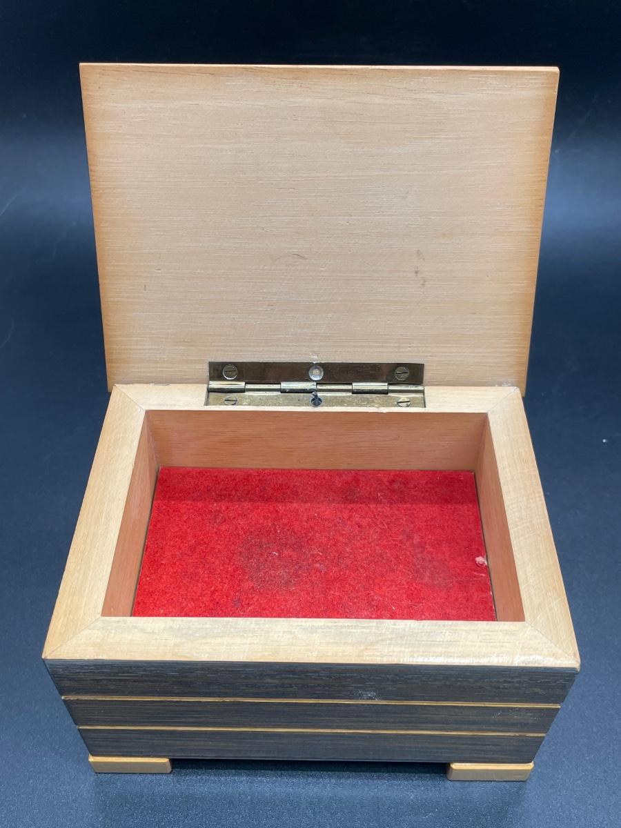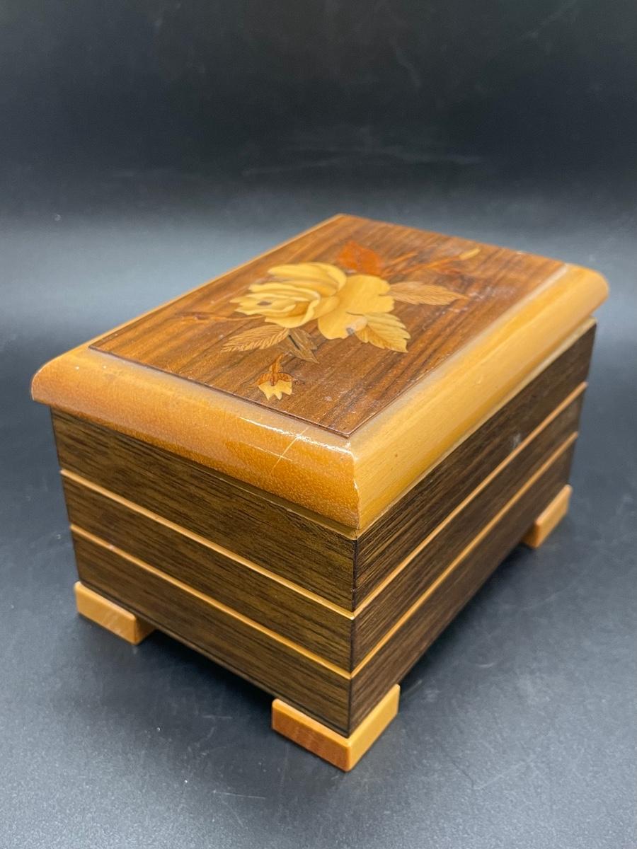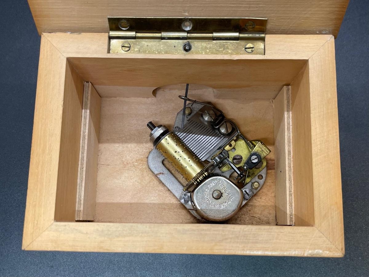 Item is in good condition. The bottoms of the jewelry box comes out very easily and is loose. Underneath it is the music player that doesn’t work. The box was made in Germany, the player in Switzerland.