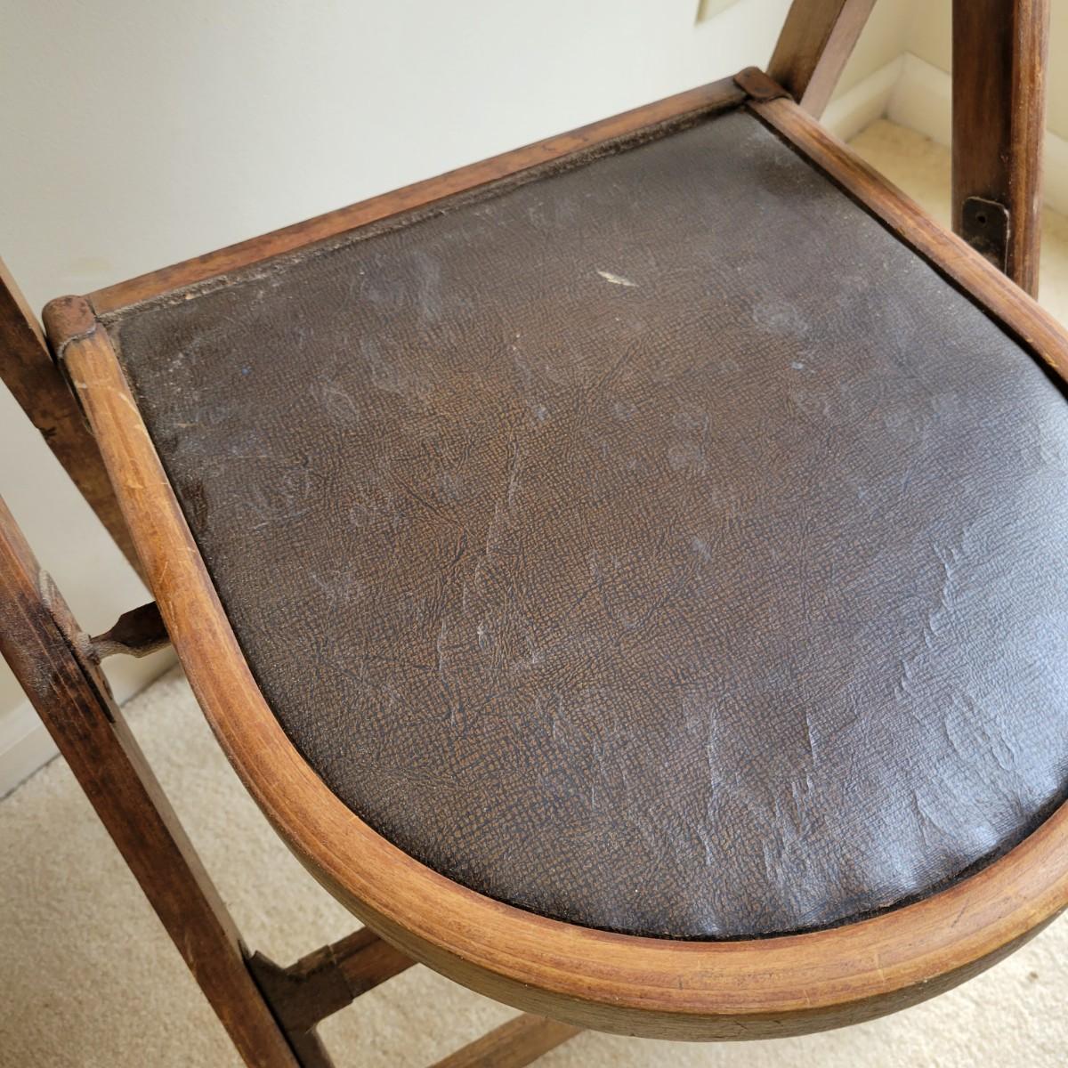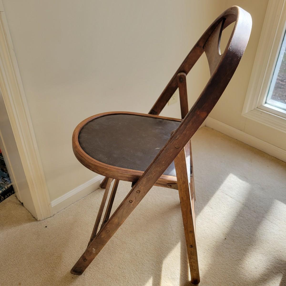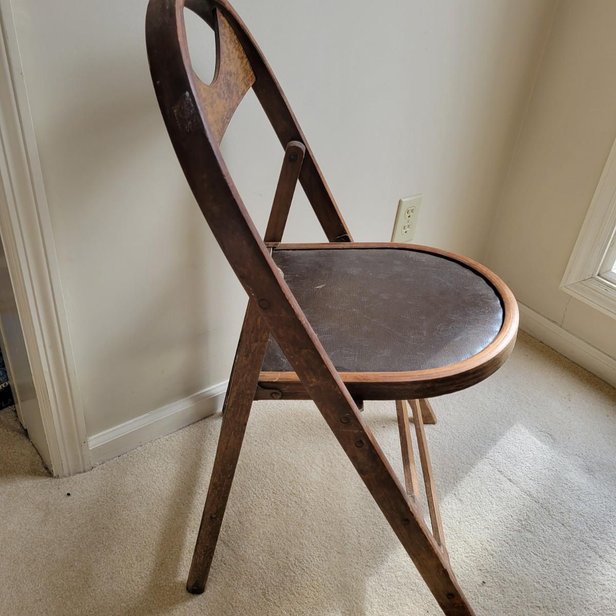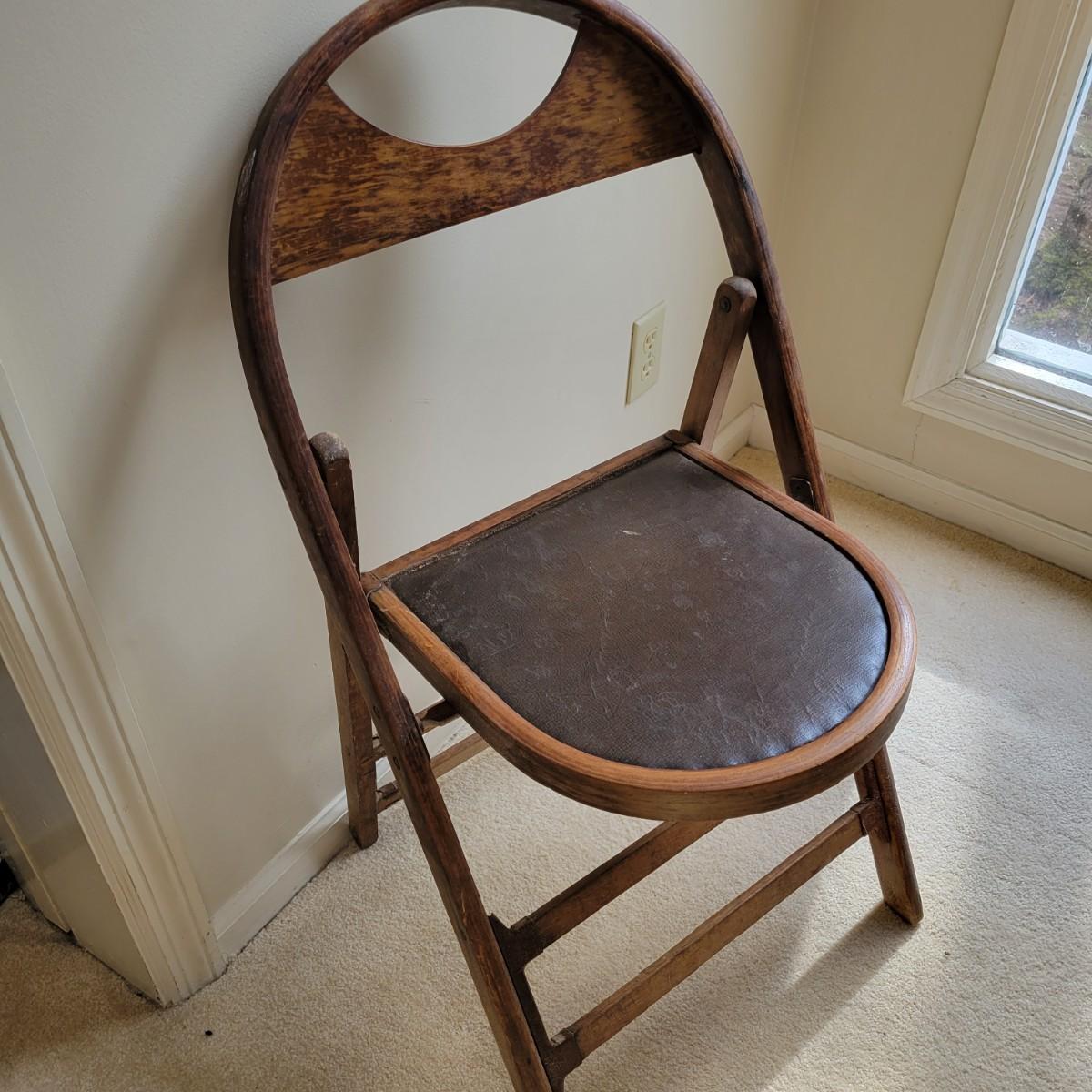 An older wooden folding chair in good condition with some minor blemishes. This chair is all wood with a faux leather seat cover and iron hardware. The address on the bottom of the chair is for a funeral home located in Waterbury, CT. Measures approximately 18" x 18" x 33" with a seat height of 18". Local pickup only