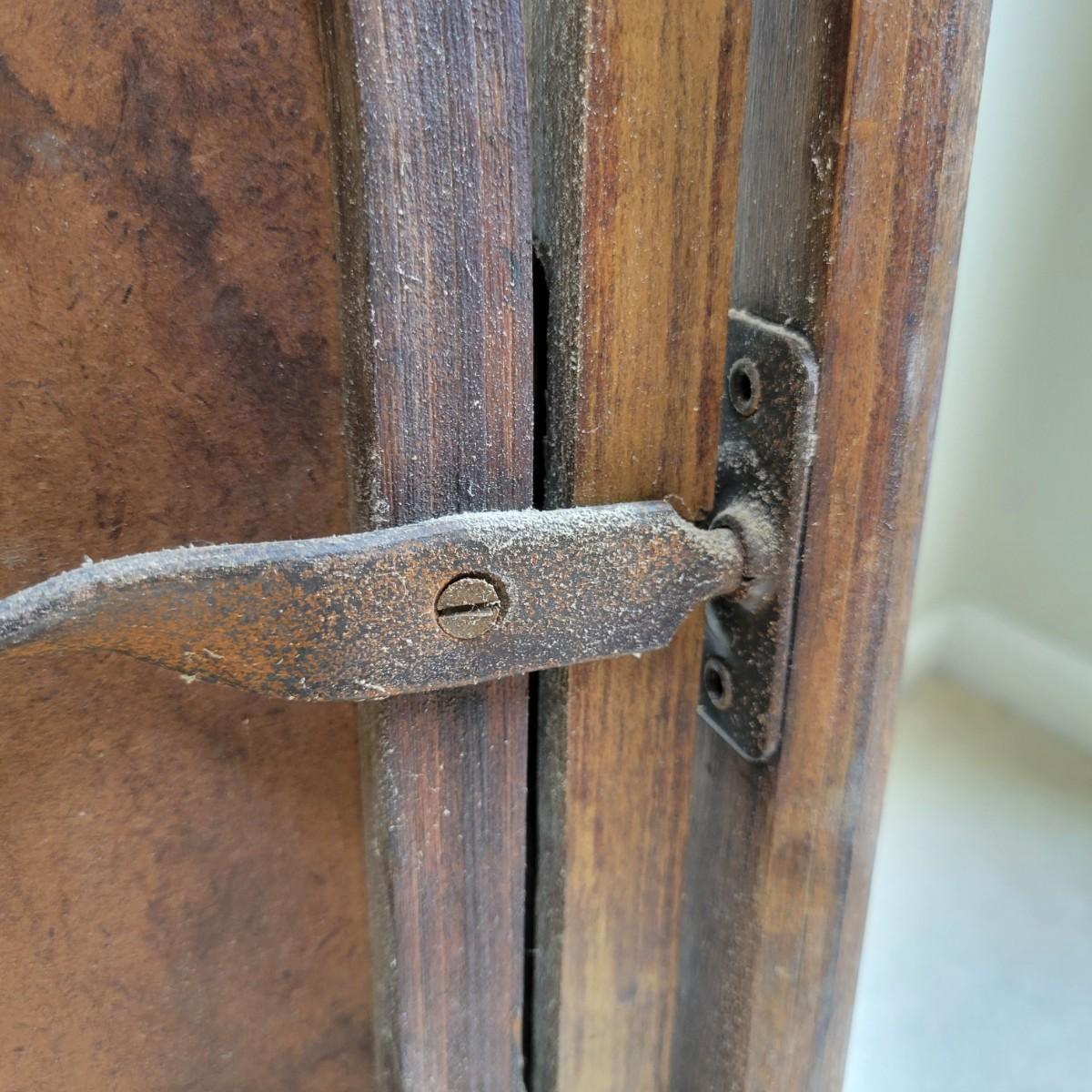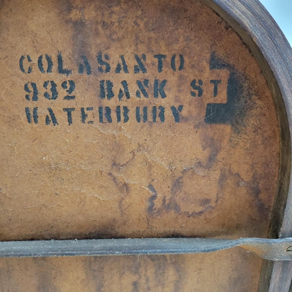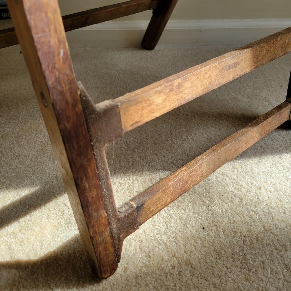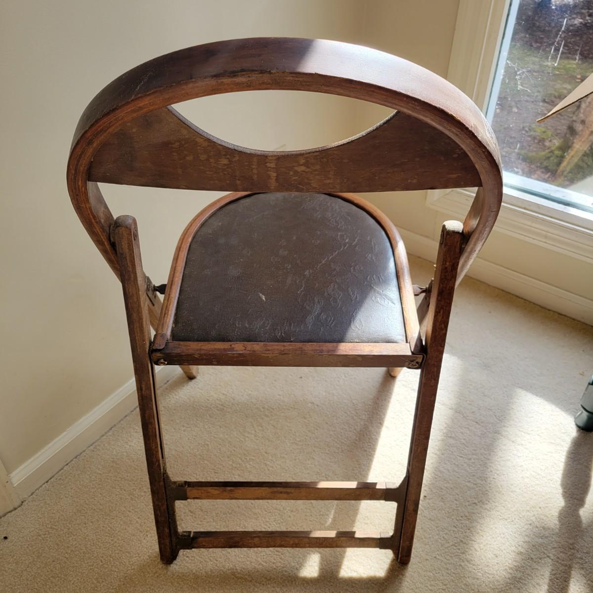 An older wooden folding chair in good condition with some minor blemishes. This chair is all wood with a faux leather seat cover and iron hardware. The address on the bottom of the chair is for a funeral home located in Waterbury, CT. Measures approximately 18" x 18" x 33" with a seat height of 18". Local pickup only