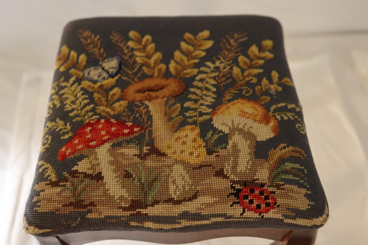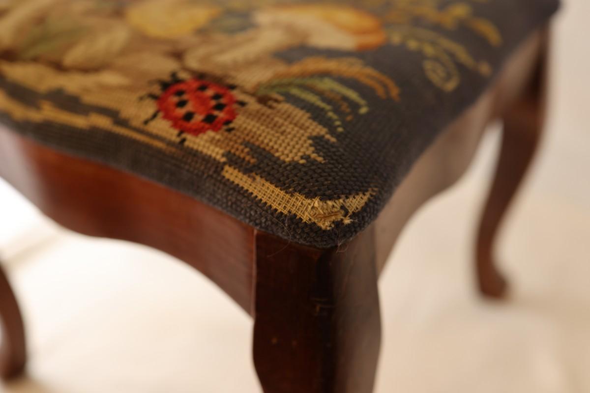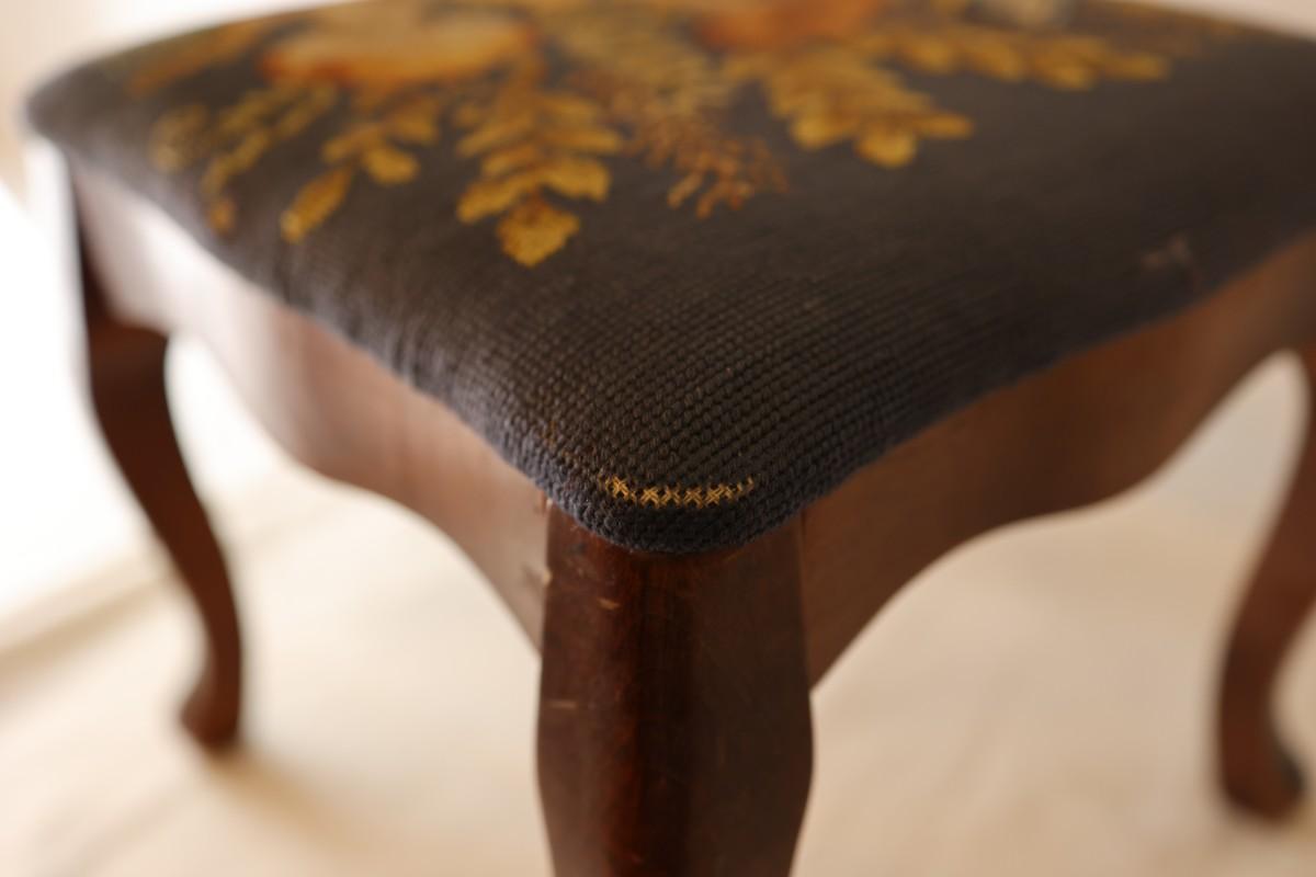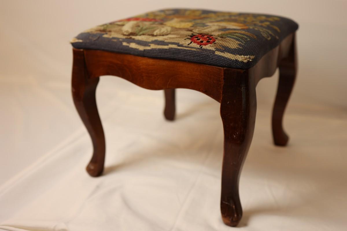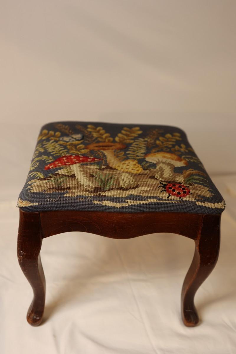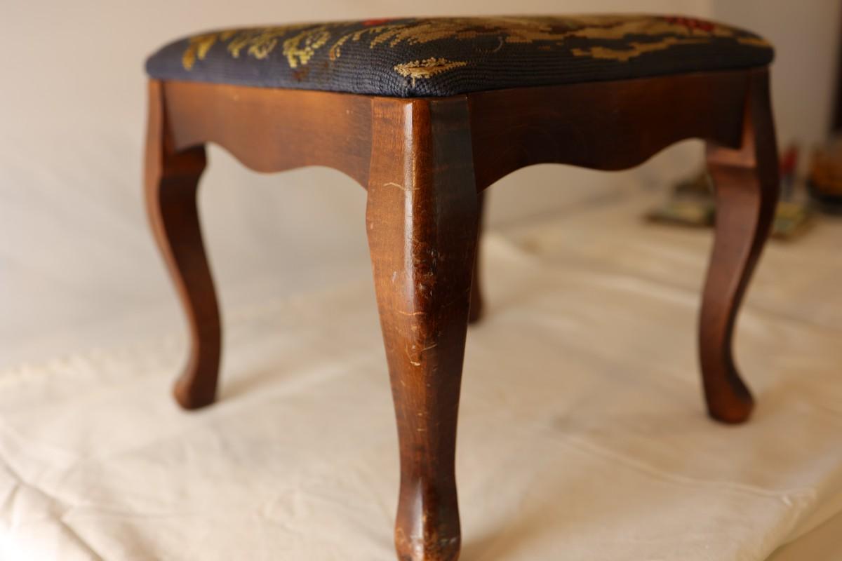 Wood Queen Anne style legs with vintage tapestry top. Some wear on the edges of tapestry, see pics.
