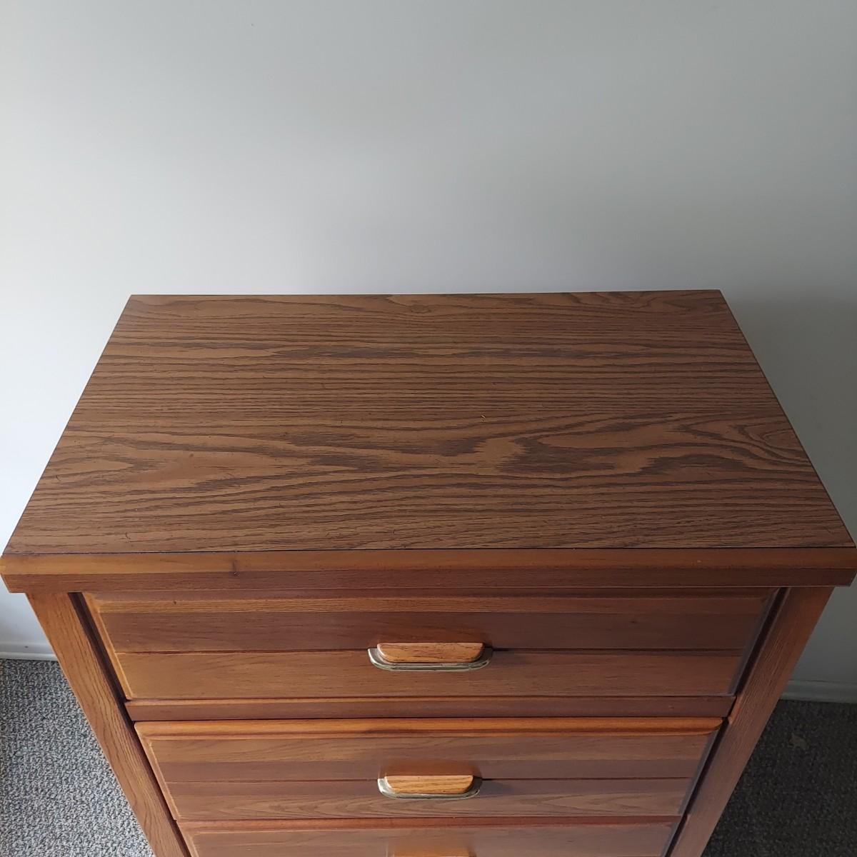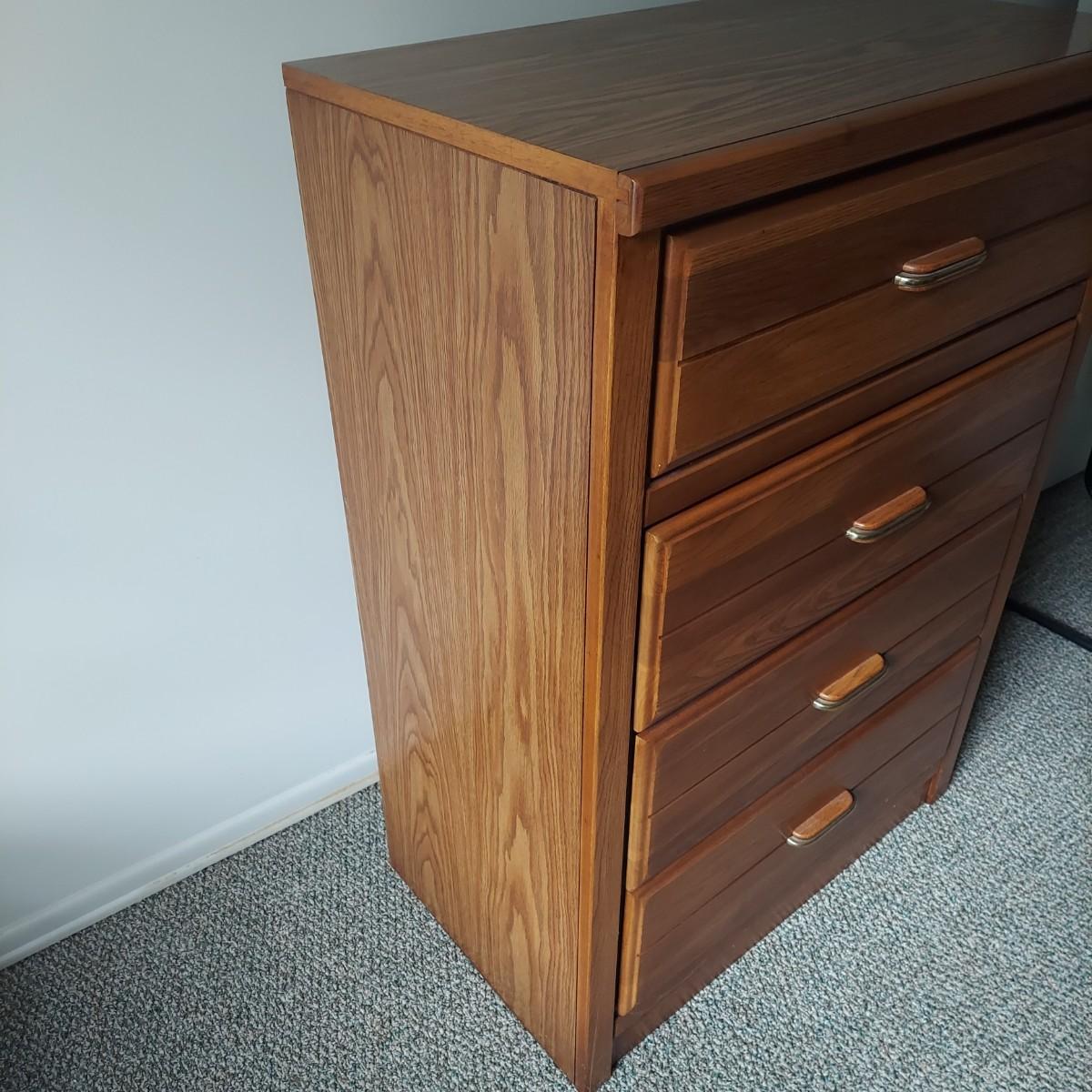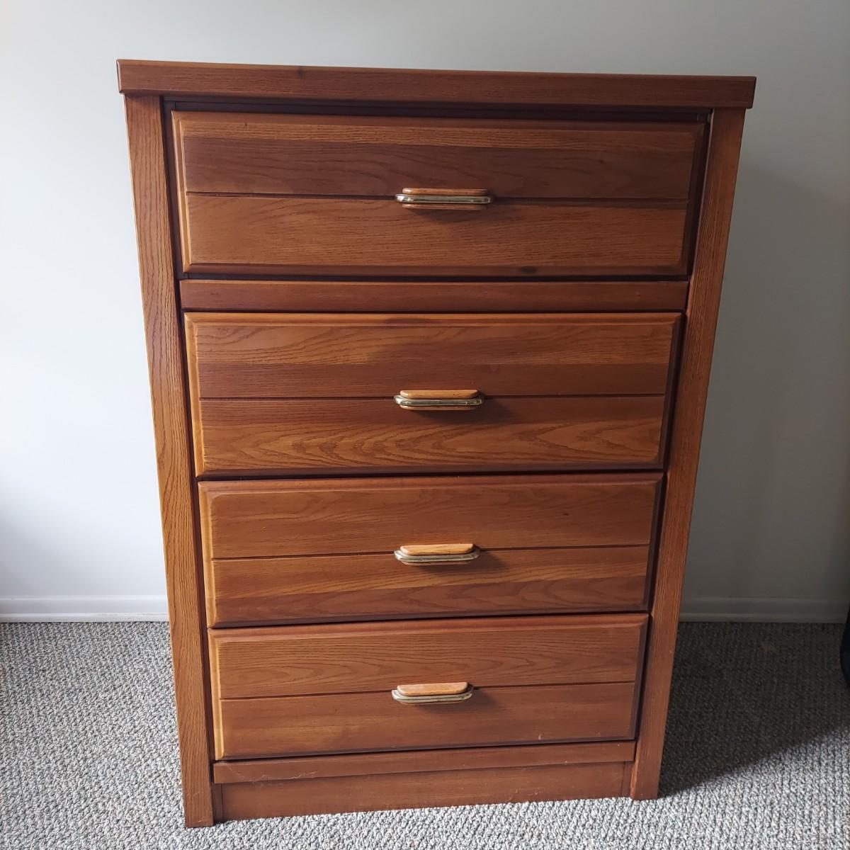 A four drawer dresser that appears to be made of wood with faux oak veneer. Made by Lea "The Bedroom People". Measures 30" x 18" x 43"H.