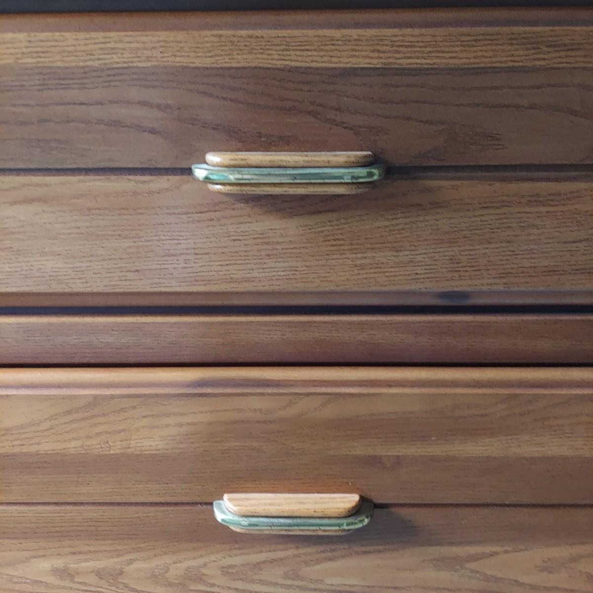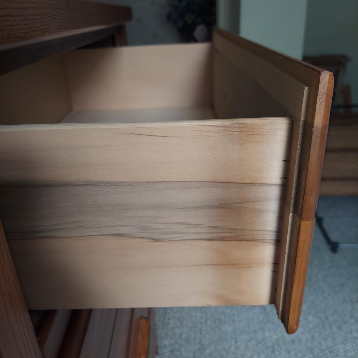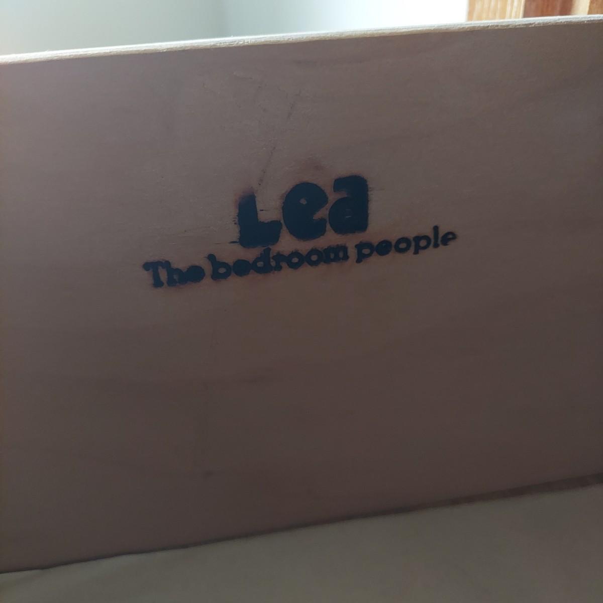 A four drawer dresser that appears to be made of wood with faux oak veneer. Made by Lea "The Bedroom People". Measures 30" x 18" x 43"H.
