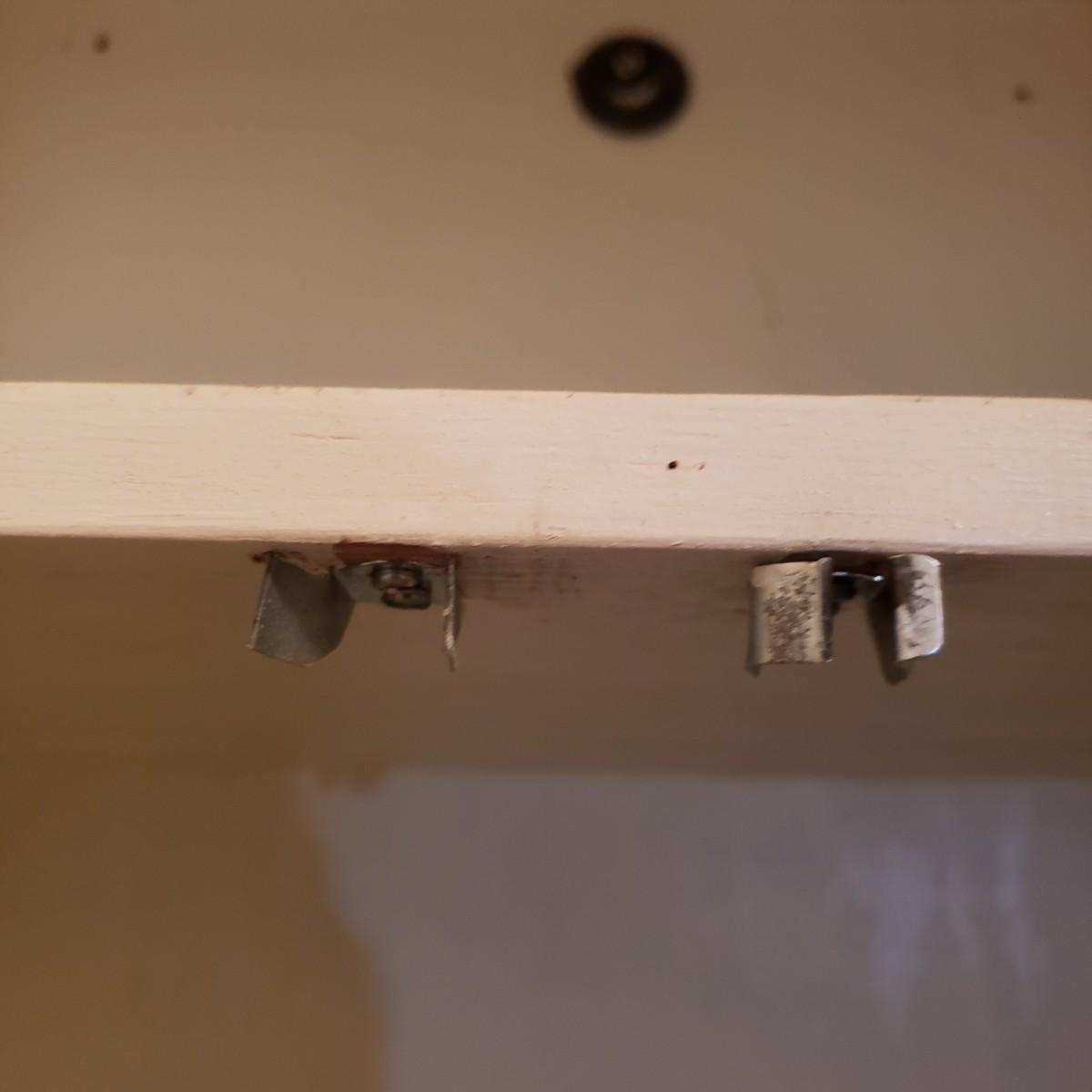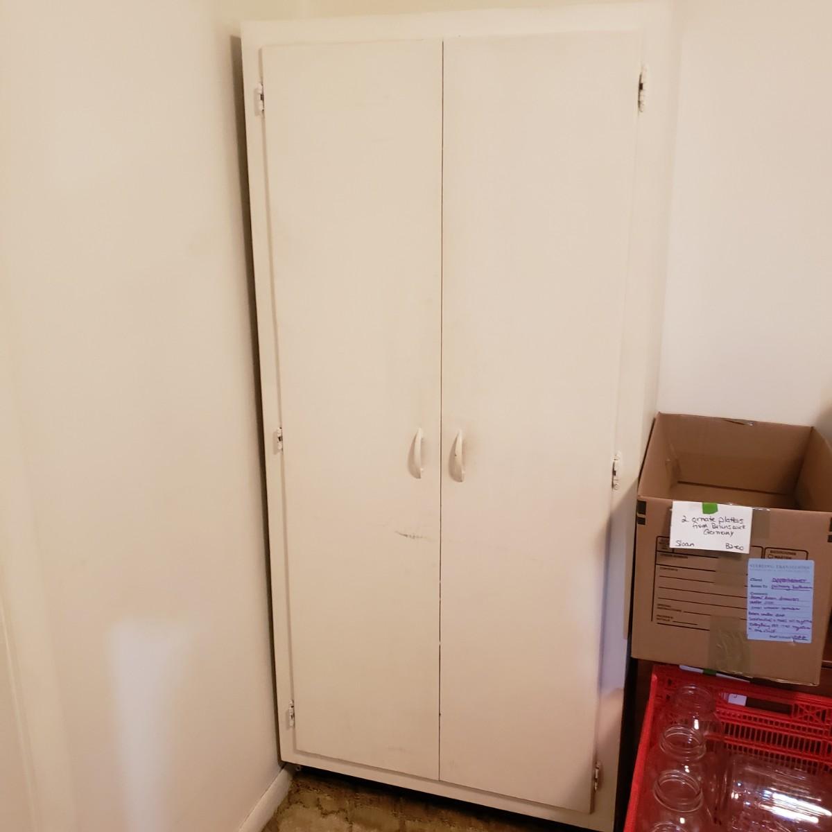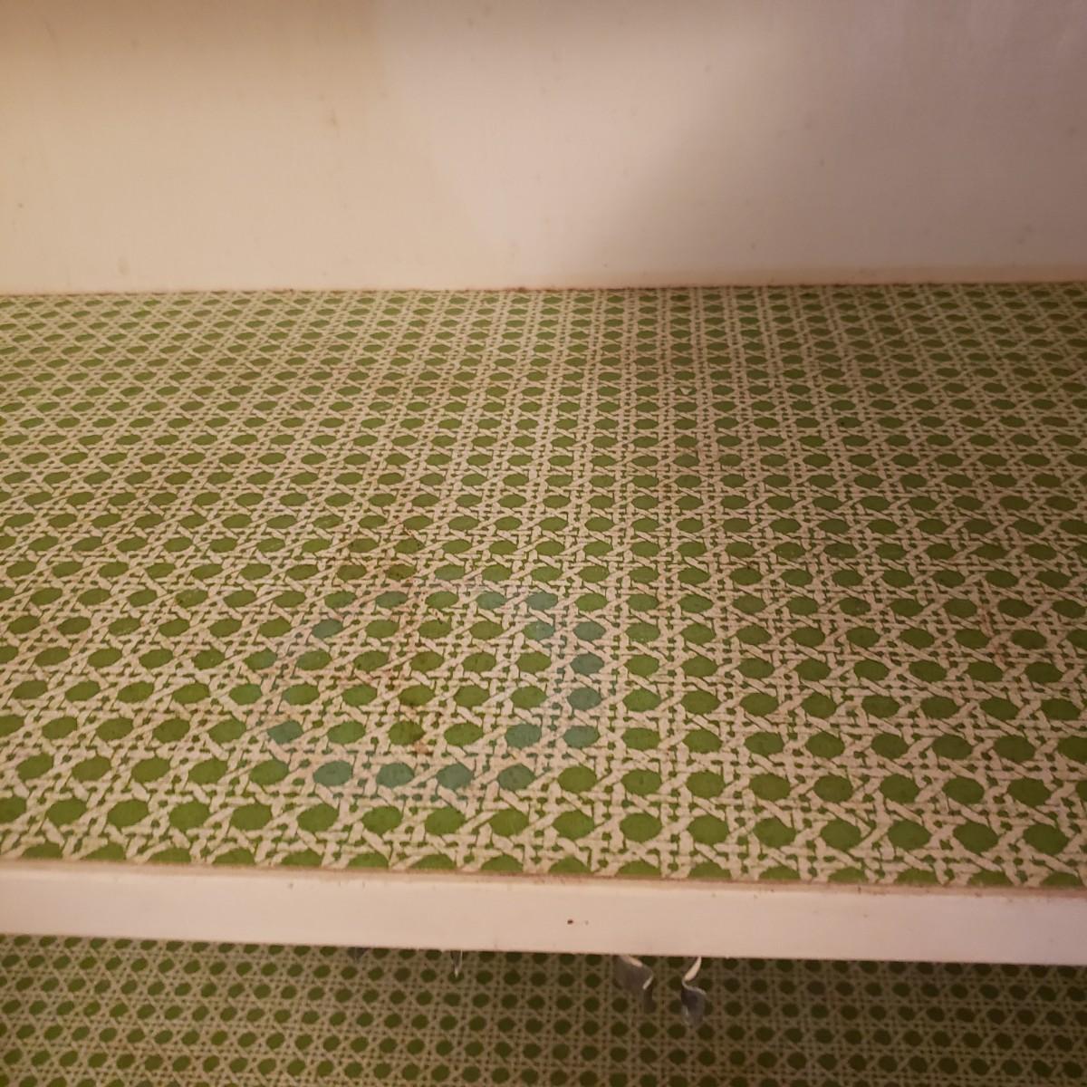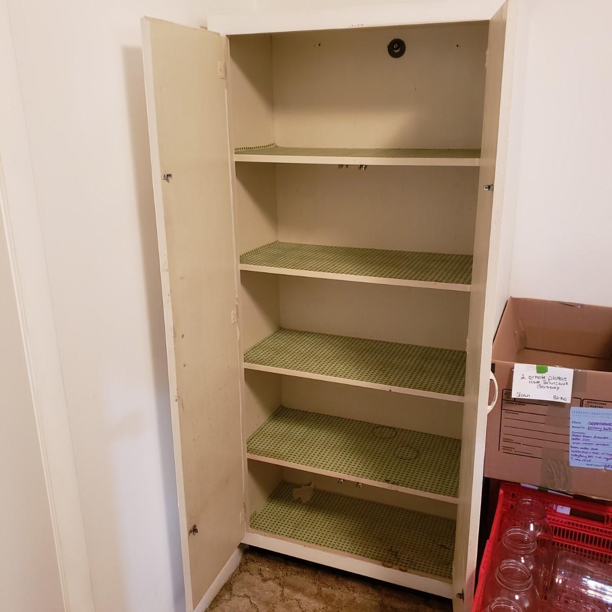 This old school wooden cupboard was used to house canning supplies! The cupboard measures 30" x 14" x 66"H. It is currently mounted to the wall, so please bring a screw driver, see picture. The green contact paper has some spots, see pictures. The height of each shelf is approximately 11". This is a great storage unit!