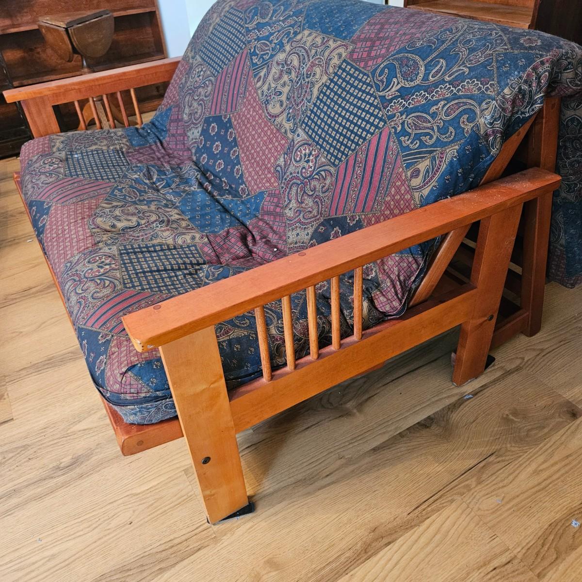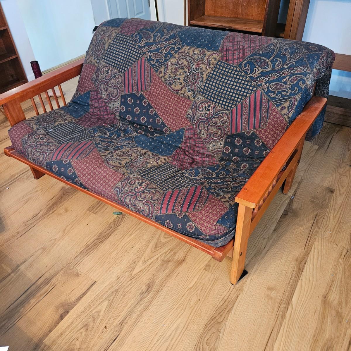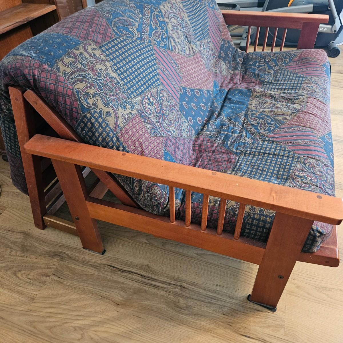 A wooden futon frame and mattress that folds out to a full size bed. Laid flat, it measures approximately 60" x 75" x 22"H with a mattress height of 17". Local pickup only. One of the slats on the backside is bowing away from the frame. Winning bidder must bring assistance to help move and load this item due to its weight and/or size. Item is on second floor.