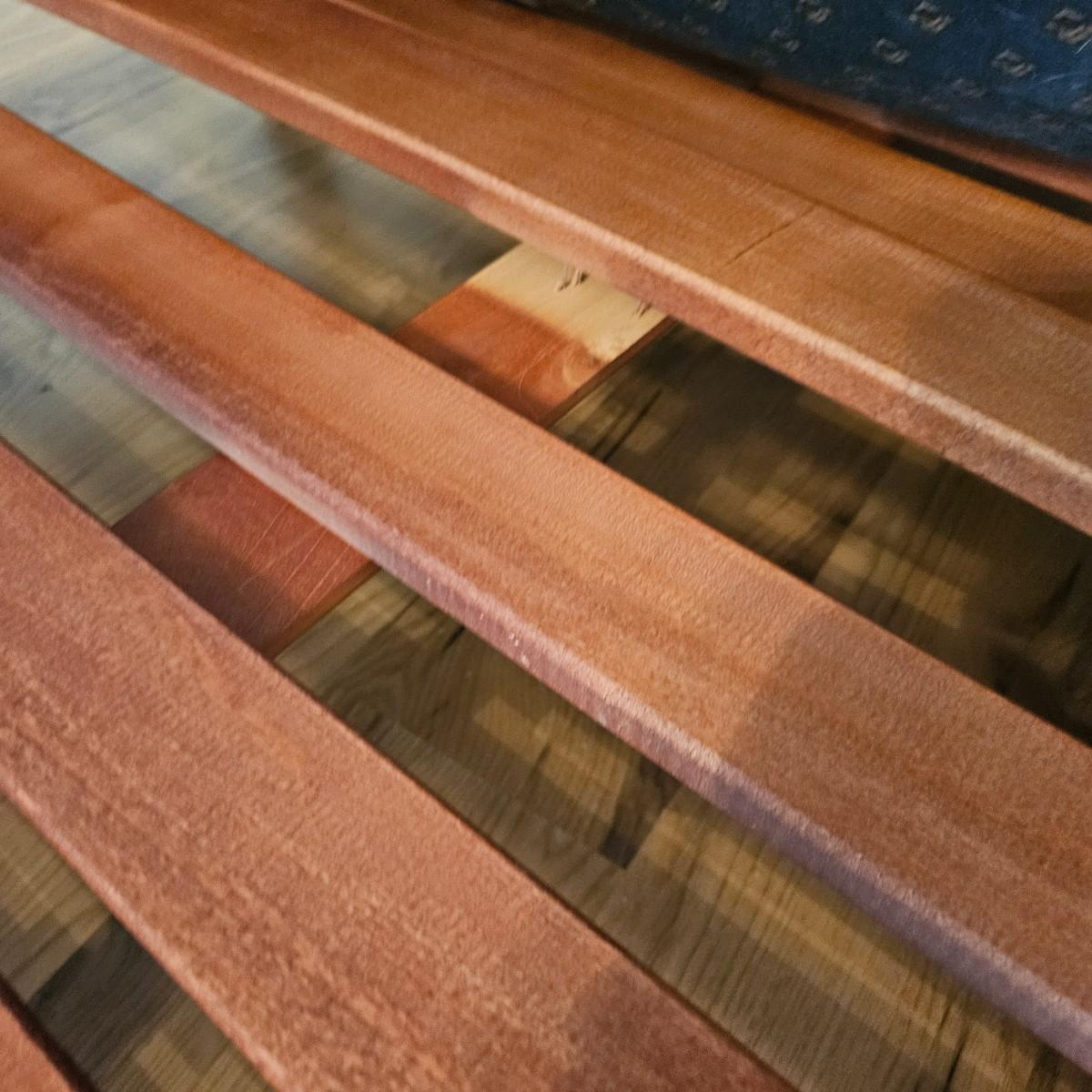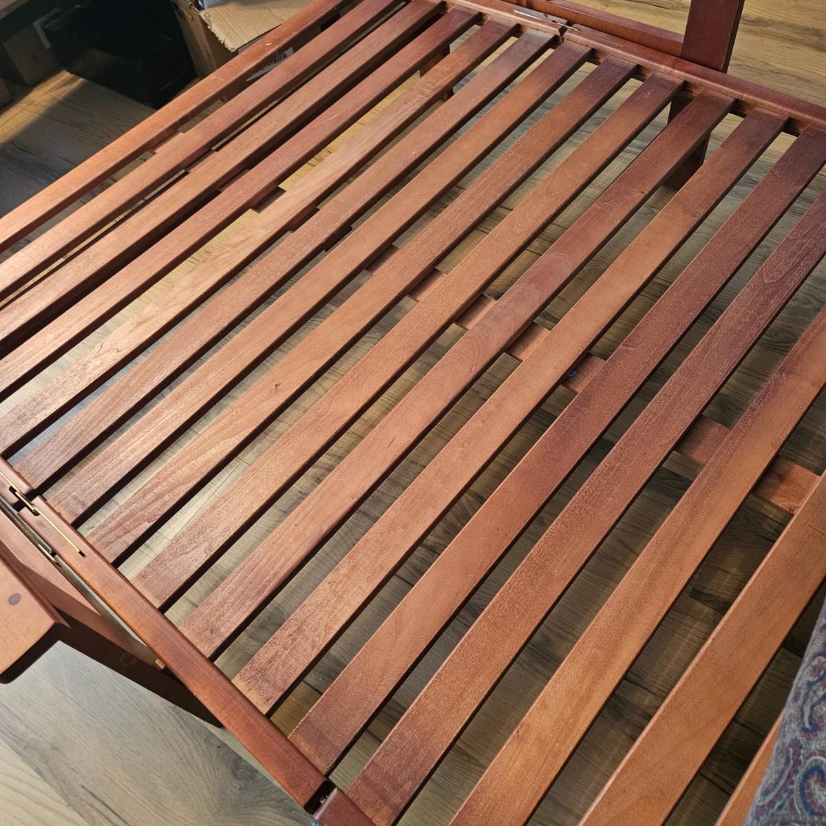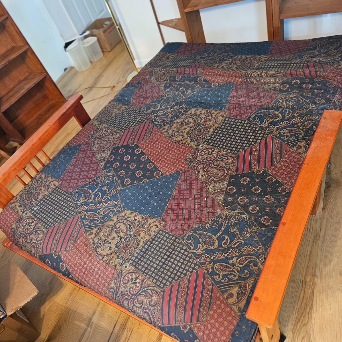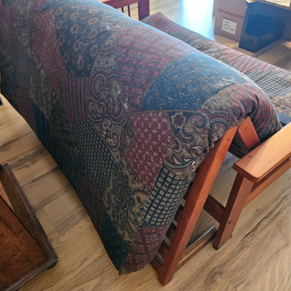 A wooden futon frame and mattress that folds out to a full size bed. Laid flat, it measures approximately 60" x 75" x 22"H with a mattress height of 17". Local pickup only. One of the slats on the backside is bowing away from the frame. Winning bidder must bring assistance to help move and load this item due to its weight and/or size. Item is on second floor.
