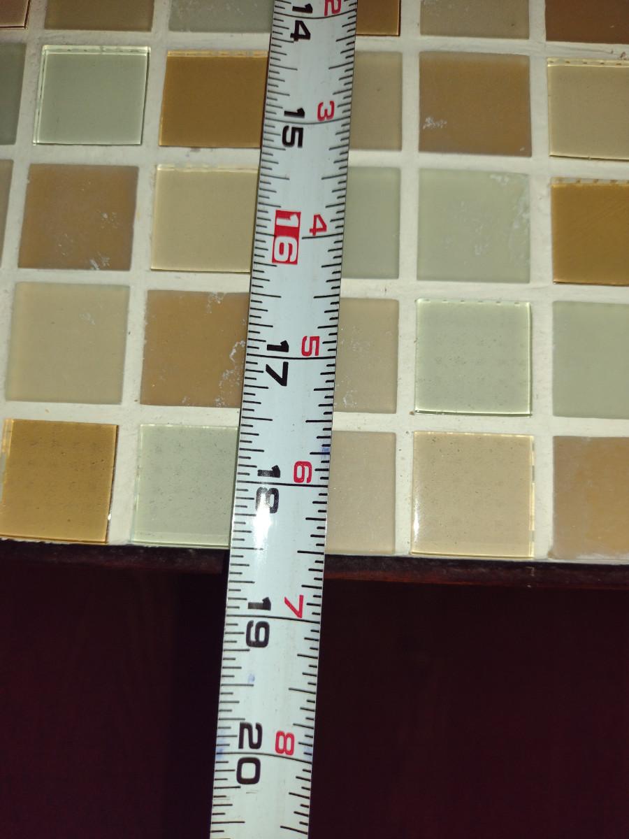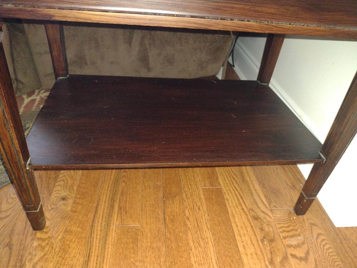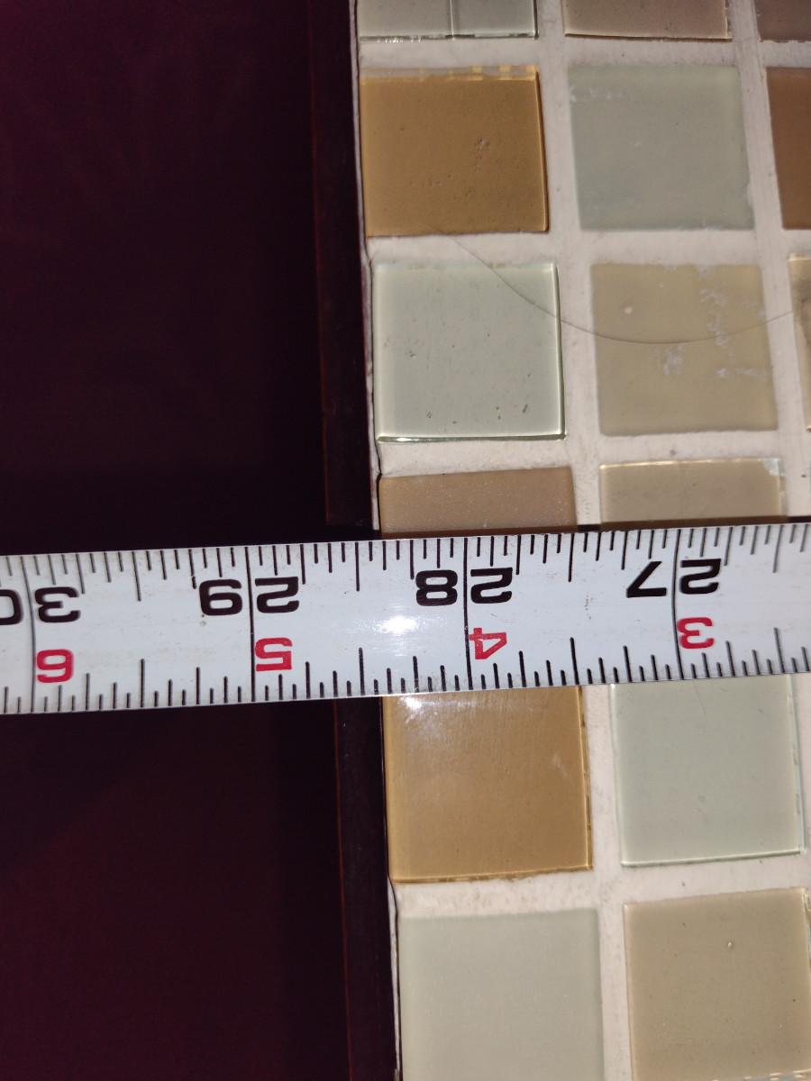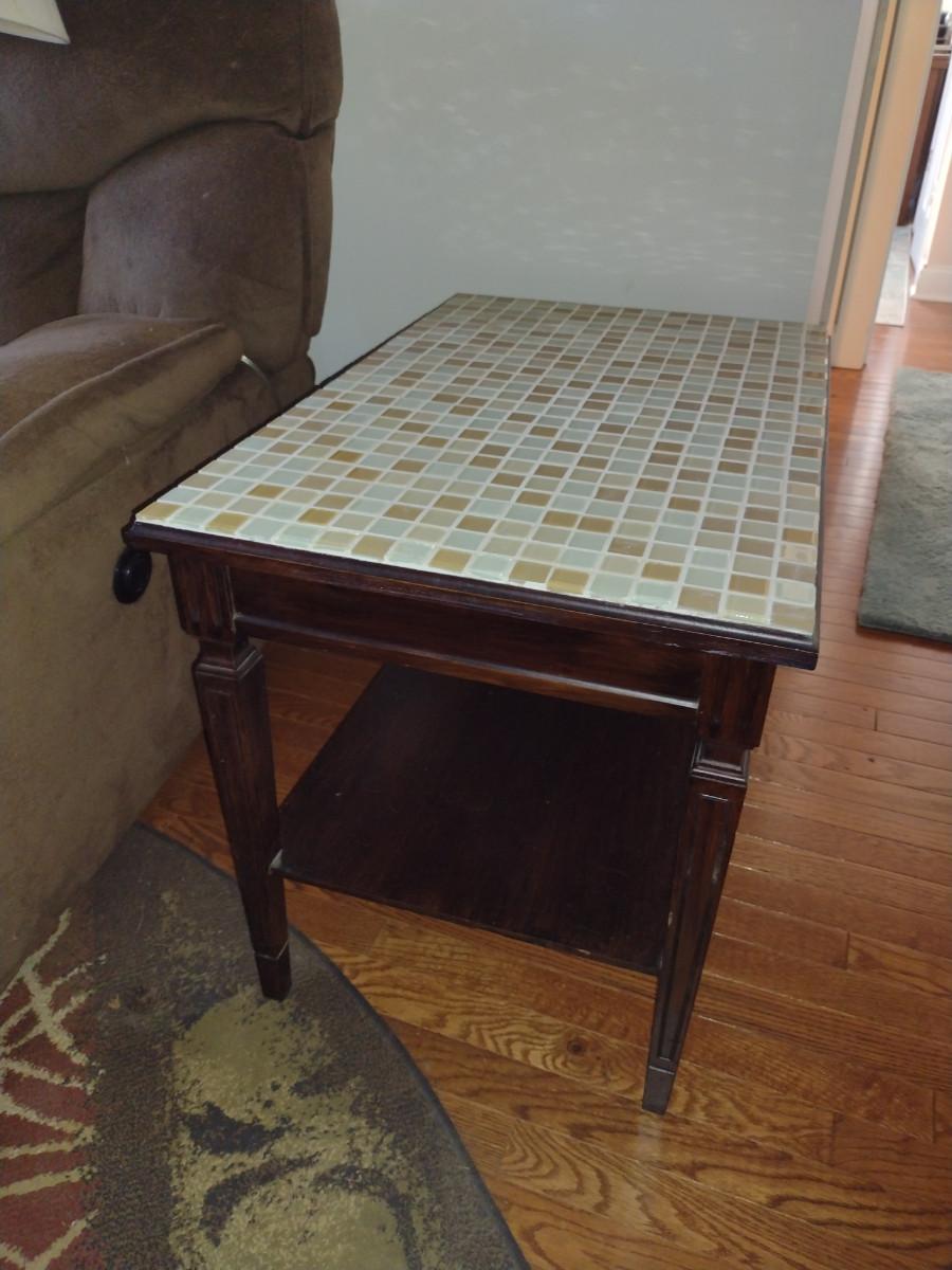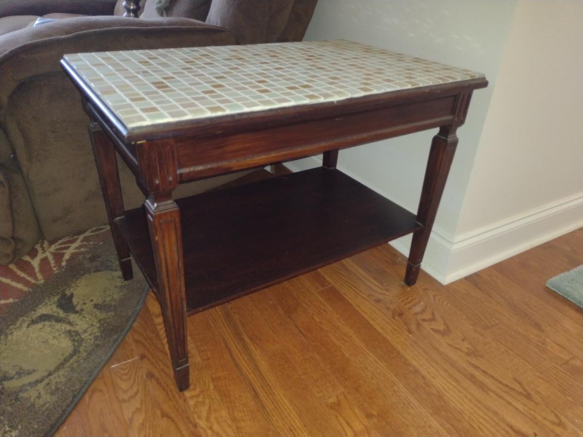 Wooden Frame, Tile Top Side Table with Stretcher Shelf (Choice A). Item is located upstairs- please bring assistance, if needed, for safe removal. Item measures approx 28 1/2" x 18 1/2" x 22 1/4" tall.