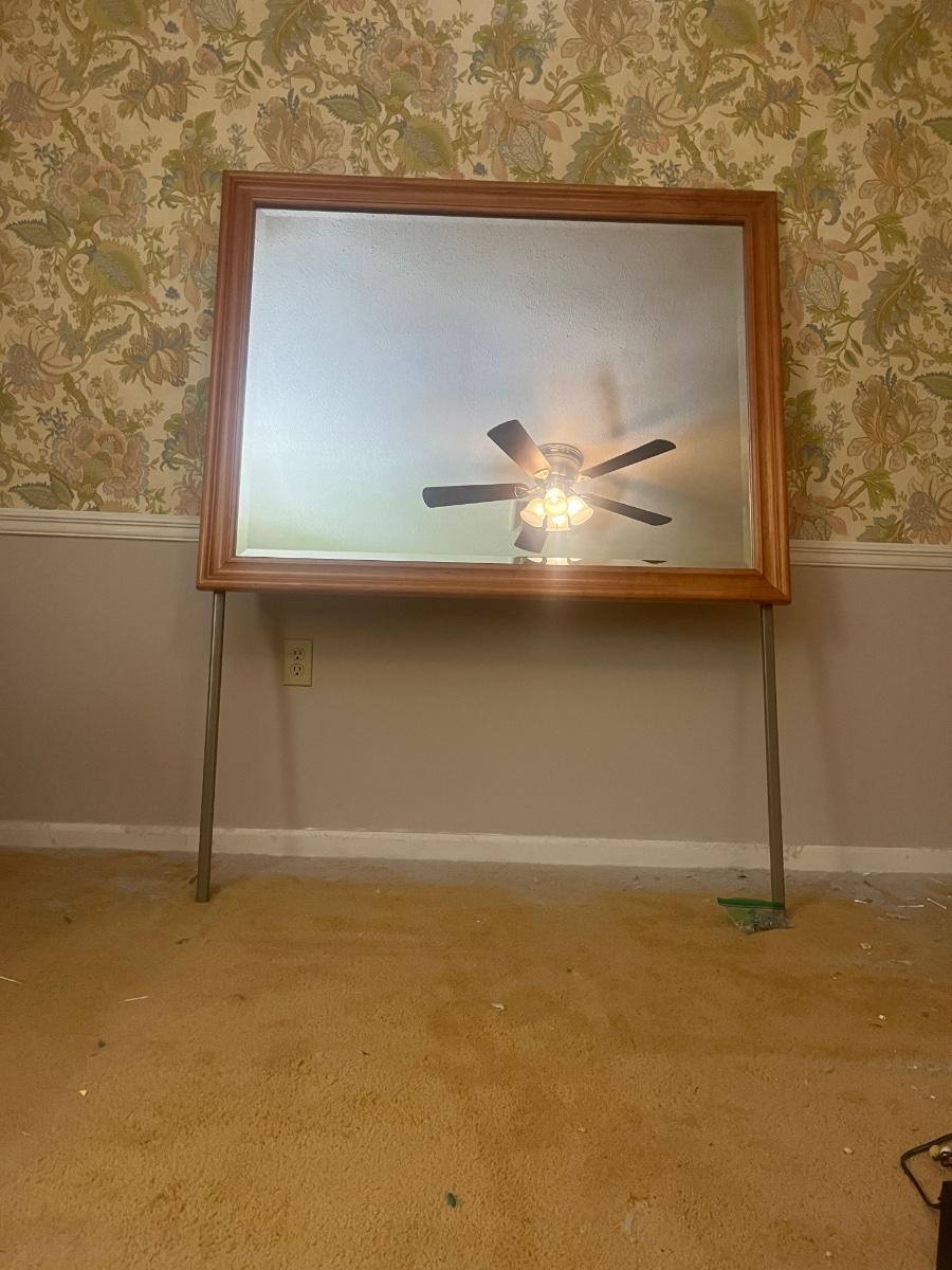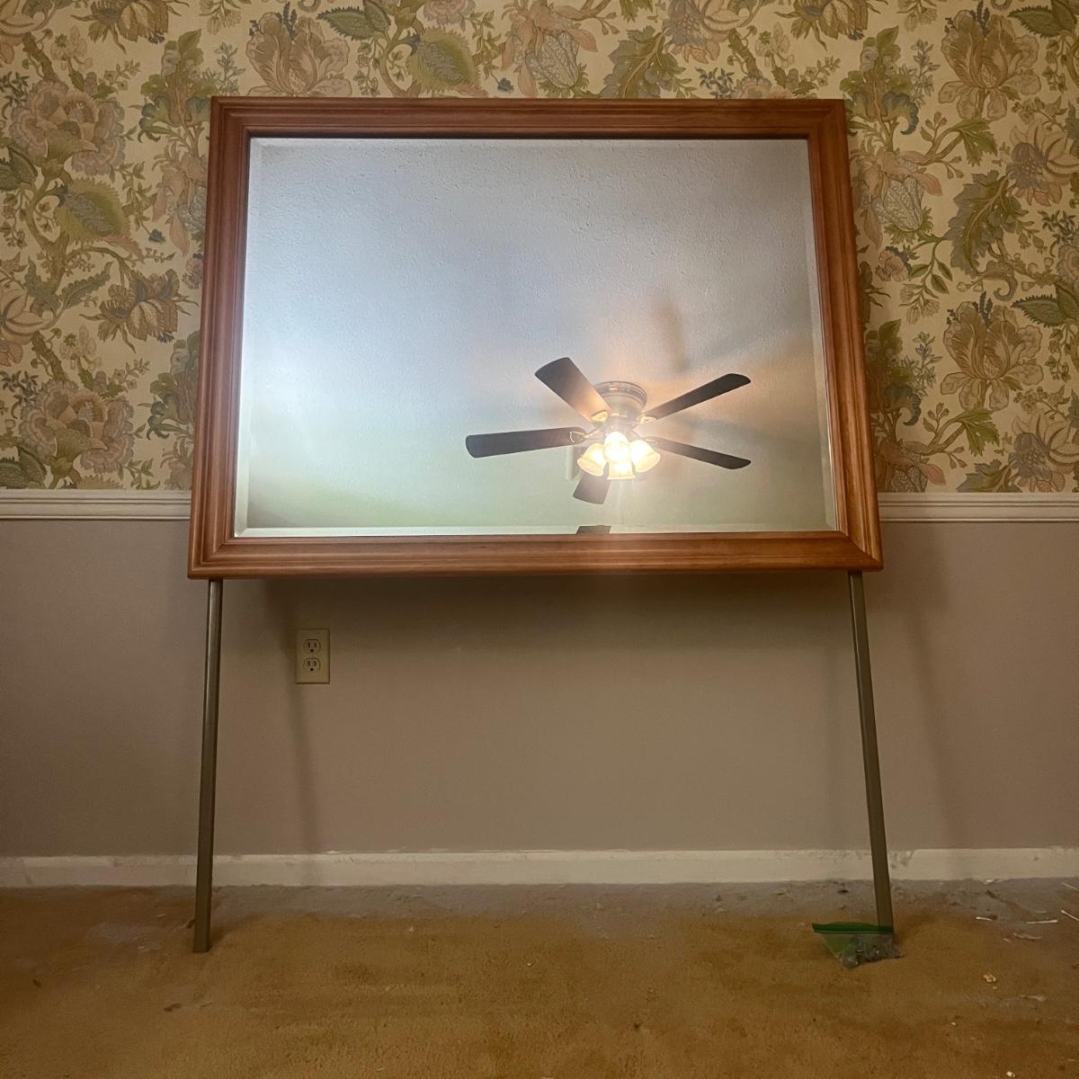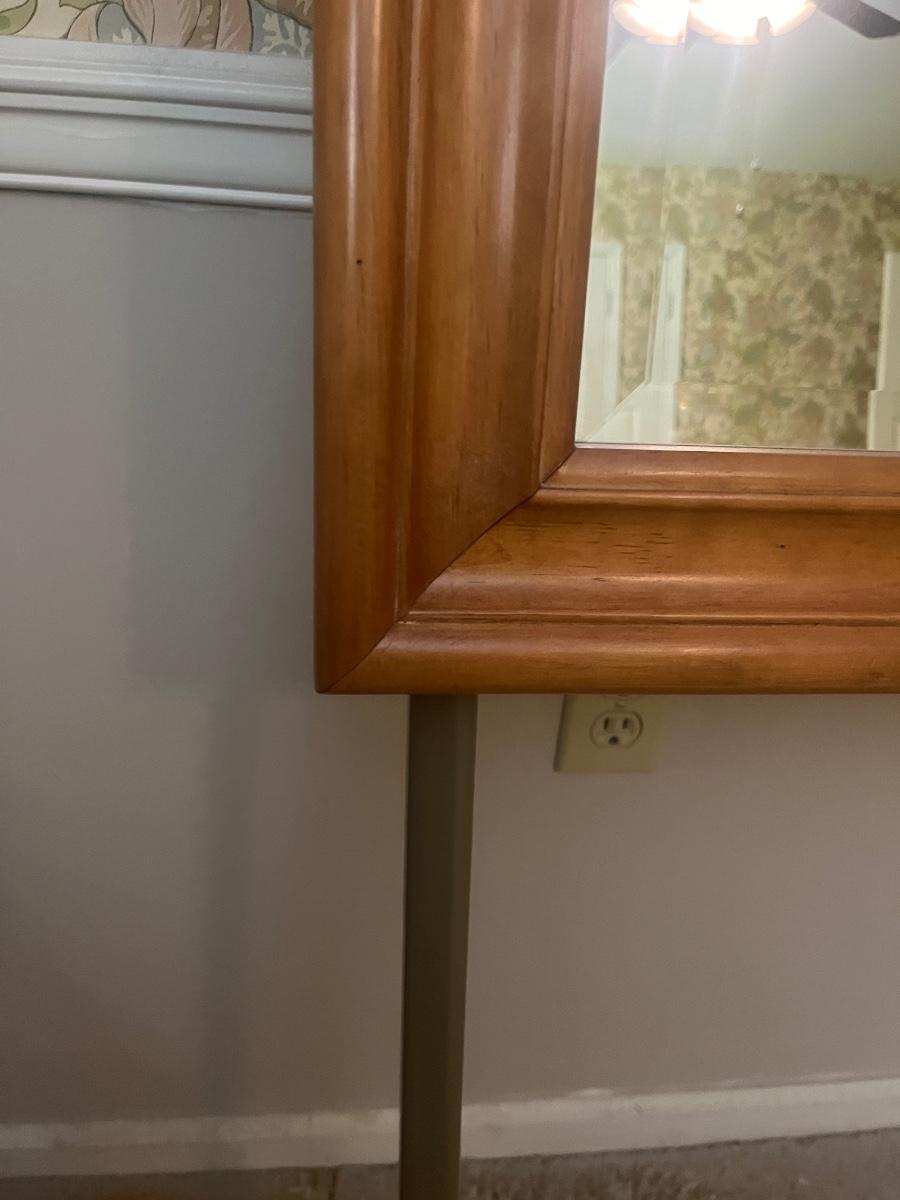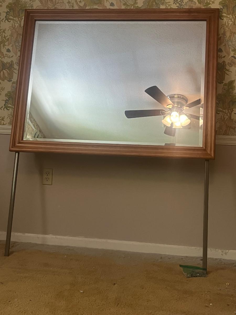 Lot includes a large wooden framed beveled mirror. Frame measures 51” x 39”H with mounting poles extending 26” past bottom of mirror frame.