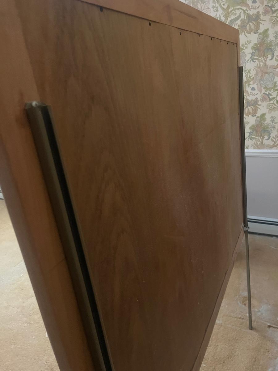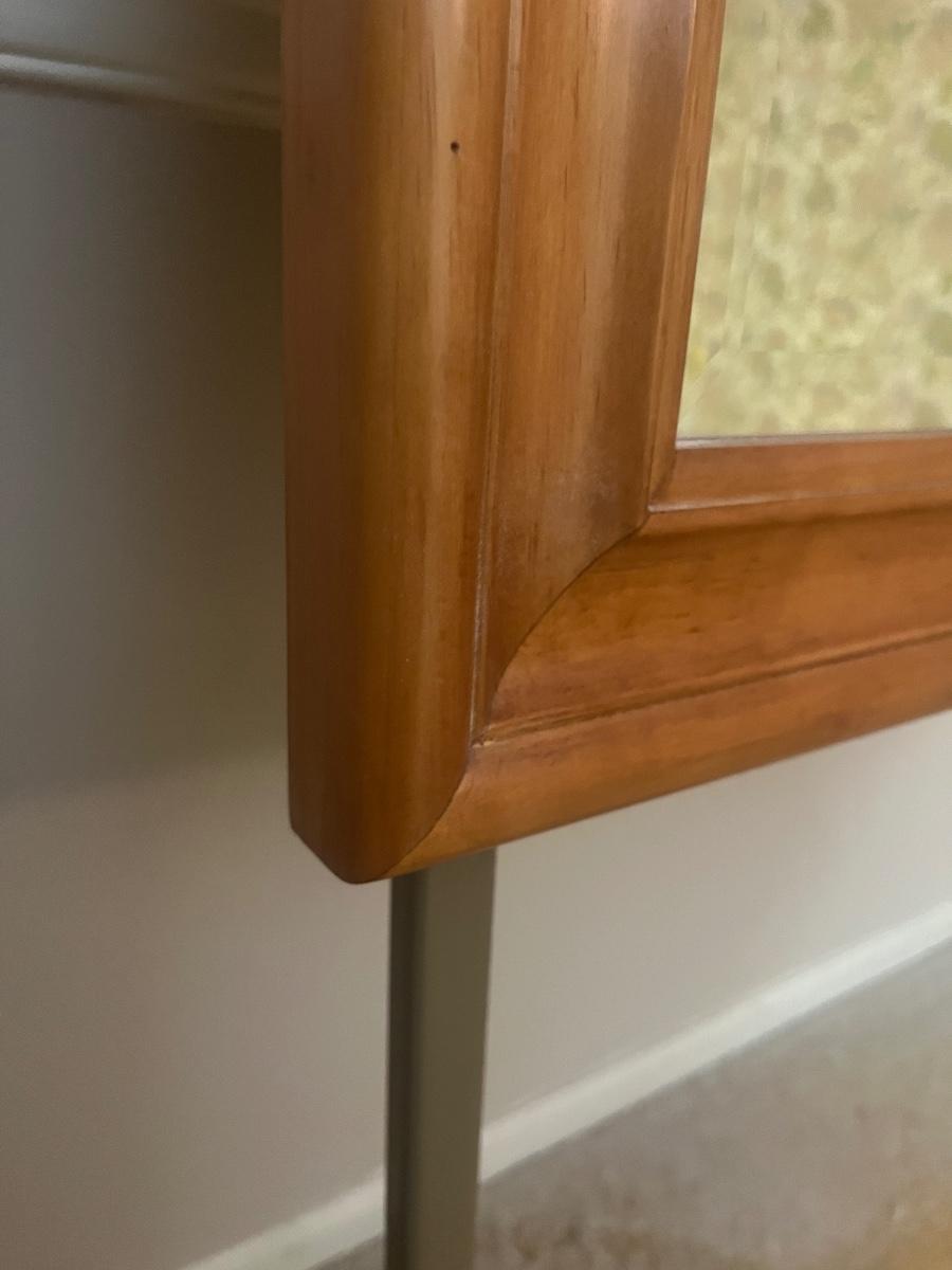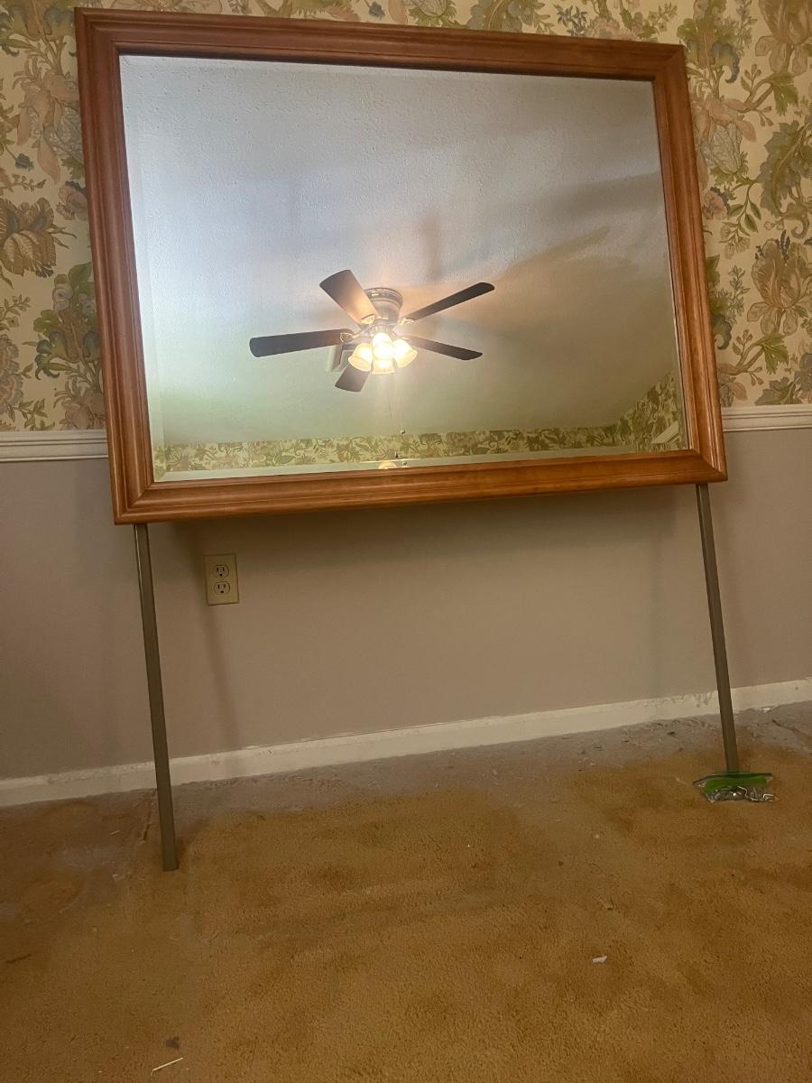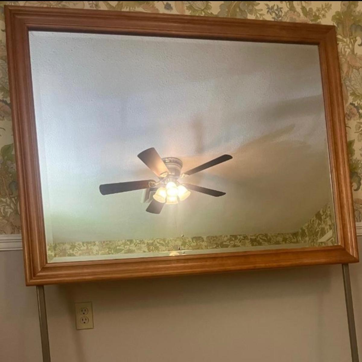 Lot includes a large wooden framed beveled mirror. Frame measures 51” x 39”H with mounting poles extending 26” past bottom of mirror frame.