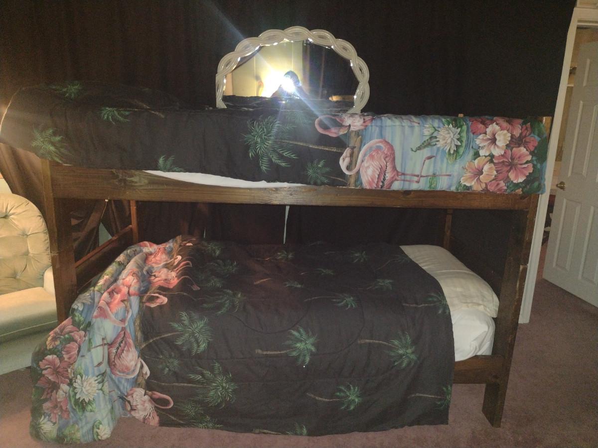 Wooden Framed Bunk Bed Set. Item measures approx 41" deep, 78" wide, 55 1/2" tall. No bedding included. Item is located in basement of home and will need to be carried up a flight of stairs. Item will need to be taken apart- please bring tools.