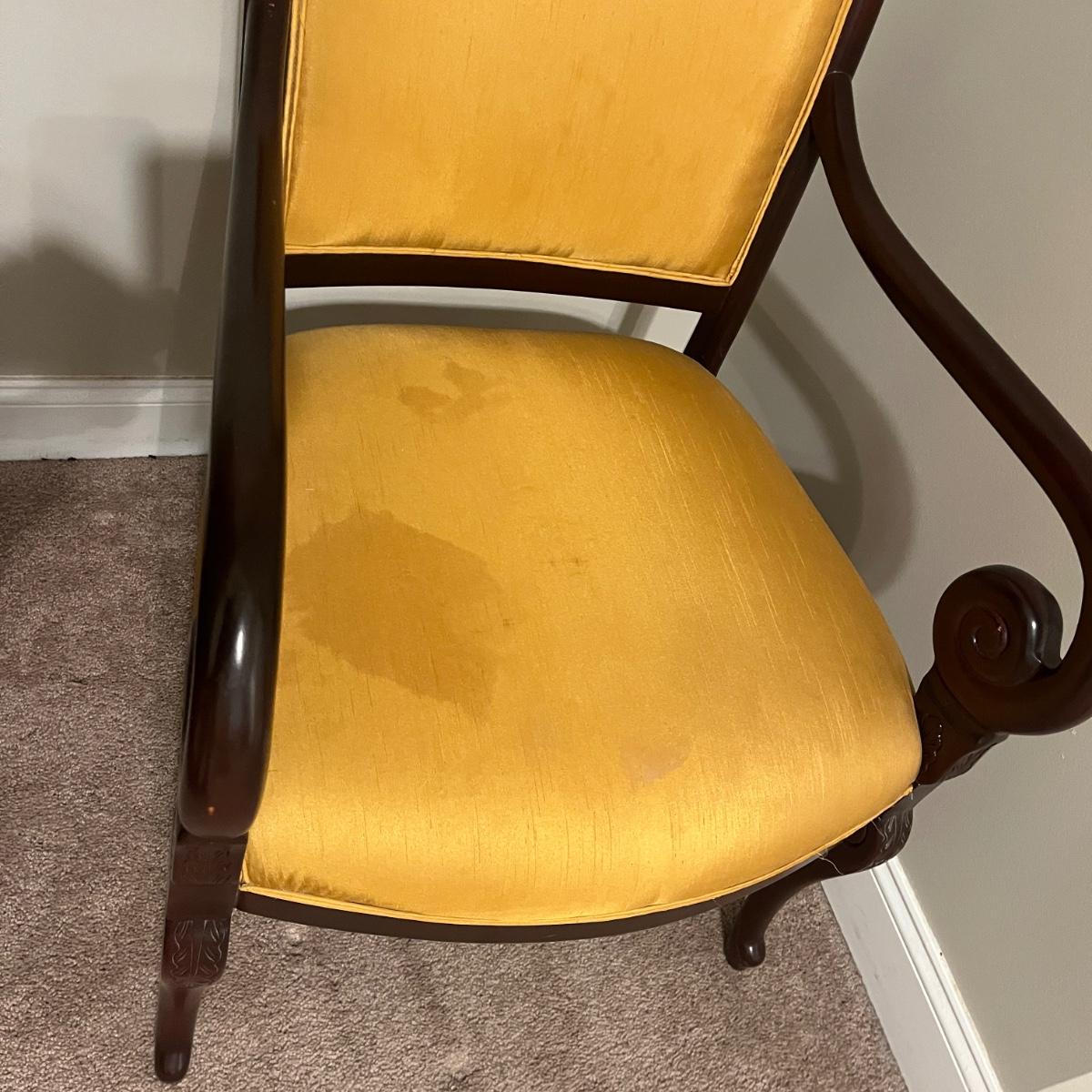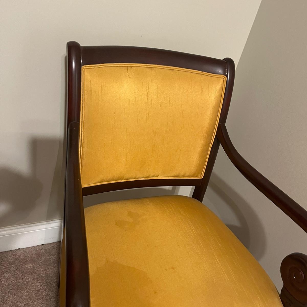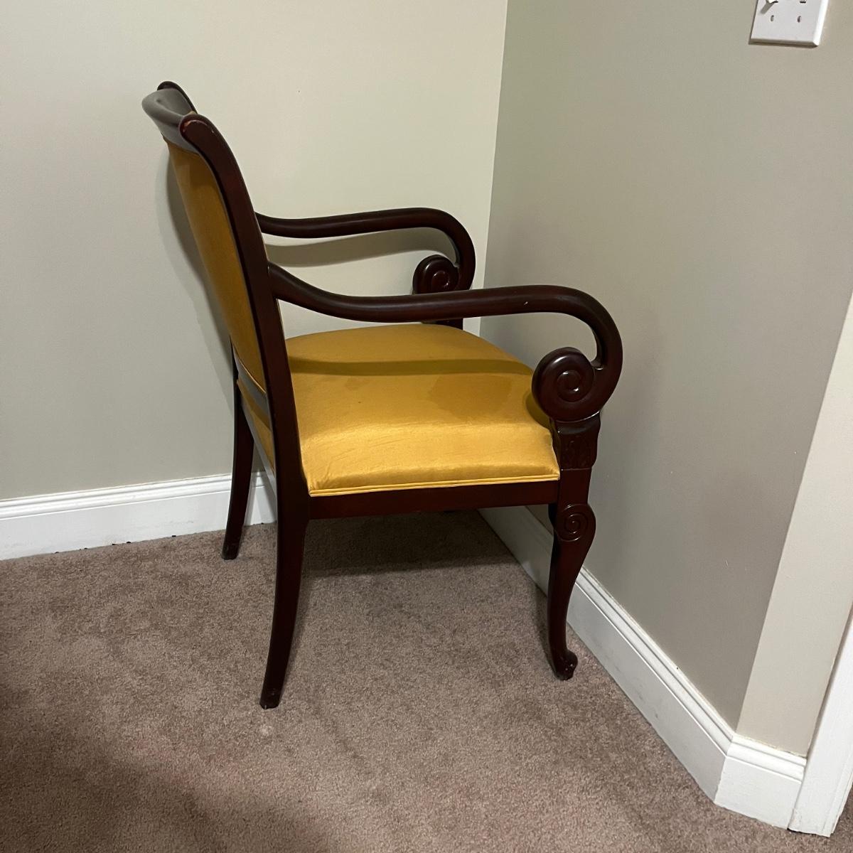 Lot includes a wooden framed arm chair with padded and upholstered back and seat. Chair measures 25” x 25” x 36”H with a 19” seat height. Fabric has stains, see pictures.