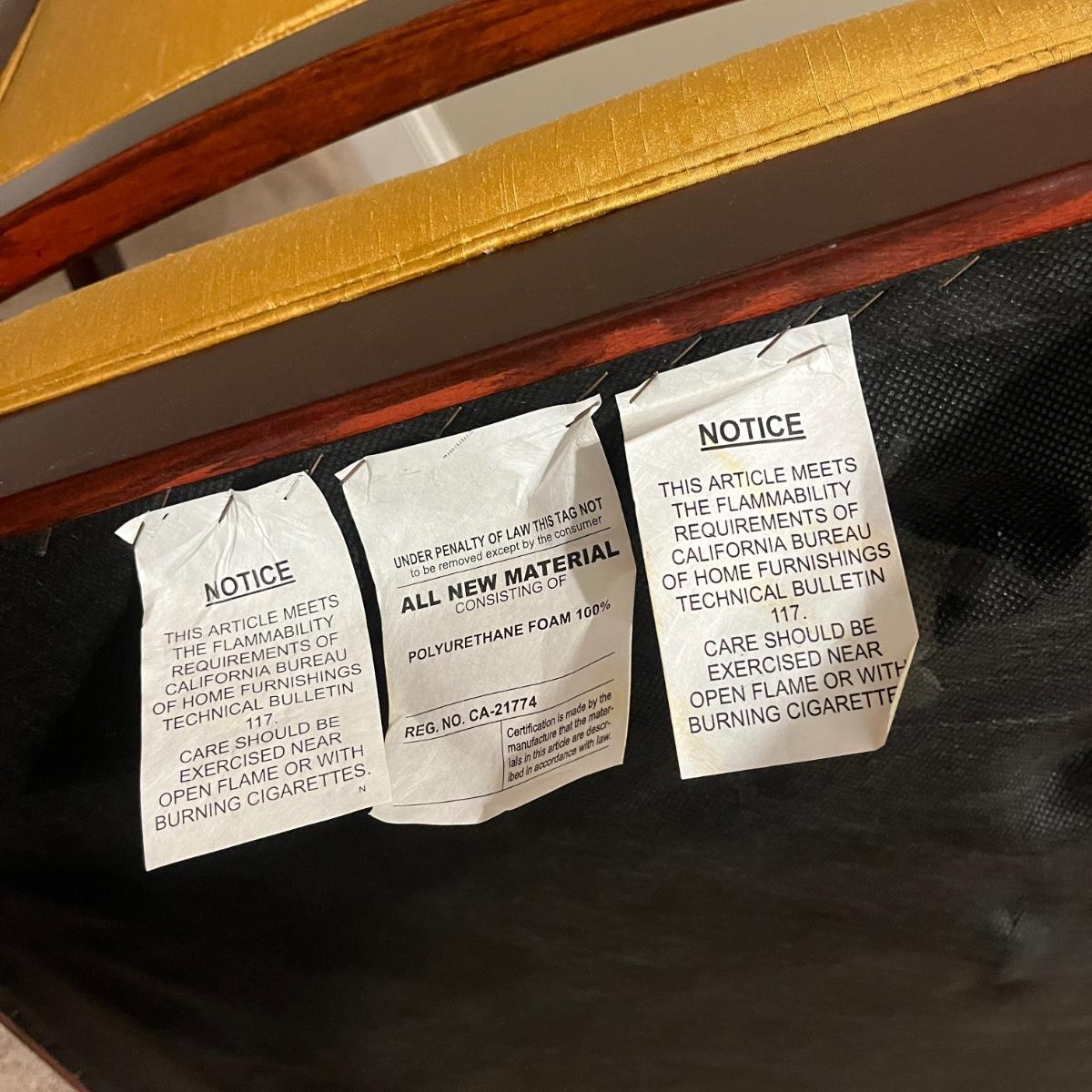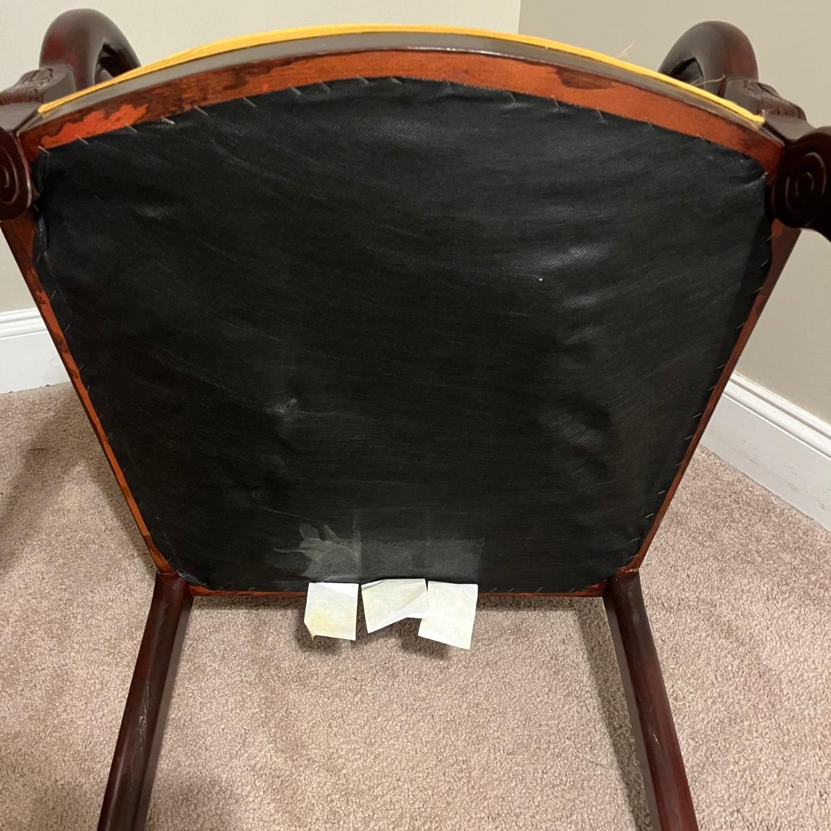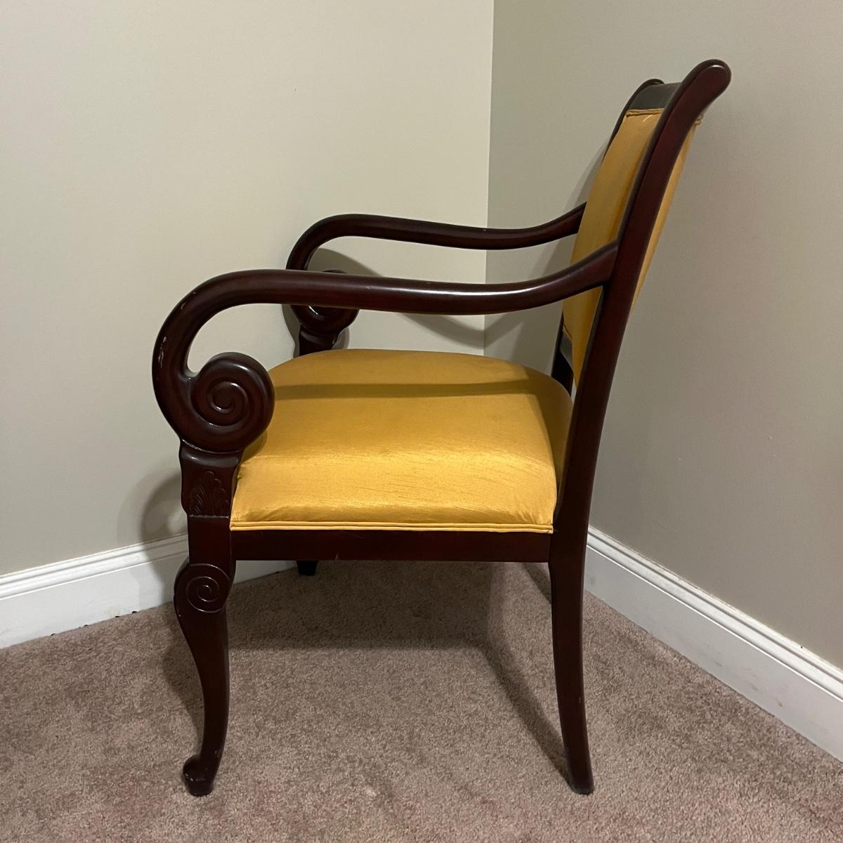 Lot includes a wooden framed arm chair with padded and upholstered back and seat. Chair measures 25” x 25” x 36”H with a 19” seat height. Fabric has stains, see pictures.