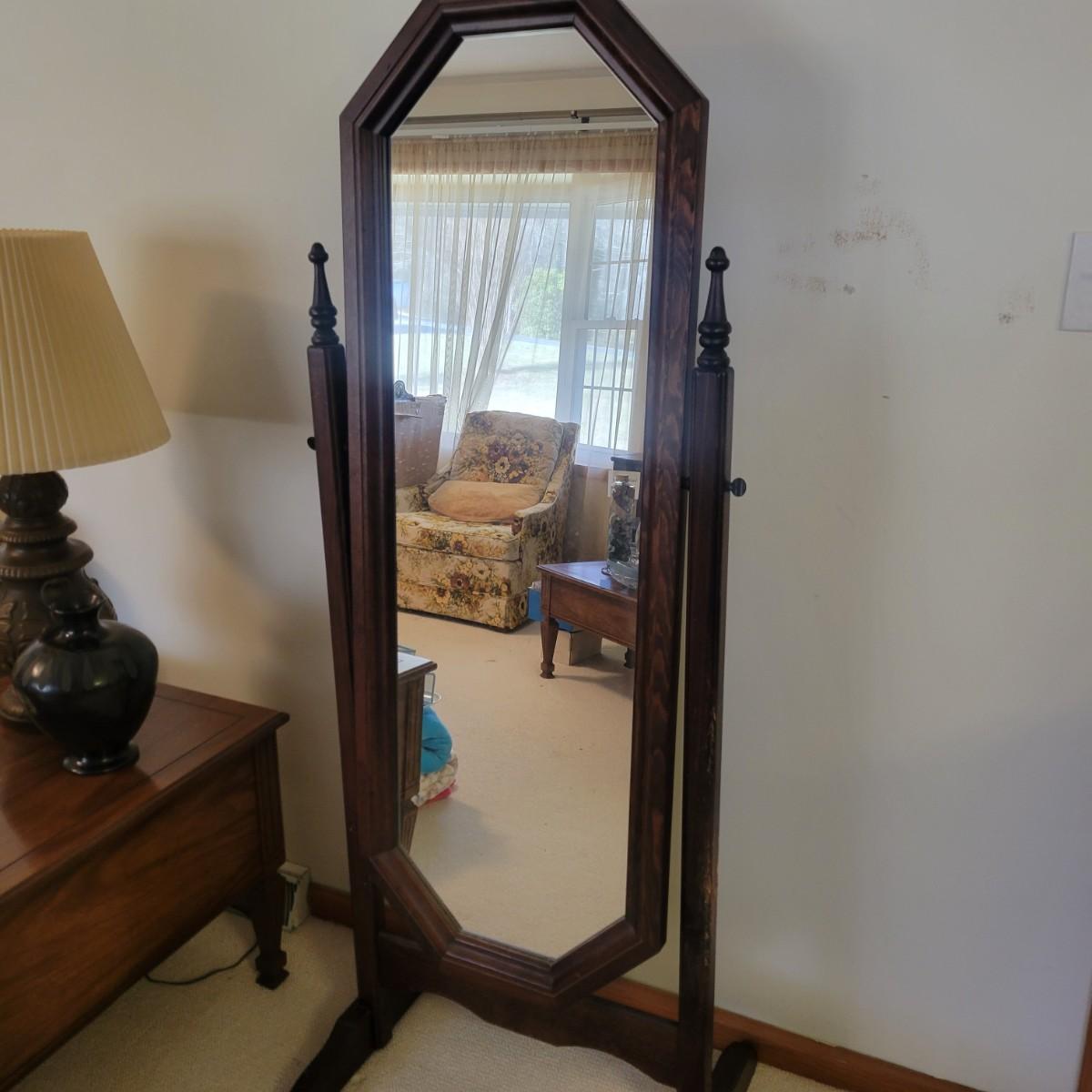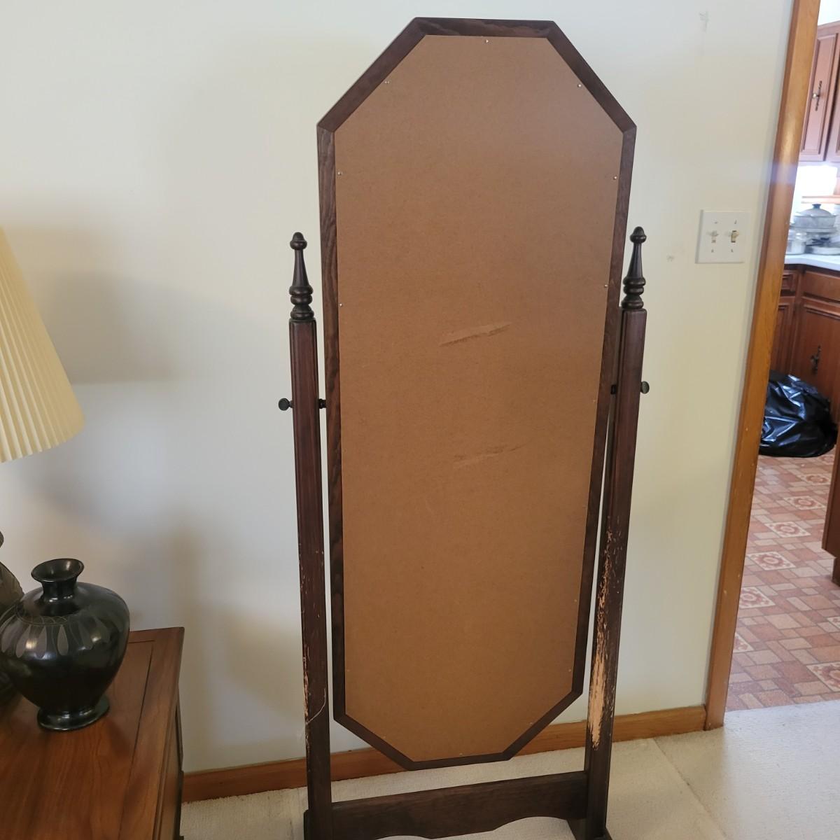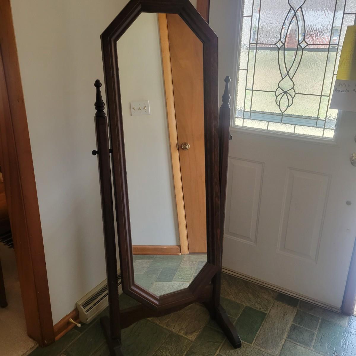 This swiveling mirror has a solid wood frame and stand with a dark wood stain. It measures approximately 24.5" x 18" x 63"H. It does have some notable scratches on the wood; please see photos.