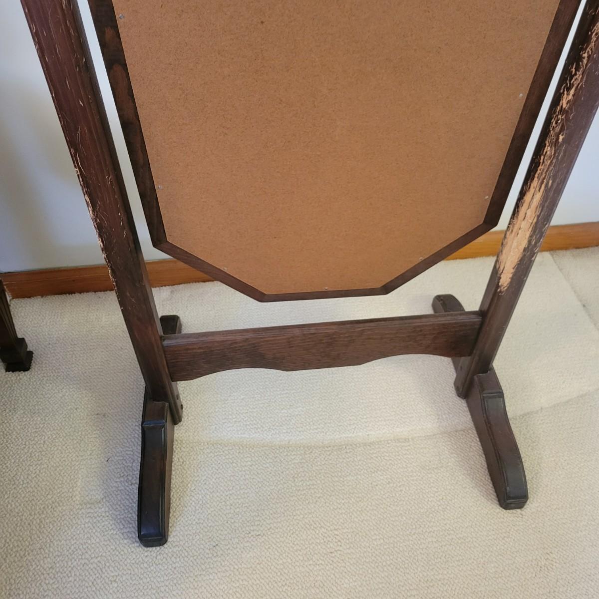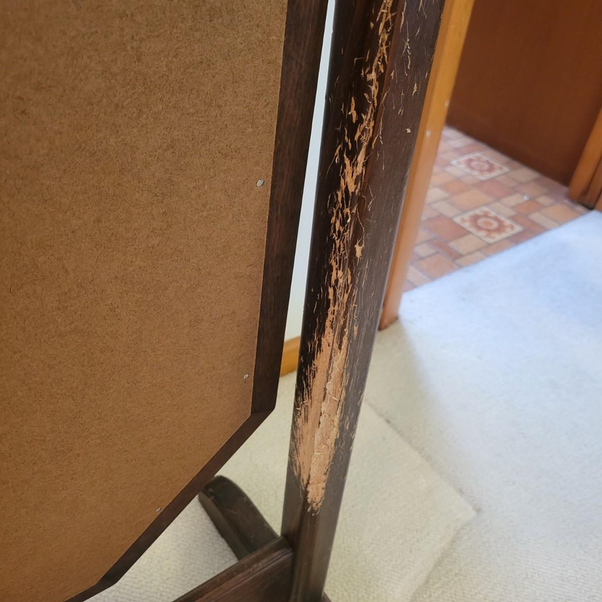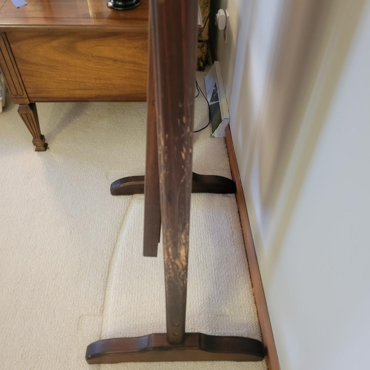 This swiveling mirror has a solid wood frame and stand with a dark wood stain. It measures approximately 24.5" x 18" x 63"H. It does have some notable scratches on the wood; please see photos.