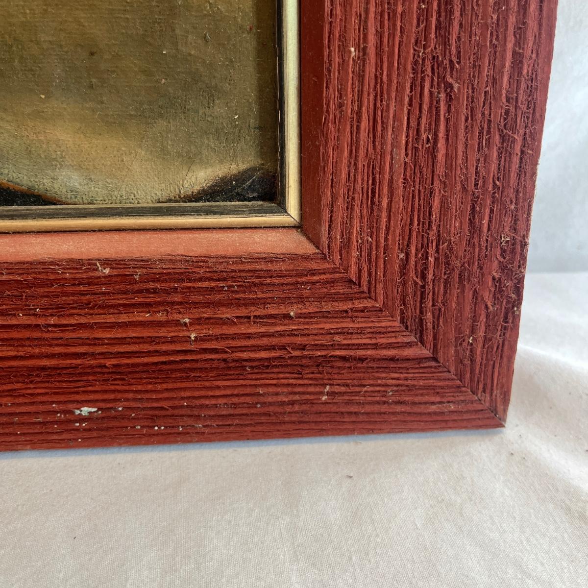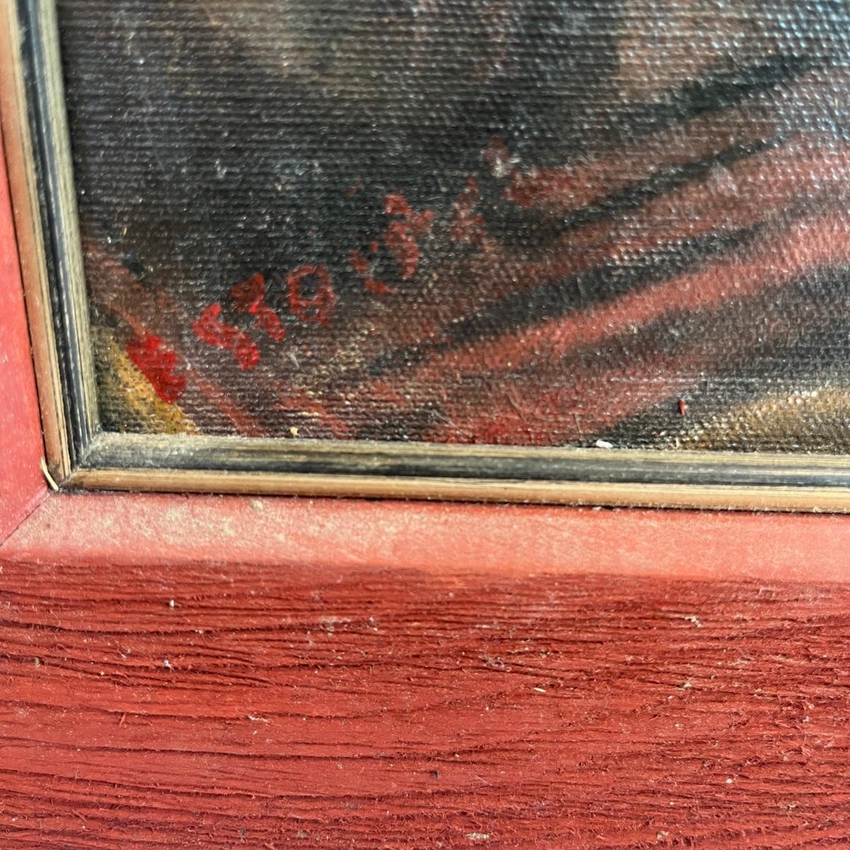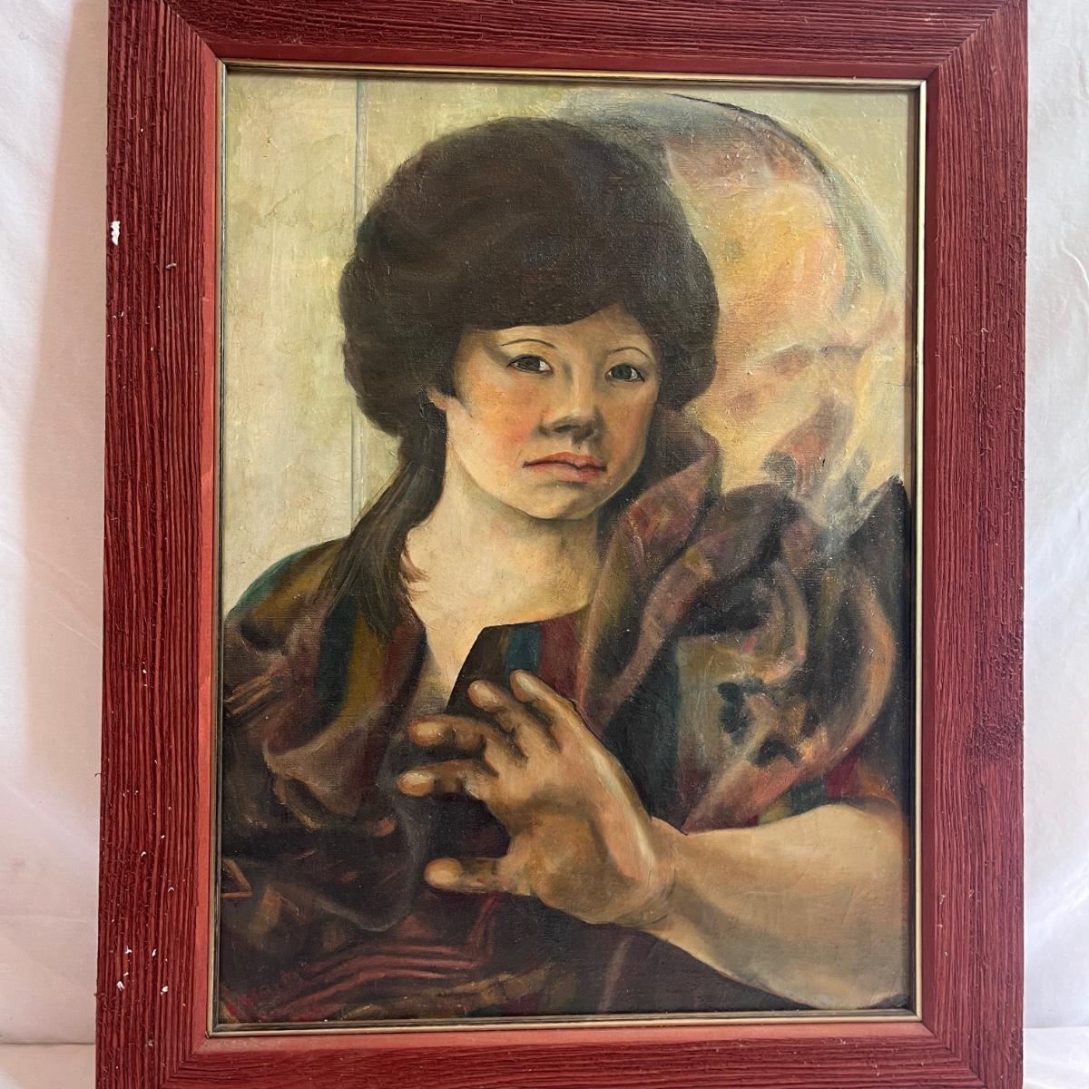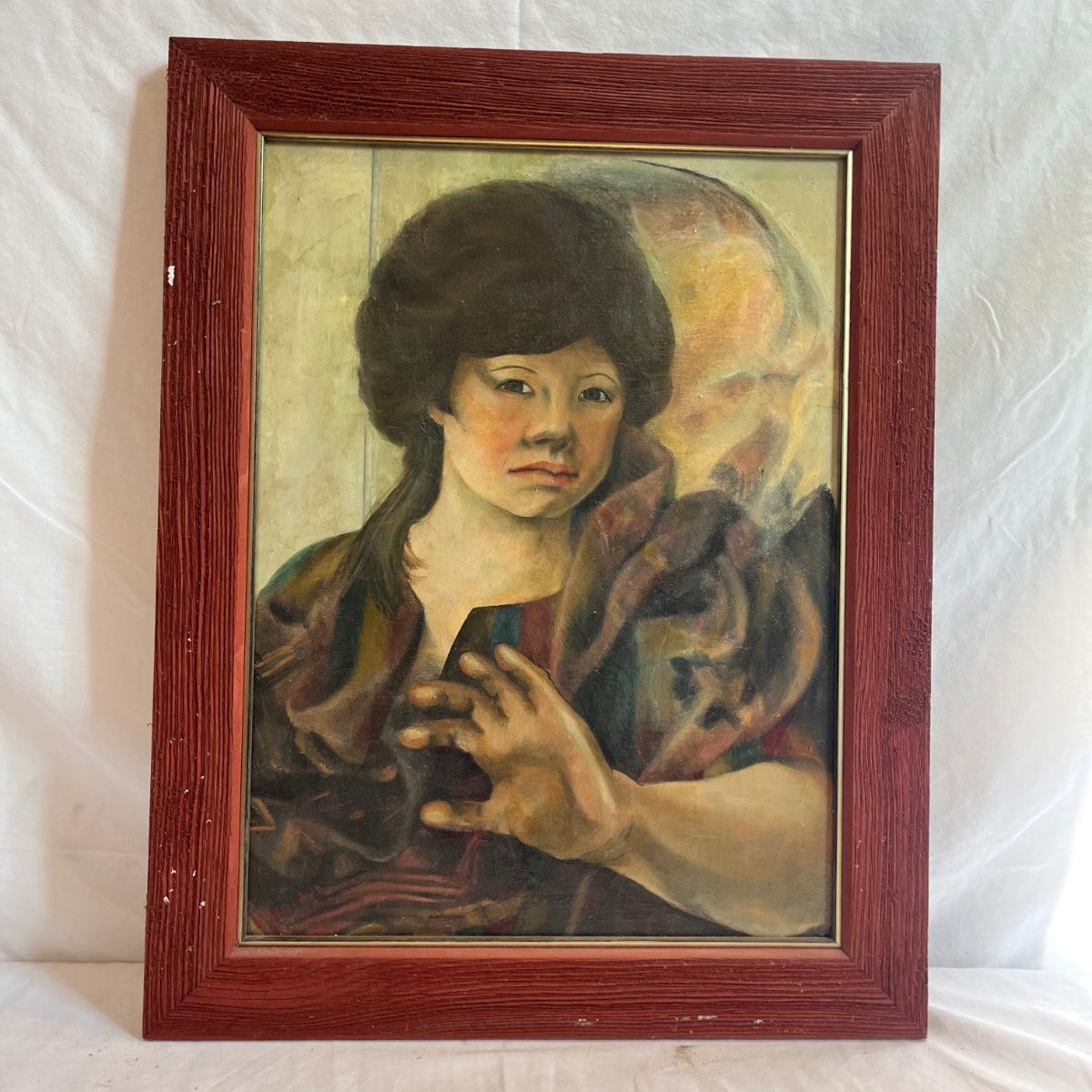 This wooden framed portrait appears to be an oil painting. Painting is signed but signature is illegible. Frame measures 22.5” x 28.5”H. It has water damage on back, see pictures.