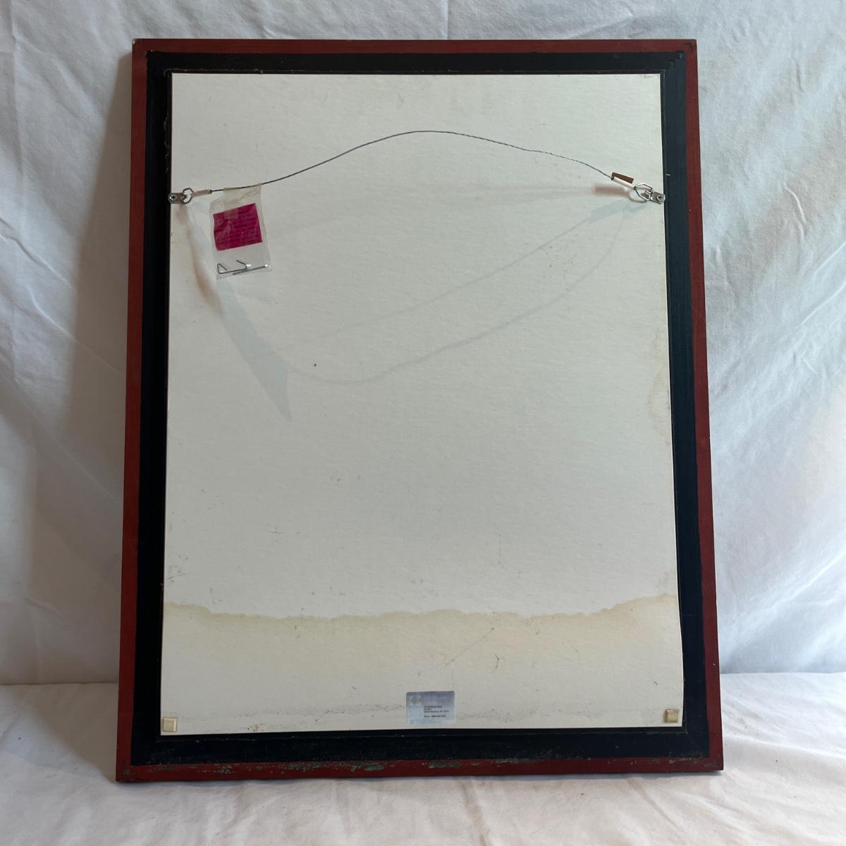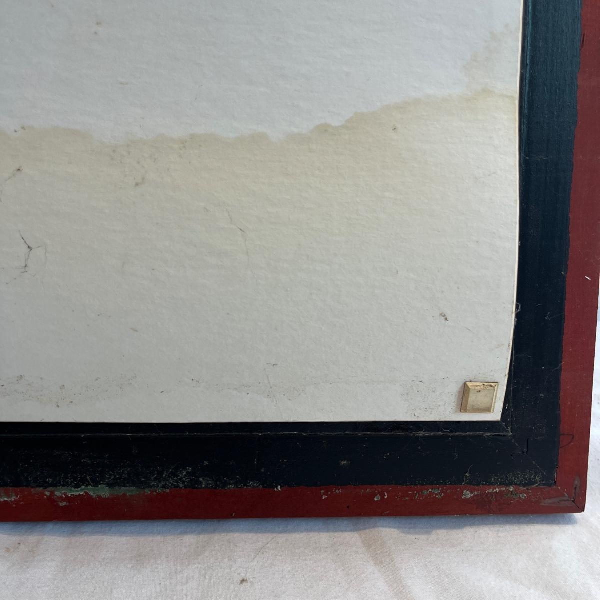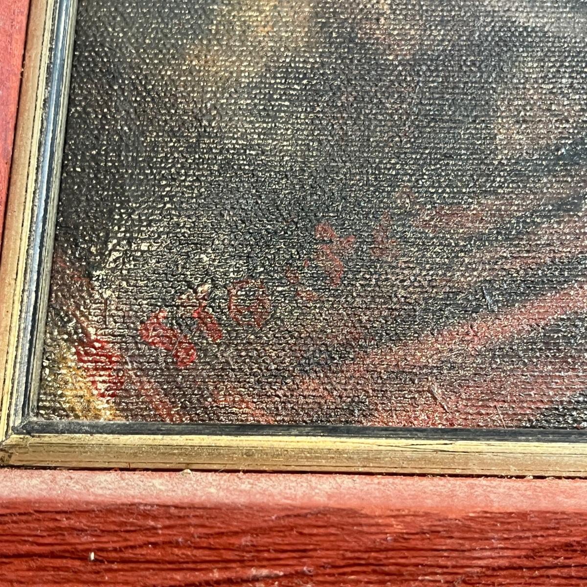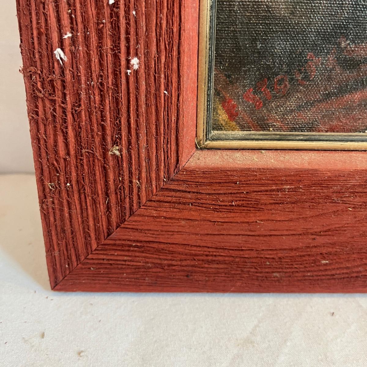 This wooden framed portrait appears to be an oil painting. Painting is signed but signature is illegible. Frame measures 22.5” x 28.5”H. It has water damage on back, see pictures.